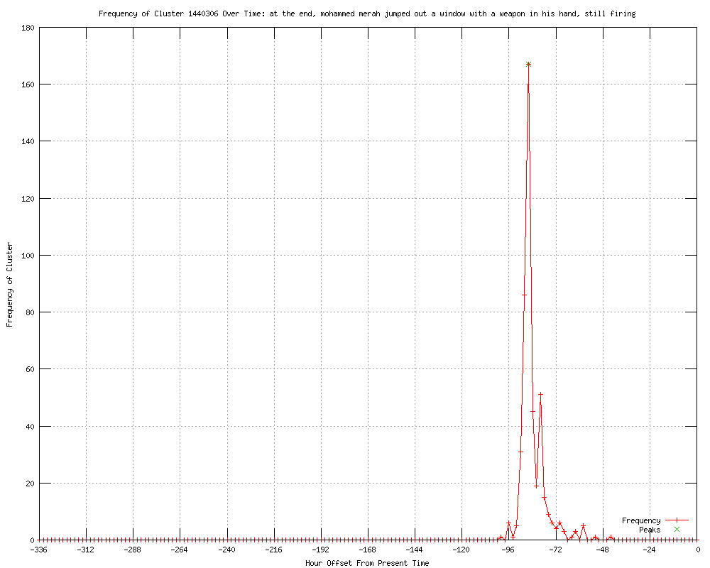 | 7 | at the end, mohammed merah jumped out a window with a weapon in his hand, still firing Urls http://ebz.by/info/US/321573671 http://algemeiner.com/2012/03/22/france-standoff-ends-with-death-of-mohammed-merah-killer-of-7/ http://aina.org/news/20120322152044.htm http://americanthinker.com/blog/2012/03/violent_end_to_french_standoff_with_muslim_murderer.html http://democraticunderground.com/101479830 http://progressivenewsdaily.com/?p=27802 http://newyorker.com/online/blogs/closeread/2012/03/everything-reminds-me-of-him-kandahar-sanford-toulouse.html |