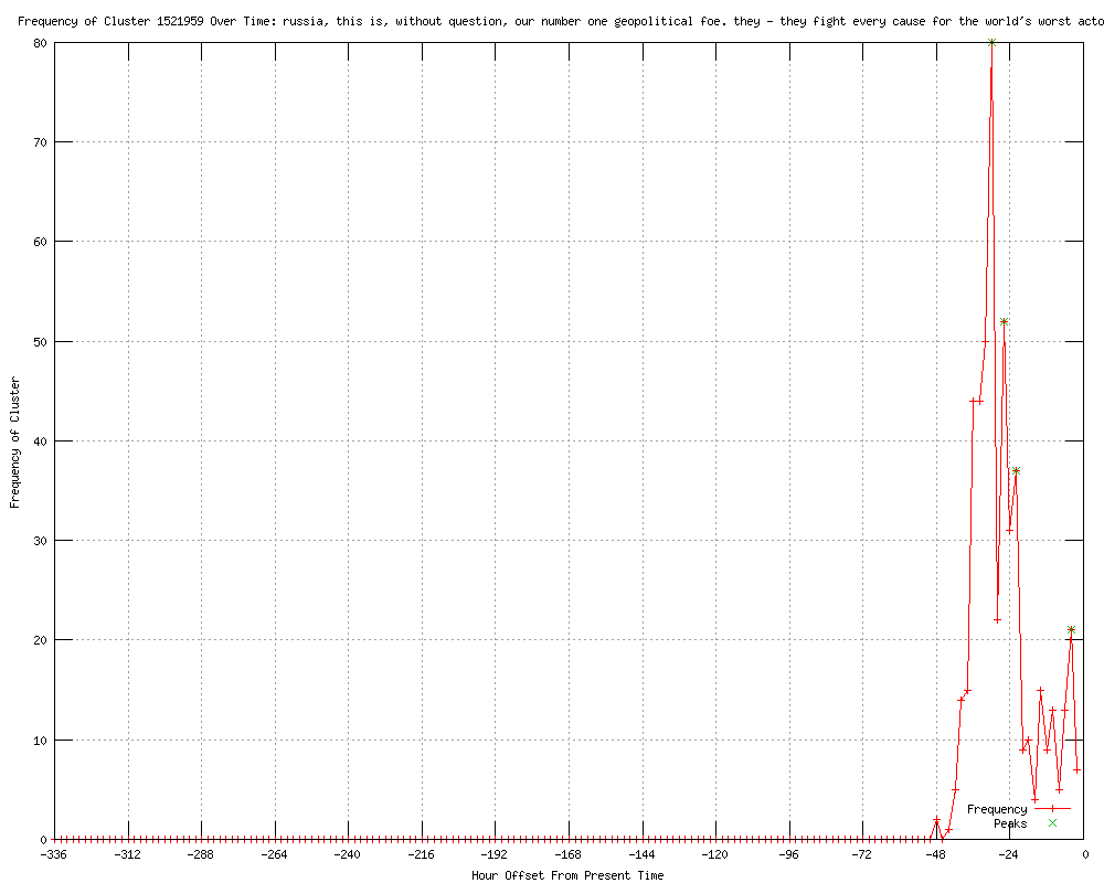 | 5 | russia, this is, without question, our number one geopolitical foe. they - they fight every cause for the world's worst actors Urls http://panorama.am/en/world/2012/03/27/romni/ http://english.pravda.ru/news/world/27-03-2012/120899-mitt_romney_russia-0/ http://williambowles.info/2012/03/27/syria-newslinks-25-27-march-2012-syrian-free-army-recruits-children/ http://nsnetwork.org/nsn-daily-update-let%e2%80%99s-get-geopolitical-32712/ http://nsnetwork.org/lets-get-geopolitical/ |