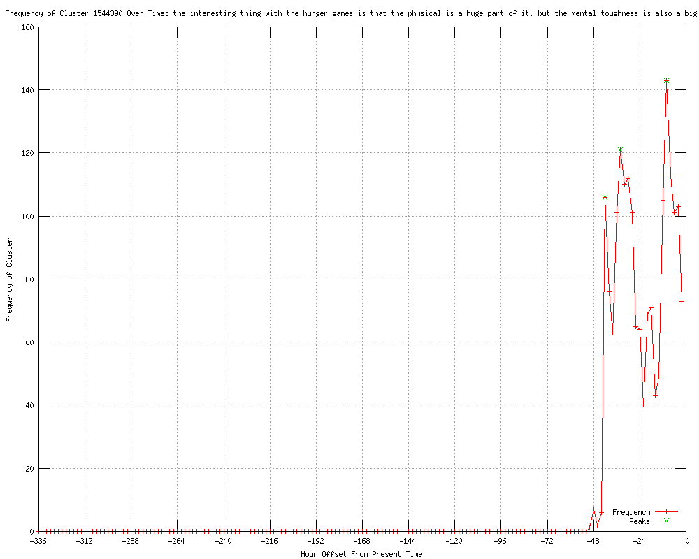 | 6 | the interesting thing with the hunger games is that the physical is a huge part of it, but the mental toughness is also a big part Urls http://parisstaronline.com/2012/03/28/hunger-games-inspires-tough-fitness-programs http://lfpress.com/life/healthandfitness/2012/03/28/19560461.html http://delhinewsrecord.com/2012/03/28/hunger-games-inspires-tough-fitness-programs http://lifewise.canoe.ca/Living/2012/03/28/19560431.html?cid=rsslifestyle http://saultthisweek.com/ArticleDisplay.aspx?e=3517251 http://calgarysun.com/2012/03/28/hunger-games-inspires-tough-fitness-programs |