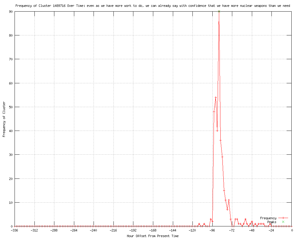 | 89 | we can already say with confidence that we have more nuclear weapons than we need Urls http://reuters.com/article/2012/03/26/us-nuclear-summit-idUSBRE82P01620120326 http://in.reuters.com/article/2012/03/26/nuclear-summit-idINDEE82P02620120326?feedType=RSS&feedName=topNews http://feeds.reuters.com/%7Er/Reuters/UKTopNews/%7E3/5ILbvw1GDM8/uk-nuclear-summit-idUKBRE82P01020120326 http://in.reuters.com/article/2012/03/26/nuclear-summit-idINDEE82P02620120326?feedType=RSS&feedName=worldNews http://my.news.yahoo.com/obama-vows-pursue-further-nuclear-cuts-russia-030832035.html http://wdbj7.com/sns-rt-us-nuclear-summitbre82p016-20120325,0,2398290.story http://moneycontrol.com/news/wire-news/obama-vows-to-pursue-further-nuclear-cutsrussia_685050.html http://chicagotribune.com/news/sns-rt-us-nuclear-summitbre82p016-20120325,0,7356071.story?track=rss http://au.news.yahoo.com/a/-/world/13264671/obama-vows-to-pursue-further-nuclear-cuts-with-russia/ http://zeenews.india.com/news/world/obama-vows-to-pursue-more-nuclear-cuts-with-russia_766146.html http://thehimalayantimes.com/rssReference.php?id=MzI1NTE4 http://kgmi.com/Obama-vows-to-pursue-further-nuclear-cuts-with-Rus/11461924?newsId=134185 http://chicagotribune.com/news/nationworld/sns-rt-us-nuclear-summitbre82p016-20120325,0,2842067.story?track=rss http://publicbroadcasting.net/wabe/news.newsmain/article/0/0/1915574/World/Obama.vows.to.pursue.further.nuclear.cuts.with.Russia http://au.news.yahoo.com/a/-/business/13264671/obama-vows-to-pursue-further-nuclear-cuts-with-russia/ http://au.news.yahoo.com/world/a/-/world/13264671/obama-vows-to-pursue-further-nuclear-cuts-with-russia/ http://publicbroadcasting.net/wkyu/news.newsmain/article/0/0/1915575/Top.Stories/Obama.vows.to.pursue.further.nuclear.cuts.with.Russia http://publicbroadcasting.net/wkyu/news.newsmain/article/0/0/1915574/World/Obama.vows.to.pursue.further.nuclear.cuts.with.Russia http://moneycontrol.com/news/world-news/obama-vows-to-pursue-further-nuclear-cutsrussia_685050.html http://publicbroadcasting.net/wuky/news.newsmain/article/0/0/1915574/World/Obama.vows.to.pursue.further.nuclear.cuts.with.Russia http://thestar.com.my.feedsportal.com/c/33048/f/534559/s/1dc75ea0/l/0Lthestar0N0Bmy0Cnews0Cstory0Basp0Dfile0F0C20A120C30C260Cworldupdates0C20A120E0A30E26T0A30A746Z0I40IBRE82P0A10A0IRTROPTT0I0A0IUK0ENUCLEAR0ESUMMIT0Gsec0FWorldupdates/story01.htm http://actualdot.com/2012/03/26/obama-vows-to-pursue-further-nuclear-cuts-with-russia/ http://wkzo.com/news/articles/2012/mar/26/obama-to-reaffirm-pledge-on-nuclear-arms-cuts/ http://wsbt.com/news/sns-rt-us-nuclear-summitbre82p016-20120325,0,3308928.story http://ibtimes.com/articles/319205/20120326/obama-nuclear-cuts-russia-summit.htm http://allnews.rss.themalaysianinsider.com/c/33362/f/567634/s/1dc7bbb9/l/0L0Sthemalaysianinsider0N0Cworld0Carticle0Cobama0Evows0Eto0Epursue0Efurther0Enuclear0Ecuts0Ewith0Erussia0C/story01.htm http://lfpress.com/news/world/2012/03/26/19548411.html http://irishtimes.com/newspaper/breaking/2012/0326/breaking1.html http://cnbc.com//id/46852572 http://da.feedsportal.com/c/851/f/10838/s/1dc7f0ad/l/0L0Sirishtimes0N0Cnewspaper0Cbreaking0C20A120C0A3260Cbreaking10Bhtm/ia1.htm http://thestar.com.my.feedsportal.com/c/33048/f/534559/s/1dc7e0e1/l/0Lthestar0N0Bmy0Cnews0Cstory0Basp0Dfile0F0C20A120C30C260Cworldupdates0C20A120E0A30E26T0A43929Z0I50IBRE82P0A10A0IRTROPTT0I0A0IUK0ENUCLEAR0ESUMMIT0Gsec0FWorldupdates/story01.htm http://kyivpost.com/news/russia/detail/124915/ http://telegraph.feedsportal.com/c/32726/f/568464/s/1dc82bc7/l/0L0Stelegraph0O0Cnews0Cworldnews0Cbarackobama0C91664840CBarack0EObama0Epushes0Efor0Eworld0Ewithout0Enuclear0Eweapons0Bhtml/story01.htm http://cnews.canoe.ca/CNEWS/World/2012/03/26/19548381.html?cid=rssnews http://fin24.com/Economy/Obama-vows-to-pursue-more-nuclear-cuts-20120326 http://thestar.com.my.feedsportal.com/c/33048/f/534559/s/1dc80ae8/l/0Lthestar0N0Bmy0Cnews0Cstory0Basp0Dfile0F0C20A120C30C260Cworldupdates0C20A120E0A30E26T0A54336Z0I60IBRE82P0A10A0IRTROPTT0I0A0IUK0ENUCLEAR0ESUMMIT0Gsec0FWorldupdates/story01.htm http://msnbc.msn.com/id/46851853 http://telegraph.co.uk/news/worldnews/barackobama/9166484/Barack-Obama-pushes-for-world-without-nuclear-weapons.html http://telegraph.feedsportal.com/c/32726/f/579330/s/1dc821ae/l/0L0Stelegraph0O0Cnews0Cworldnews0Cbarackobama0C91664840CBarack0EObama0Epushes0Efor0Eworld0Ewithout0Enuclear0Eweapons0Bhtml/story01.htm http://independent.ie/world-news/asia-pacific/barack-obama-pushes-for-world-without-nuclear-weapons-3061037.html http://telegraph.feedsportal.com/c/32726/f/564430/s/1dc81fe4/l/0L0Stelegraph0O0Cnews0Cworldnews0Cbarackobama0C91664840CBarack0EObama0Epushes0Efor0Eworld0Ewithout0Enuclear0Eweapons0Bhtml/story01.htm http://spaceports.blogspot.com/2012/03/obama-seeks-global-nuclear-missile.html http://engfootball.com/us-reducing-arsenal-wont-harm-security-obama/ http://engfootball.com/obama-says-us-reducing-nuclear-arsenal-wont-harm-security/ http://bloomberg.com/news/2012-03-26/obama-says-u-s-reducing-nuclear-arms-won-t-endanger-security.html http://ibnlive.in.com/news/obama-to-pursue-further-nuclear-cuts-with-russia/242703-2.html http://stuff.co.nz/timaru-herald/world/6640972/Obama-vows-to-pursue-nuclear-cuts http://stuff.co.nz/world/americas/6640972/Obama-vows-to-pursue-nuclear-cuts http://panarmenian.net/eng/news/100296/ http://wtkr.com/news/nationworld/sns-rt-us-nuclear-summitbre82p016-20120325,0,5745219.story http://da.feedsportal.com/c/32158/f/414204/s/1dc8c045/l/0L0Sitn0O0Cworld0C419270CObama0Kcalls0Kfor0Knuclear0Kcuts/ia1.htm http://reuters.com/article/2012/03/26/us-nuclear-summit-idUSBRE82P01620120326?feedType=RSS&feedName=worldNews&utm_source=feedburner&utm_medium=feed&utm_campaign=Feed%3A+reuters%2FworldNews+%28News+%2F+US+%2F+International%29 http://indiatalkies.com/2012/03/obama-seek-nuke-arms-reductions-russia.html http://feeds.reuters.com/~r/reuters/worldNews/~3/lzgWEmHYVx0/us-nuclear-summit-idUSBRE82P01620120326 http://odt.co.nz/news/world/2029