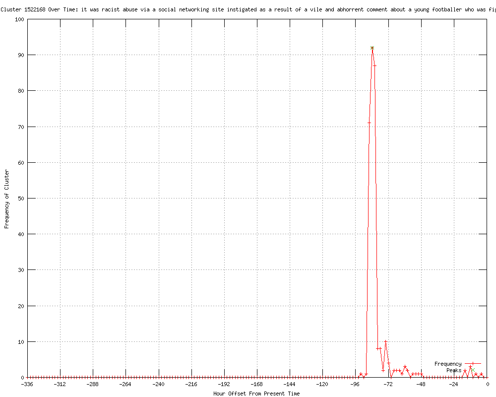 | 14 | it was racist abuse via a social networking site instigated as a result of a vile and abhorrent comment about a young footballer who was fighting for his life Urls http://jailhouselawyersblog.blogspot.com/2012/03/student-jailed-for-racist-fabrice.html http://feeds.guardian.co.uk/%7Er/theguardian/media/rss/%7E3/Q96XaH_hOsg/student-jailed-fabrice-muamba-tweets http://ebz.by/info/UK/322444313 http://theoriginalwinger.com/2012-03-27-liam-stacey-21-jail-56-days-fabrice-muamba-twitter-comments http://mediabistro.com/alltwitter/fabrice-muamba-student-jailed_b19985 http://twittermania.nl/2012/03/racistische-twitteraar-veroordeeld-tot-gevangenisstraf/ http://findata.co.nz/News/15101557/Man_jailed_for_racist_tweets_on_footballer.htm http://thenextweb.com/uk/2012/03/27/racist-twitter-user-jailed-for-56-days-over-abusive-updates-about-footballer-fabrice-muamba/ http://thenextweb.com/uk/2012/03/27/racist-twitter-user-jailed-for-56-days-over-abusive-updates-about-footballer-fabrice-muamba/?utm_source=feedburner&utm_medium=feed&utm_campaign=Feed%3A+TheNextWeb+%28The+Next+Web+All+Stories%29 http://thaindian.com/newsportal/sports/student-jailed-for-offensive-muamba-tweets_100607597.html http://indiatalkies.com/2012/03/student-jailed-offensive-muamba-tweets.html http://anglofille.com/2012/03/27/the-twitter-police/ http://zeenews.india.com/sports/others/student-jailed-for-offensive-muamba-tweets_740009.html http://siasat.com/english/news/student-jailed-offensive-muamba-tweetst |