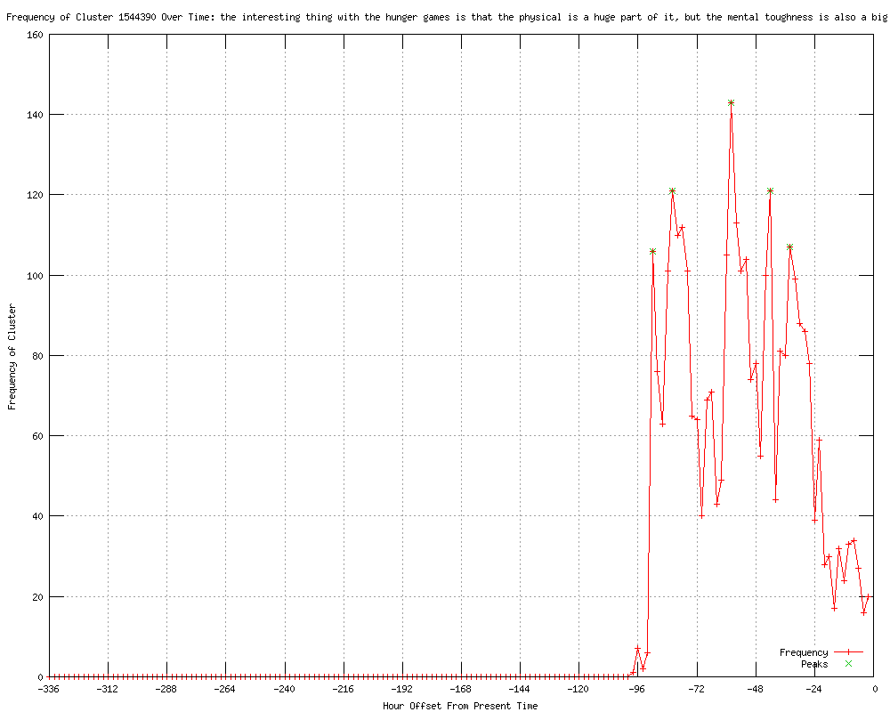 | 6 | the interesting thing with the hunger games is that the physical is a huge part of it, but the mental toughness is also a big part Urls http://parisstaronline.com/2012/03/28/hunger-games-inspires-tough-fitness-programs http://lfpress.com/life/healthandfitness/2012/03/28/19560461.html http://delhinewsrecord.com/2012/03/28/hunger-games-inspires-tough-fitness-programs http://lifewise.canoe.ca/Living/2012/03/28/19560431.html?cid=rsslifestyle http://saultthisweek.com/ArticleDisplay.aspx?e=3517251 http://calgarysun.com/2012/03/28/hunger-games-inspires-tough-fitness-programs |