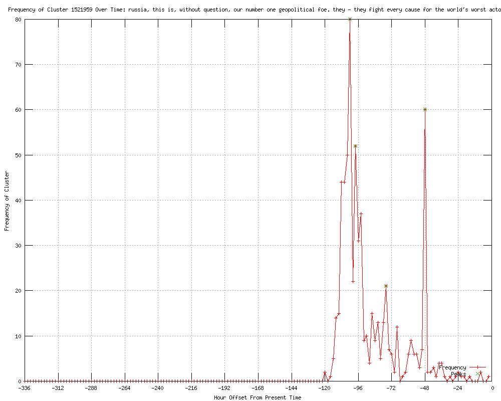 | 5 | russia, this is, without question, our number one geopolitical foe. they - they fight every cause for the world's worst actors Urls http://panorama.am/en/world/2012/03/27/romni/ http://english.pravda.ru/news/world/27-03-2012/120899-mitt_romney_russia-0/ http://williambowles.info/2012/03/27/syria-newslinks-25-27-march-2012-syrian-free-army-recruits-children/ http://nsnetwork.org/nsn-daily-update-let%e2%80%99s-get-geopolitical-32712/ http://nsnetwork.org/lets-get-geopolitical/ |