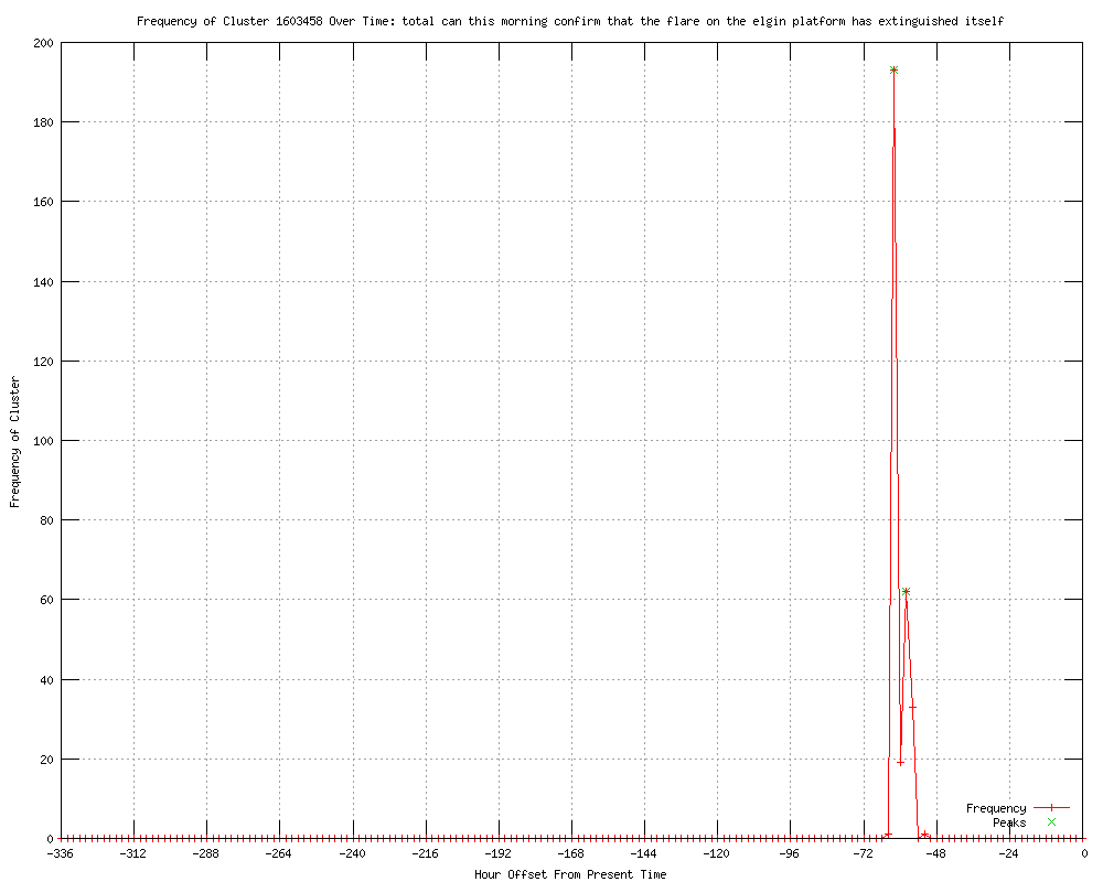 | 5 | the flare on the elgin platform has extinguished itself Urls http://ckom.com/content/flare-burns-out-totals-north-sea-platform http://cjme.com/content/flare-burns-out-totals-north-sea-platform http://newstalk650.com/content/flare-burns-out-totals-north-sea-platform http://canadianbusiness.com/article/77775--officials-say-flare-has-burned-itself-out-at-total-s-north-sea-platform http://feeds.boston.com/click.phdo?i=7384ff6372b93220bfd391fc4a1997c0 |