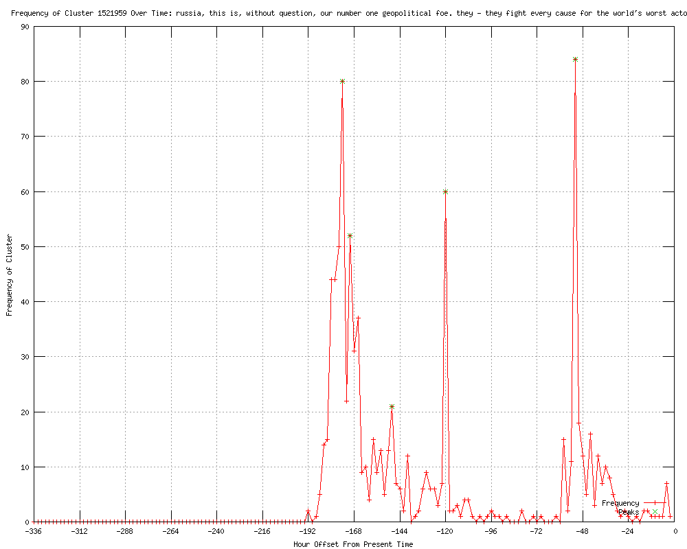 | 5 | russia, this is, without question, our number one geopolitical foe. they - they fight every cause for the world's worst actors Urls http://panorama.am/en/world/2012/03/27/romni/ http://english.pravda.ru/news/world/27-03-2012/120899-mitt_romney_russia-0/ http://williambowles.info/2012/03/27/syria-newslinks-25-27-march-2012-syrian-free-army-recruits-children/ http://nsnetwork.org/nsn-daily-update-let%e2%80%99s-get-geopolitical-32712/ http://nsnetwork.org/lets-get-geopolitical/ |