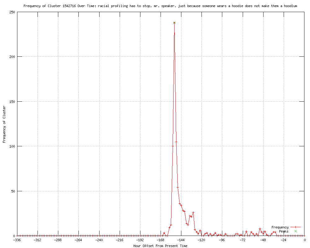 | 23 | just because someone wears a hoodie, does not make them a hoodlum Urls http://blogs.miaminewtimes.com/riptide/2012/03/video_rep_bobby_rush_removed_f.php http://infowars.com/rep-bobby-rush-wears-hoodie-in-house-in-solidarity-with-trayvon-martin/ http://dailycaller.com/2012/03/28/congressman-ejected-from-house-floor-for-wearing-hoodie/ http://longislandpress.com/2012/03/28/bobby-rush-wears-hoodie-in-house-chamber-video/ http://kentucky.com/2012/03/28/2129614/rep-bobby-rush-escorted-from-house.html#storylink=rss http://kansascity.com/2012/03/28/3519690/rep-bobby-rush-escorted-from-house.html#storylink=rss http://miamiherald.typepad.com/nakedpolitics/2012/03/rep-bobby-rush-gets-escorted-from-house-floor-for-donning-trayvon-inspired-hoodie.html http://blackamericaweb.com/?q=content/video-hoodie-protest-hits-capitol-hill http://miamiherald.com/2012/03/28/2718948/rep-bobby-rush-escorted-from-house.html http://nymag.com/daily/intel/2012/03/watch-rep-bobby-rush-get-booted-out-of-the-house-for-wearing-a-hoodie.html http://clutchmagonline.com/2012/03/congressman-bobby-rush-escorted-from-house-floor-for-wearing-hoodie-in-memory-of-trayvon-martin/ http://c-span.org/Events/Rep-Bobby-Rush-D-IL-Removed-from-House-Floor-for-Trayvon-Martin-Protest/10737429442/ http://blackamericaweb.com/?q=content/just-because-someone-wears-hoodie-does-not-make-them-hoodlum%E2%80%9D-rush-said-house-chambers-floor http://c-span.org/Events/Josh-Earnest-Answers-Questions-From-the-WH-Press/10737429433/ http://insideedition.com/news/7920/elderly-couples-address-mistakenly-tweeted-as-george-zimmermans.aspx http://wctv.tv/home/headlines/FSU_Students_Hold_Trayvon_Martin_Vigil_144758325.html http://wtsp.com/rss/article/247780/250/New-video-from-night-Trayvon-Martin-was-shot-shooters-dad-talks http://wtsp.com/rss/article/247780/250/WATCH-Video-from-night-Trayvon-Martin-was-shot http://ibtimes.com/articles/321486/20120329/trayvon-martin-george-zimmerman-bobby-rush-racism.htm http://c-span.org/Events/Speaker-Boehner-R-OH-Delivers-Weekly-Address/10737429425/ http://c-span.org/Events/President-Obama-Discusses-Oil-Company-Tax-Breaks/10737429483/ http://c-span.org/Events/Jay-Carney-Answers-Question-from-the-WH-Press/10737429482/ http://c-span.org/Events/Director-of-Consumer-Bureau-Testifies-About-New-Report-on-CFPB/10737429431/ |