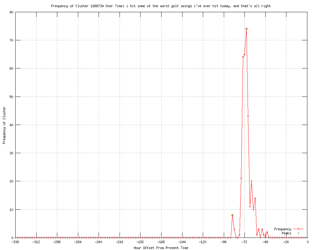 | 5 | i had some of the worse golf swings i've ever had today Urls http://jsonline.com/sports/golf/masters06-7c4srrl-146376685.html http://news.smh.com.au/breaking-news-sport/wild-crazy-first-day-for-masters-golf-20120406-1wghw.html http://news.theage.com.au/breaking-news-sport/wild-crazy-first-day-for-masters-golf-20120406-1wghw.html http://au.news.yahoo.com/a/-/business/13361468/wild-crazy-first-day-for-masters-golf/ http://news.brisbanetimes.com.au/breaking-news-sport/wild-crazy-first-day-for-masters-golf-20120406-1wghw.html |