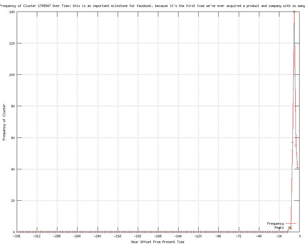 | 19 | an important milestone for facebook because it's the first time we've ever acquired a product and company with so many users Urls http://au.news.yahoo.com/world/a/-/world/13378414/facebook-buys-instagram-photo-app-for-1-bn/ http://brecorder.com/business-a-finance/industries-a-sectors/52559-facebook-buys-instagram-photo-app-for-1-bn-.html http://phys.org/news253206894.html http://au.news.yahoo.com/a/-/business/13378414/facebook-buys-instagram-photo-app-for-1-bn/ http://au.news.yahoo.com/a/-/world/13378414/facebook-buys-instagram-photo-app-for-1-bn/ http://abc.net.au/news/2012-04-10/facebook-buys-instagram-photo-app/3940248 http://japantoday.com/category/technology/view/facebook-buys-instagram-photo-app http://archive.japantoday.com/category/technology/view/facebook-buys-instagram-photo-app http://sbs.com.au/news/article/1641205/Facebook-buys-Instagram-app-for-1billion http://theborneopost.com/2012/04/10/facebook-buys-instagram-photo-app-for-1-billion/ http://uk.news.yahoo.com/facebook-buys-instagram-photo-app-1-bn-010125680.html http://news.yahoo.com/facebook-buys-instagram-photo-app-1-bn-020125905.html http://en.kioskea.net/news/21270-facebook-buys-instagram-photo-app-for-1-bn http://feeds.bangkokpost.com/c/33101/f/535961/s/1e3c3fb9/l/0L0Sbangkokpost0N0Ctech0Ccomputer0C288230A0Cfacebook0Ebuys0Einstagram0Ephoto0Eapp0Efor0E10Ebn/story01.htm http://feeds.bangkokpost.com/c/33101/f/535950/s/1e3cd552/l/0L0Sbangkokpost0N0Cbreakingnews0C288230A0Cfacebook0Ebuys0Einstagram0Ephoto0Eapp0Efor0E10Ebn/story01.htm http://thehimalayantimes.com/rssReference.php?id=MzI3NTIx http://brecorder.com/business-a-finance/industries-a-sectors/52559-facebook-buys-instagram-photo-app-for-1bn-.html http://dw.de/dw/article/0,,15868131,00.html?maca=en-rss-en-all-1573-rdf http://themiddlemarket.com/news/facebook_buys_intagram-228997-1.html |