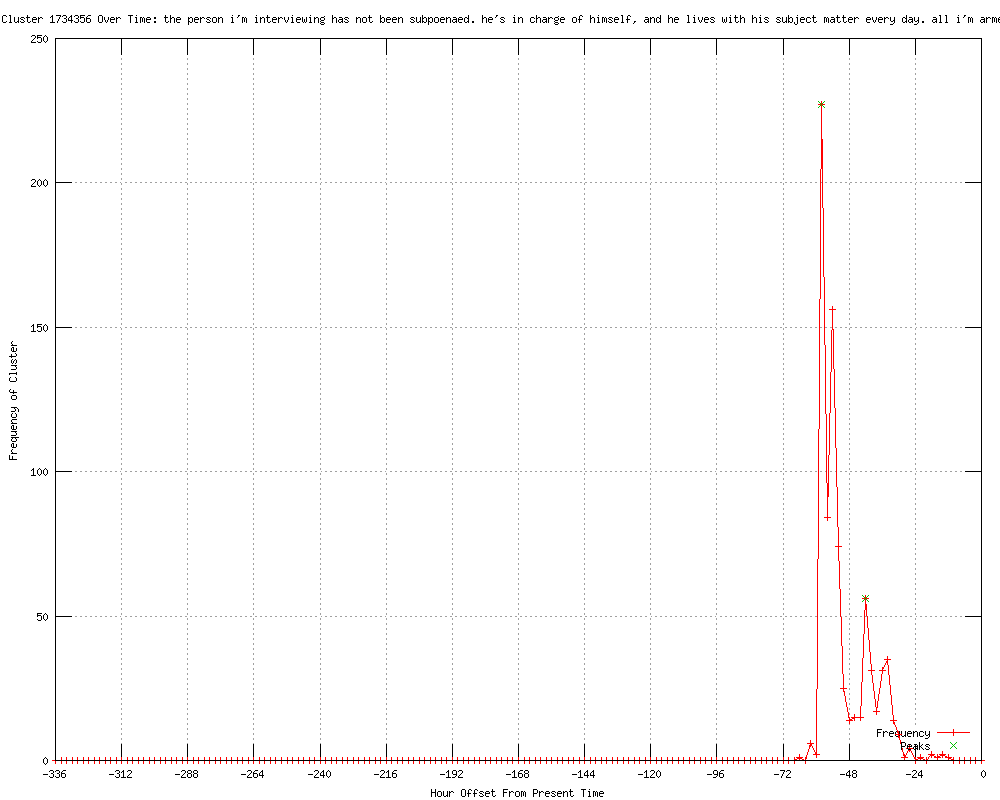 | 803 | the person i'm interviewing has not been subpoenaed. he's in charge of himself, and he lives with his subject matter every day. all i'm armed with is research Urls http://castanet.net/edition/news-story-73583-5-.htm#73583 http://castanet.net/edition/news-story-73581-5-.htm#73581 http://castanet.net/edition/news-story-73582-5-.htm#73582 http://castanet.net/edition/news-story-73597-5-.htm#73597 http://castanet.net/edition/news-story-73602-5-.htm#73602 http://wonderwall.msn.com/entertainment/mike-wallace-60-minutes-star-interviewer-dies-1675549.story http://castanet.net/edition/news-story-73612-5-.htm#73612 http://castanet.net/edition/news-story-73609-5-.htm#73609 http://castanet.net/edition/news-story-73610-5-.htm#73610 http://castanet.net/edition/news-story-73611-5-.htm#73611 http://tv.yahoo.com/news/mike-wallace-60-minutes-interrogator-dies-175620444.html http://wral.com/entertainment/story/10957858/ http://koamtv.com/story/17360146/mike-wallace-60-minutes-interrogator-dies http://wbtv.com/story/17360146/mike-wallace-60-minutes-interrogator-dies http://wthr.com/story/17360146/mike-wallace-60-minutes-interrogator-dies http://cbs3springfield.com/story/17360146/mike-wallace-60-minutes-interrogator-dies http://abc40.com/story/17360146/mike-wallace-60-minutes-interrogator-dies http://kmph.com/story/17360146/mike-wallace-60-minutes-interrogator-dies http://wect.com/story/17360146/mike-wallace-60-minutes-interrogator-dies http://kfvs.com/story/17360146/mike-wallace-60-minutes-interrogator-dies http://kwqc.com/story/17360146/mike-wallace-60-minutes-interrogator-dies http://wmbfnews.com/story/17360146/mike-wallace-60-minutes-interrogator-dies http://wistv.com/story/17360146/mike-wallace-60-minutes-interrogator-dies http://wkrn.com/story/17360146/mike-wallace-60-minutes-interrogator-dies http://wandtv.com/story/17360146/mike-wallace-60-minutes-interrogator-dies http://wsfa.com/story/17360146/mike-wallace-60-minutes-interrogator-dies http://kxxv.com/story/17360146/mike-wallace-60-minutes-interrogator-dies http://news9.com/story/17360146/mike-wallace-60-minutes-interrogator-dies http://newson6.com/story/17360146/mike-wallace-60-minutes-interrogator-dies http://wsbradio.com/ap/ap/entertainment/mike-wallace-60-minutes-interrogator-dies/nMTPn/ http://wgem.com/story/17360146/mike-wallace-60-minutes-interrogator-dies http://omg.yahoo.com/news/mike-wallace-60-minutes-interrogator-dies-175620444.html http://news.yahoo.com/mike-wallace-60-minutes-interrogator-dies-175620444.html http://power953.com/ap/ap/entertainment/mike-wallace-60-minutes-interrogator-dies/nMTPn/ http://wtol.com/story/17360146/mike-wallace-60-minutes-interrogator-dies http://kusi.com/story/17360146/mike-wallace-60-minutes-interrogator-dies http://kcbd.com/story/17360146/mike-wallace-60-minutes-interrogator-dies http://wrcbtv.com/story/17360146/mike-wallace-60-minutes-interrogator-dies http://wrex.com/story/17360146/mike-wallace-60-minutes-interrogator-dies http://knoe.com/story/17360146/mike-wallace-60-minutes-interrogator-dies http://mail.com/news/us/1193452-mike-wallace-60-minutes-interrogator-dies.html http://ktvn.com/story/17360146/mike-wallace-60-minutes-interrogator-dies http://star94fm.com/ap/ap/entertainment/mike-wallace-60-minutes-interrogator-dies/nMTPn/ http://wlbt.com/story/17360146/mike-wallace-60-minutes-interrogator-dies http://wbay.com/story/17360146/mike-wallace-60-minutes-interrogator-dies http://salon.com/2012/04/08/mike_wallace_60_minutes_interrogator_dies/ http://salon.com/2012/04/08/hudson_star_power_to_complicate_murder_trial/ http://salon.com/2012/04/08/bill_to_sidestep_israeli_high_court_criticized_2/ http://salon.com/2012/04/08/iraq_says_terrorist_cell_dismantled/ http://wric.com/story/17360146/mike-wallace-60-minutes-interrogator-dies http://wten.com/story/17360146/mike-wallace-60-minutes-interrogator-dies http://whbf.com/story/17360146/mike-wallace-60-minutes-interrogator-dies http://daily-chronicle.com/2012/04/08/mike-wallace-60-minutes-interrogator-d/aw2u083/ http://ktiv.com/story/17360146/mike-wallace-60-minutes-interrogator-dies http://khnl.com/story/17360146/mike-wallace-60-minutes-interrogator-dies http://newschannel5.com/story/17360146/mike-wallace-60-minutes-interrogator-dies http://newstimes.com/news/article/Mike-Wallace-60-Minutes-interrogator-dies-3467290.php http://lasvegassun.com/news/2012/apr/08/mike-wallace-60-minutes-star-interviewer-dies/ http://longislandpress.com/2012/04/08/mike-wallace-60-minutes-interrogator-dies/ http://nwherald.com/2012/04/08/mike-wallace-60-minutes-interrogator-d/aw2u083/ http://crescent-news.com/latest%20headlines/2012/04/08/mike-wallace-60-minutes-interrogator-dies http://newson6.com/story/17360247/mike-wallace-60-minutes-interrogator-dies http://wsbradio.com/ap/ap/entertainment/mike-wallace-60-minutes-interrogator-dies/nMTQB/ http://wgem.com/story/17360247/mike-wallace-60-minutes-interrogator-dies http://wral.com/entertainment/story/10957892/ http://cjme.com/content/mike-wallace-60-minutes-interrogator-dies http://kwes.com/story/17360247/mike-wallace-60-minutes-interrogator-dies http://power953.com/ap/ap/entertainment/mike-wallace-60-minutes-interrogator-dies/nMTQB/ http://kswo.com/story/17360247/mike-wallace-60-minutes-interrogator-dies http://svherald.com/associatedpress/258110 http://kcbd.com/story/17360247/mike-wallace-60-minutes-interrogator-dies http://kusi.com/story/17360247/mike-wallace-60-minutes-interrogator-dies http://wrcbtv.com/story/17360247/mike-wallace-60-minutes-interrogator-dies http://wrex.com/story/17360247/mike-wallace-60-minutes-interrogator-dies http://waff.com/story/17360247/mike-wallace-60-minutes-interrogator-dies http://knoe.com/story/17360247/mike-wallace-60-minutes-interrogator-dies http://wlox.com/story/17360247/mike-wallace-60-minutes-interrogator-dies http://star94fm.com/ap/ap/entertainment/mike-wallace-60-minutes-interrogator-dies/nMTQB/ http://ktvn.com/story/17360247/mike-wallace-60-minutes-interrogator-dies http://cbs8.com/s