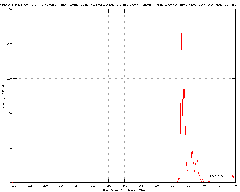 | 817 | the person i'm interviewing has not been subpoenaed. he's in charge of himself, and he lives with his subject matter every day. all i'm armed with is research Urls http://castanet.net/edition/news-story-73583-5-.htm#73583 http://castanet.net/edition/news-story-73581-5-.htm#73581 http://castanet.net/edition/news-story-73582-5-.htm#73582 http://castanet.net/edition/news-story-73597-5-.htm#73597 http://castanet.net/edition/news-story-73602-5-.htm#73602 http://wonderwall.msn.com/entertainment/mike-wallace-60-minutes-star-interviewer-dies-1675549.story http://castanet.net/edition/news-story-73612-5-.htm#73612 http://castanet.net/edition/news-story-73609-5-.htm#73609 http://castanet.net/edition/news-story-73610-5-.htm#73610 http://castanet.net/edition/news-story-73611-5-.htm#73611 http://tv.yahoo.com/news/mike-wallace-60-minutes-interrogator-dies-175620444.html http://wral.com/entertainment/story/10957858/ http://koamtv.com/story/17360146/mike-wallace-60-minutes-interrogator-dies http://wbtv.com/story/17360146/mike-wallace-60-minutes-interrogator-dies http://wthr.com/story/17360146/mike-wallace-60-minutes-interrogator-dies http://cbs3springfield.com/story/17360146/mike-wallace-60-minutes-interrogator-dies http://abc40.com/story/17360146/mike-wallace-60-minutes-interrogator-dies http://kmph.com/story/17360146/mike-wallace-60-minutes-interrogator-dies http://wect.com/story/17360146/mike-wallace-60-minutes-interrogator-dies http://kfvs.com/story/17360146/mike-wallace-60-minutes-interrogator-dies http://kwqc.com/story/17360146/mike-wallace-60-minutes-interrogator-dies http://wmbfnews.com/story/17360146/mike-wallace-60-minutes-interrogator-dies http://wistv.com/story/17360146/mike-wallace-60-minutes-interrogator-dies http://wkrn.com/story/17360146/mike-wallace-60-minutes-interrogator-dies http://wandtv.com/story/17360146/mike-wallace-60-minutes-interrogator-dies http://wsfa.com/story/17360146/mike-wallace-60-minutes-interrogator-dies http://kxxv.com/story/17360146/mike-wallace-60-minutes-interrogator-dies http://news9.com/story/17360146/mike-wallace-60-minutes-interrogator-dies http://newson6.com/story/17360146/mike-wallace-60-minutes-interrogator-dies http://wsbradio.com/ap/ap/entertainment/mike-wallace-60-minutes-interrogator-dies/nMTPn/ http://wgem.com/story/17360146/mike-wallace-60-minutes-interrogator-dies http://omg.yahoo.com/news/mike-wallace-60-minutes-interrogator-dies-175620444.html http://news.yahoo.com/mike-wallace-60-minutes-interrogator-dies-175620444.html http://power953.com/ap/ap/entertainment/mike-wallace-60-minutes-interrogator-dies/nMTPn/ http://wtol.com/story/17360146/mike-wallace-60-minutes-interrogator-dies http://kusi.com/story/17360146/mike-wallace-60-minutes-interrogator-dies http://kcbd.com/story/17360146/mike-wallace-60-minutes-interrogator-dies http://wrcbtv.com/story/17360146/mike-wallace-60-minutes-interrogator-dies http://wrex.com/story/17360146/mike-wallace-60-minutes-interrogator-dies http://knoe.com/story/17360146/mike-wallace-60-minutes-interrogator-dies http://mail.com/news/us/1193452-mike-wallace-60-minutes-interrogator-dies.html http://ktvn.com/story/17360146/mike-wallace-60-minutes-interrogator-dies http://star94fm.com/ap/ap/entertainment/mike-wallace-60-minutes-interrogator-dies/nMTPn/ http://wlbt.com/story/17360146/mike-wallace-60-minutes-interrogator-dies http://wbay.com/story/17360146/mike-wallace-60-minutes-interrogator-dies http://salon.com/2012/04/08/mike_wallace_60_minutes_interrogator_dies/ http://salon.com/2012/04/08/hudson_star_power_to_complicate_murder_trial/ http://salon.com/2012/04/08/bill_to_sidestep_israeli_high_court_criticized_2/ http://salon.com/2012/04/08/iraq_says_terrorist_cell_dismantled/ http://wric.com/story/17360146/mike-wallace-60-minutes-interrogator-dies http://wten.com/story/17360146/mike-wallace-60-minutes-interrogator-dies http://whbf.com/story/17360146/mike-wallace-60-minutes-interrogator-dies http://daily-chronicle.com/2012/04/08/mike-wallace-60-minutes-interrogator-d/aw2u083/ http://ktiv.com/story/17360146/mike-wallace-60-minutes-interrogator-dies http://khnl.com/story/17360146/mike-wallace-60-minutes-interrogator-dies http://newschannel5.com/story/17360146/mike-wallace-60-minutes-interrogator-dies http://newstimes.com/news/article/Mike-Wallace-60-Minutes-interrogator-dies-3467290.php http://lasvegassun.com/news/2012/apr/08/mike-wallace-60-minutes-star-interviewer-dies/ http://longislandpress.com/2012/04/08/mike-wallace-60-minutes-interrogator-dies/ http://nwherald.com/2012/04/08/mike-wallace-60-minutes-interrogator-d/aw2u083/ http://crescent-news.com/latest%20headlines/2012/04/08/mike-wallace-60-minutes-interrogator-dies http://newson6.com/story/17360247/mike-wallace-60-minutes-interrogator-dies http://wsbradio.com/ap/ap/entertainment/mike-wallace-60-minutes-interrogator-dies/nMTQB/ http://wgem.com/story/17360247/mike-wallace-60-minutes-interrogator-dies http://wral.com/entertainment/story/10957892/ http://cjme.com/content/mike-wallace-60-minutes-interrogator-dies http://kwes.com/story/17360247/mike-wallace-60-minutes-interrogator-dies http://power953.com/ap/ap/entertainment/mike-wallace-60-minutes-interrogator-dies/nMTQB/ http://kswo.com/story/17360247/mike-wallace-60-minutes-interrogator-dies http://svherald.com/associatedpress/258110 http://kcbd.com/story/17360247/mike-wallace-60-minutes-interrogator-dies http://kusi.com/story/17360247/mike-wallace-60-minutes-interrogator-dies http://wrcbtv.com/story/17360247/mike-wallace-60-minutes-interrogator-dies http://wrex.com/story/17360247/mike-wallace-60-minutes-interrogator-dies http://waff.com/story/17360247/mike-wallace-60-minutes-interrogator-dies http://knoe.com/story/17360247/mike-wallace-60-minutes-interrogator-dies http://wlox.com/story/17360247/mike-wallace-60-minutes-interrogator-dies http://star94fm.com/ap/ap/entertainment/mike-wallace-60-minutes-interrogator-dies/nMTQB/ http://ktvn.com/story/17360247/mike-wallace-60-minutes-interrogator-dies http://cbs8.com/s