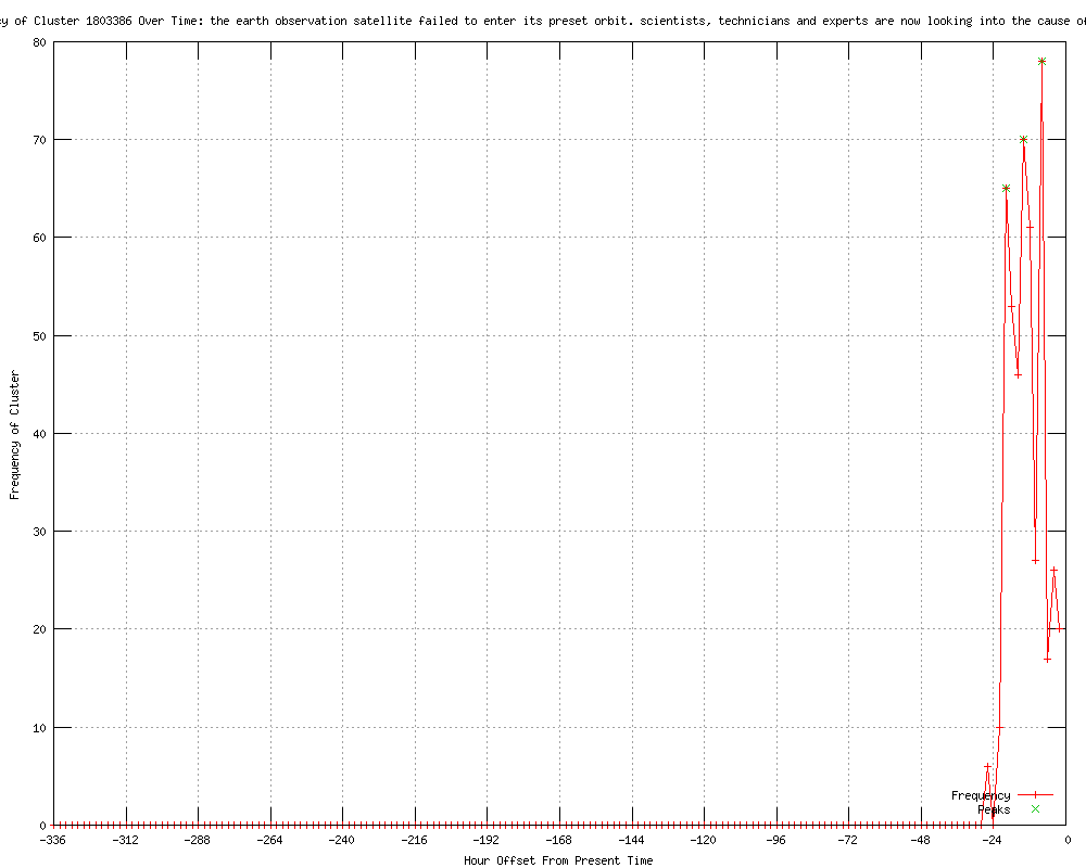 | 30 | the earth observation satellite failed to enter its preset orbit. scientists, technicians and experts are now looking into the cause of the failure Urls http://globalnation.inquirer.net/32985/north-korea-says-satellite-failed-to-enter-into-orbit http://pangasinanhub.blogspot.com/2012/04/north-korean-satellite-failed-to-enter.html http://urdanetacity.blogspot.com/2012/04/north-korean-satellite-sablay.html http://thedailystar.net/latest/updates.php?pid=70 http://timesofindia.indiatimes.com/world/rest-of-world/North-Korea-admits-failure-of-rocket-launch-after-four-hours-of-silence/articleshow/12646830.cms http://ph.news.yahoo.com/long-silence-north-korea-rocket-failure-043409948.html http://da.feedsportal.com/c/33039/f/555218/s/62100529/l/0Ltimesofindia0Bindiatimes0N0Cworld0Crest0Eof0Eworld0CNorth0EKorea0Eadmits0Efailure0Eof0Erocket0Elaunch0Eafter0Efour0Ehours0Eof0Esilence0Carticleshow0C12646830A0Bcms/ia1.htm http://deccanchronicle.com/channels/world/asia/north-korea-says-satellite-failed-enter-orbit-024 http://au.news.yahoo.com/a/-/world/13414573/long-silence-in-north-korea-after-rocket-failure/ http://thehimalayantimes.com/rssReference.php?id=MzI3ODg1 http://channelnewsasia.com/stories/afp_asiapacific/view/1194953/1/.html http://freemalaysiatoday.com/category/world/2012/04/13/long-silence-in-north-korea-after-rocket-failure/ http://smh.com.au/world/north-korea-finally-admits-to-rocket-failure-20120413-1wyf4.html http://feeds.bangkokpost.com/c/33101/f/535952/s/1e58a047/l/0L0Sbangkokpost0N0Cnews0Casia0C288720A0Clong0Esilence0Ein0Enorth0Ekorea0Eafter0Erocket0Efailure/story01.htm http://theage.com.au/world/north-korea-finally-admits-to-rocket-failure-20120413-1wyf4.html http://scribd.com/doc/89285065/Liberty-Newspost-April-13-2012 http://globalindigo.com/north-korea-admits-failed-rocket-launch http://rediff.com/news/report/china-calls-for-calm-after-n-koreas-rocket-failure/20120413.htm http://mwcnews.net/news/asia-pacfic/18188-failed-rocket-launch.html http://spacewar.com/reports/Long_silence_in_North_Korea_after_rocket_failure_999.html http://ranabhola.blogspot.com/2012/04/greetings-extnded-for-new-year-year-by.html http://brisbanetimes.com.au/world/north-korea-finally-admits-to-rocket-failure-20120413-1wyf4.html http://bbc.co.uk/news/world-asia-17698438#sa-ns_mchannel=rss&ns_source=PublicRSS20-sa http://themoneytimes.com/featured/20120413/north-korea-long-range-rocket-crashes-id-1701711643.html http://digitaljournal.com/article/322890 http://cnn.com/2012/04/13/world/asia/north-korea-journalists/index.html?eref=rss_latest http://edition.cnn.com/2012/04/13/world/asia/north-korea-journalists/index.html?eref=rss_asia http://theweek.co.uk/asia-pacific/north-korea/46288/north-koreas-failed-rocket-launch-humiliates-kim-jong-un http://gizmag.com/north-korea-rocket-fails/22148/ http://gizmag.com/north-korea-rocket-fails/22148 |