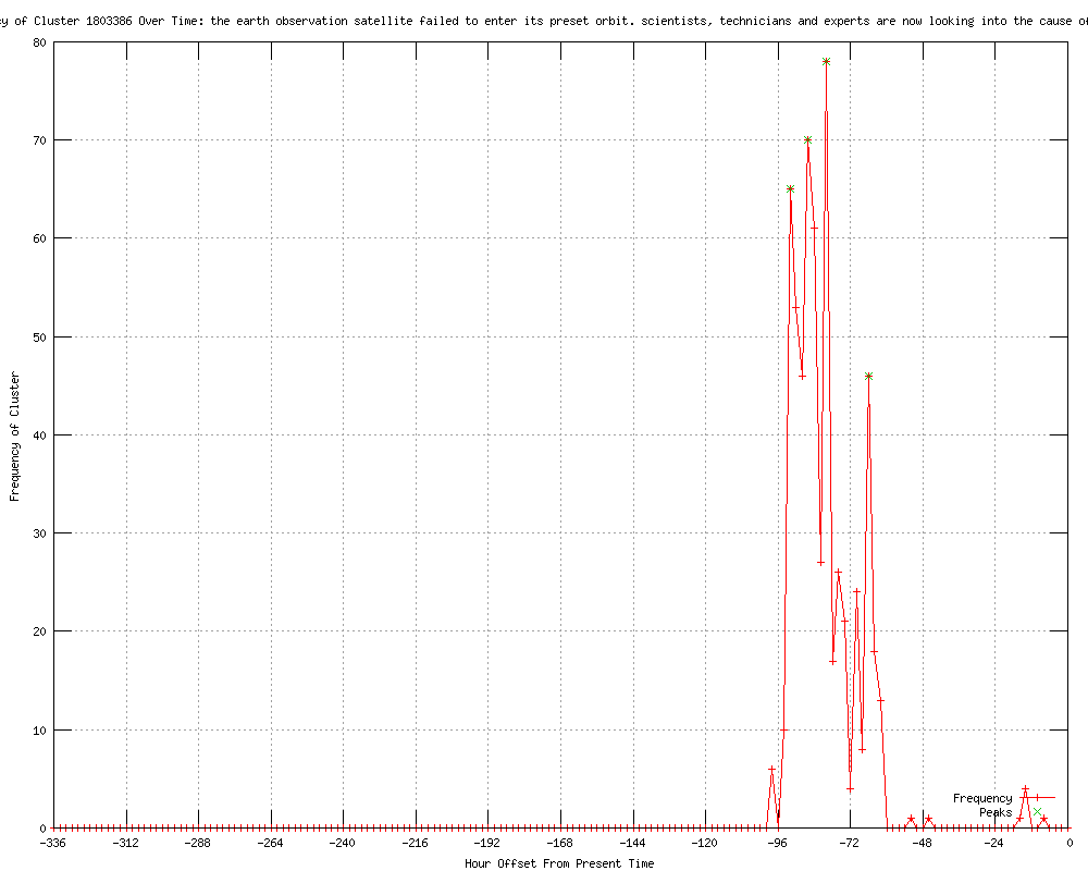 | 30 | the earth observation satellite failed to enter its preset orbit. scientists, technicians and experts are now looking into the cause of the failure Urls http://globalnation.inquirer.net/32985/north-korea-says-satellite-failed-to-enter-into-orbit http://pangasinanhub.blogspot.com/2012/04/north-korean-satellite-failed-to-enter.html http://urdanetacity.blogspot.com/2012/04/north-korean-satellite-sablay.html http://thedailystar.net/latest/updates.php?pid=70 http://timesofindia.indiatimes.com/world/rest-of-world/North-Korea-admits-failure-of-rocket-launch-after-four-hours-of-silence/articleshow/12646830.cms http://ph.news.yahoo.com/long-silence-north-korea-rocket-failure-043409948.html http://da.feedsportal.com/c/33039/f/555218/s/62100529/l/0Ltimesofindia0Bindiatimes0N0Cworld0Crest0Eof0Eworld0CNorth0EKorea0Eadmits0Efailure0Eof0Erocket0Elaunch0Eafter0Efour0Ehours0Eof0Esilence0Carticleshow0C12646830A0Bcms/ia1.htm http://deccanchronicle.com/channels/world/asia/north-korea-says-satellite-failed-enter-orbit-024 http://au.news.yahoo.com/a/-/world/13414573/long-silence-in-north-korea-after-rocket-failure/ http://thehimalayantimes.com/rssReference.php?id=MzI3ODg1 http://channelnewsasia.com/stories/afp_asiapacific/view/1194953/1/.html http://freemalaysiatoday.com/category/world/2012/04/13/long-silence-in-north-korea-after-rocket-failure/ http://smh.com.au/world/north-korea-finally-admits-to-rocket-failure-20120413-1wyf4.html http://feeds.bangkokpost.com/c/33101/f/535952/s/1e58a047/l/0L0Sbangkokpost0N0Cnews0Casia0C288720A0Clong0Esilence0Ein0Enorth0Ekorea0Eafter0Erocket0Efailure/story01.htm http://theage.com.au/world/north-korea-finally-admits-to-rocket-failure-20120413-1wyf4.html http://scribd.com/doc/89285065/Liberty-Newspost-April-13-2012 http://globalindigo.com/north-korea-admits-failed-rocket-launch http://rediff.com/news/report/china-calls-for-calm-after-n-koreas-rocket-failure/20120413.htm http://mwcnews.net/news/asia-pacfic/18188-failed-rocket-launch.html http://spacewar.com/reports/Long_silence_in_North_Korea_after_rocket_failure_999.html http://ranabhola.blogspot.com/2012/04/greetings-extnded-for-new-year-year-by.html http://brisbanetimes.com.au/world/north-korea-finally-admits-to-rocket-failure-20120413-1wyf4.html http://bbc.co.uk/news/world-asia-17698438#sa-ns_mchannel=rss&ns_source=PublicRSS20-sa http://themoneytimes.com/featured/20120413/north-korea-long-range-rocket-crashes-id-1701711643.html http://digitaljournal.com/article/322890 http://cnn.com/2012/04/13/world/asia/north-korea-journalists/index.html?eref=rss_latest http://edition.cnn.com/2012/04/13/world/asia/north-korea-journalists/index.html?eref=rss_asia http://theweek.co.uk/asia-pacific/north-korea/46288/north-koreas-failed-rocket-launch-humiliates-kim-jong-un http://gizmag.com/north-korea-rocket-fails/22148/ http://gizmag.com/north-korea-rocket-fails/22148 |