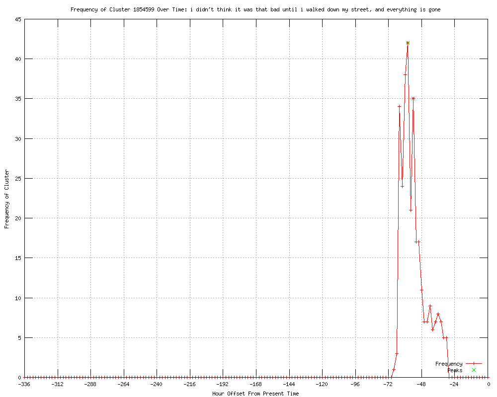 | 10 | i didn't think it was that bad until i walked down my street, and everything is gone Urls http://jconline.com/article/20120415/NEWS11/120415009/Tornadoes-leave-royal-mess-Midwest?odyssey=nav|head http://jconline.com/article/20120415/NEWS11/120415009/Tornadoes-leave-royal-mess-Midwest?odyssey=tab|topnews|text|FRONTPAGE http://wtsp.com/rss/article/250924/81/Weekend-tornadoes-leave-a-royal-mess-in-Midwest-5-dead http://13wmaz.com/news/national/article/178351/28/Midwest-Braces-for-More-Severe-Storms http://13wmaz.com/news/national/article/178351/0/Midwest-Braces-for-More-Severe-Storms?odyssey=tab%7Ctopnews%7Cbc%7Clarge http://jconline.com/article/20120415/NEWS11/120415009/Tornadoes-leave-a-royal-mess-in-Midwest?odyssey=tab|mostpopular|text|FRONTPAGE http://wltx.com/news/national/article/184178/142/Storms-Leave-A-Royal-Mess-in-Midwest-5-Dead http://news10.net/news/national/189746/5/Midwest-tornadoes-leave-trail-of-death-destruction http://news10.net/news/article/189746/5/Midwest-tornadoes-leave-trail-of-death-destruction http://wlbz2.com/news/national/article/197767/45/Tornadoes-leave-a-royal-mess-in-Midwest |