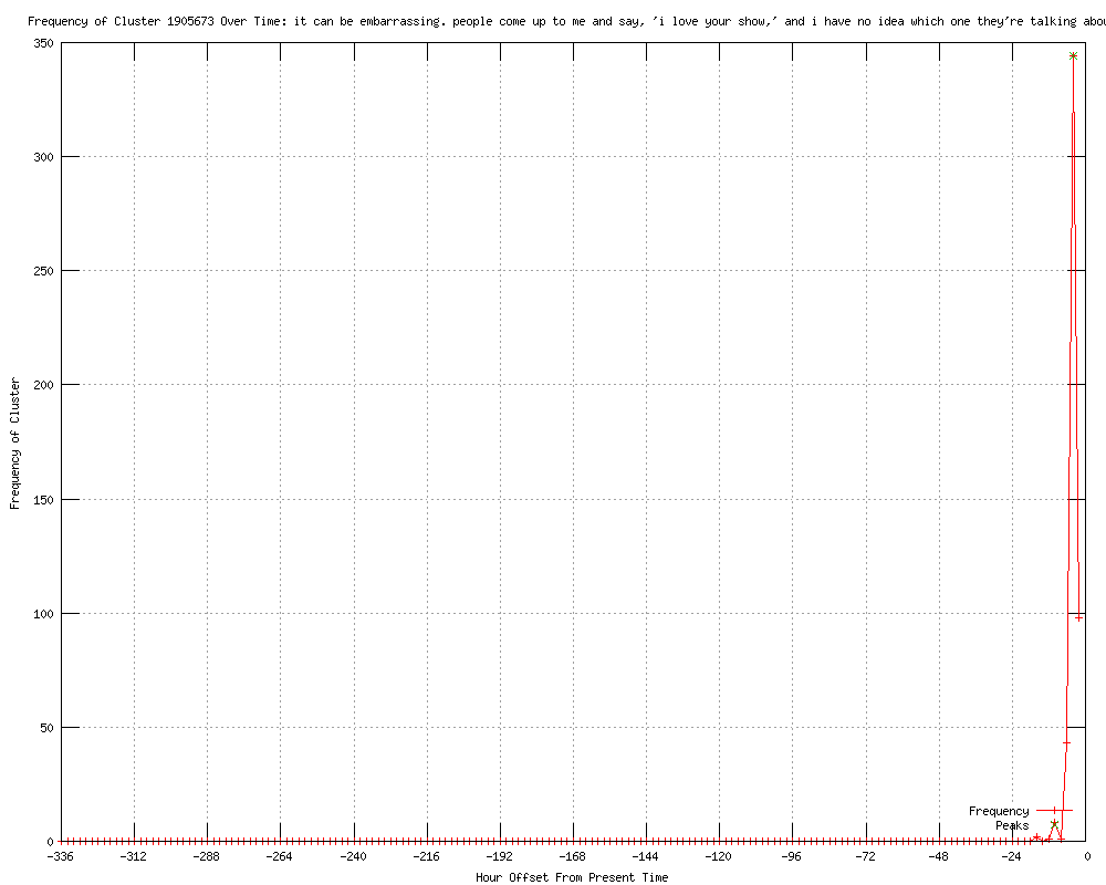 | 491 | it can be embarrassing. people come up to me and say, 'i love your show,' and i have no idea which one they're talking about Urls http://indystar.com/article/20120418/ENTERTAINMENT/204180357 http://lohud.com/article/20120419/NEWS02/304190045 http://salon.com/2012/04/19/3_agents_out_in_wake_of_secret_service_scandal/ http://salon.com/2012/04/19/scorching_talk_romney_obama_battle_over_economy/ http://salon.com/2012/04/19/nurse_accused_in_baby_abduction_had_miscarried/ http://artesianews.com/ap-news/united-states-ap-news/wednesday-april-18-2012-3/ http://artesianews.com/ap-news/united-states-ap-news/wednesday-april-18-2012-4/ http://artesianews.com/ap-news/united-states-ap-news/wednesday-april-18-2012-2/ http://artesianews.com/ap-news/united-states-ap-news/wednesday-april-18-2012/ http://artesianews.com/ap-news/united-states-ap-news/wednesday-april-18-2012-5/ http://power953.com/ap/ap/entertainment/american-bandstand-host-dick-clark-has-died/nMcSY/ http://thenewstribune.com/2012/04/18/2112381/american-bandstand-host-dick-clark.html?storylink=rss http://newsobserver.com/2012/04/18/2009610/american-bandstand-host-dick-clark.html#storylink=rss http://timesfreepress.com/news/2012/apr/18/american-bandstand-host-dick-clark-dead/ http://idahostatesman.com/2012/04/18/2080267/american-bandstand-host-dick-clark.html#storylink=rss http://thenewstribune.com/2012/04/18/2112385/american-bandstand-host-dick-clark.html?storylink=rss http://wlbt.com/story/17527018/american-bandstand-host-dick-clark-has-died http://buffalonews.com/entertainment/gusto/television/article816720.ece http://fox16.com:80/news/local/story/American-Bandstand-host-Dick-Clark-has-died/K4NkZ-jaaUuOZfBq_ON9dQ.cspx?rss=315 http://newsobserver.com/2012/04/18/2009619/american-bandstand-host-dick-clark.html#storylink=rss http://nwherald.com/2012/04/18/tv-producer-dick-clark-dead-at-82/a2txc70/ http://kswo.com/story/17527018/american-bandstand-host-dick-clark-has-died http://nbc-2.com/story/17527018/american-bandstand-host-dick-clark-has-died http://winnipegfreepress.com/breakingnews/american-bandstand-host-dick-clark-has-died-147978115.html http://kusi.com/story/17527018/american-bandstand-host-dick-clark-has-died http://theday.com/article/20120418/ENT15/120419524/1047/rss01 http://wral.com/entertainment/story/10997653/ http://wmbfnews.com/story/17527018/american-bandstand-host-dick-clark-has-died http://readingeagle.com/article.aspx?id=380527 http://wkrn.com/story/17527018/american-bandstand-host-dick-clark-has-died http://wtol.com/story/17527018/american-bandstand-host-dick-clark-has-died http://kwes.com/story/17527018/american-bandstand-host-dick-clark-has-died http://wonderwall.msn.com/tv/dick-clark-dies-at-the-age-of-82-1677307.story http://idahostatesman.com/2012/04/18/2080285/american-bandstand-host-dick-clark.html#storylink=rss http://thebostonchannel.com/entertainment/30915225/detail.html http://couriernews.suntimes.com/11985352-421/dick-clark-american-bandstand-host-dies-of-heart-attack-at-82.html http://thenewstribune.com/2012/04/18/2112404/american-bandstand-host-dick-clark.html?storylink=rss http://wxvt.com/Global/story.asp?S=17527018 http://kmov.com/home/American-Bandstand-host-Dick-Clark-dies--147978045.html http://wsbradio.com/news/ap/entertainment/american-bandstand-host-dick-clark-has-died/nMcSY/ http://foxprovidence.com/dpps/entertainment/celebrity_news/dick-clark-dead-at-82-of-heart-attack-et12-tvw_4142512 http://koamtv.com/story/17527018/american-bandstand-host-dick-clark-has-died http://news.yahoo.com/american-bandstand-host-dick-clark-died-195437847.html http://fox11az.com/story/17527018/american-bandstand-host-dick-clark-has-died http://wbal.com/article/88967/40/Dick-Clark-Has-Died http://connecttristates.com/news/story.aspx?id=743594 http://courier-journal.com/article/20120418/FEATURES07/304180106/dick-clark-dead-die?odyssey=mod|newswell|text|Home|s http://wect.com/story/17527018/american-bandstand-host-dick-clark-has-died http://courier-journal.com/article/20120418/FEATURES07/304180106/dick-clark-dead-die?odyssey=mod|breaking|img|Home http://courier-journal.com/article/20120418/FEATURES07/304180106/dick-clark-dead-die?odyssey=mod|breaking|text|Home http://blueridgenow.com/article/20120418/articles/120419750 http://dfw.com/2012/04/18/608968/american-bandstand-host-dick-clark.html http://dfw.com/2012/04/18/608971/american-bandstand-host-dick-clark.html http://superiortelegram.com/event/article/id/65329/ http://crescent-news.com/ap%20entertainment/2012/04/18/dick-clark-dies http://cbs3springfield.com/story/17527018/american-bandstand-host-dick-clark-has-died http://eagletribune.com/lifestyle/x2086600122/REPORT-Dick-Clark-dead http://triadmarketplace.news-record.com/content/2012/04/18/article/american_bandstand_host_dick_clark_has_died http://wsfa.com/story/17527018/american-bandstand-host-dick-clark-has-died http://ledger-enquirer.com/2012/04/18/2016742/american-bandstand-host-dick-clark.html#storylink=rss http://.godanriver.com/news/2012/apr/18/american-bandstand-host-dick-clark-has-died-ar-1852083/ http://kcbd.com/story/17527018/american-bandstand-host-dick-clark-has-died http://wrcbtv.com/story/17527018/american-bandstand-host-dick-clark-has-died http://knoe.com/story/17527018/american-bandstand-host-dick-clark-has-died http://kswt.com/story/17527018/american-bandstand-host-dick-clark-has-died http://macon.com/2012/04/18/1994758/american-bandstand-host-dick-clark.html#storylink=rss http://kansas.com/2012/04/18/2301672/american-bandstand-host-dick-clark.html http://daytonscw.com/dpps/entertainment/celebrity/dick-clark-dead-at-82-of-heart-attack-et12-tvw_4142512 http://salisburypost.com/News/041812-Dick-Clark-has-died http://wkyc.com/news/article/241861/110/Dick-Clark-dies-at-82 http://wkyc.com/news/article/241861/45/Dick-Clark-dies-at-82?odyssey=tab%7Ctopnews%7Cbc%7Clarge http://wkyc.com/news/article/241861/45/Dick-Clark-dies-at-82 http://star94fm.com/news/ap/california/american-bandstand-host-dick-clark-has