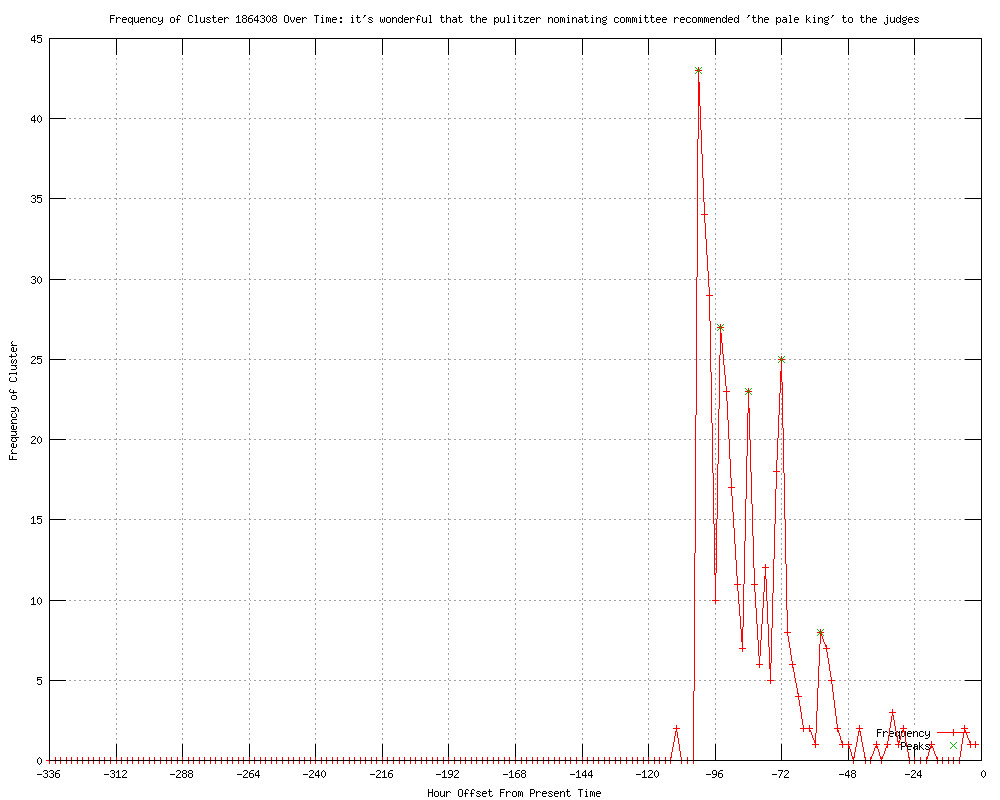 | 10 | it's wonderful that the pulitzer nominating committee recommended `the pale king' to the judges Urls http://entertainment.msn.com/news/article.aspx?news=721499&affid=100055 http://entertainment.msn.com/news/article.aspx?news=721510&affid=100055 http://entertainment.msn.com/news/article.aspx?news=721518&affid=100055 http://boston.com/news/education/higher/articles/2012/04/16/the_late_manning_marable_wins_history_pulitzer?rss_id=Boston.com+--+Education+news http://entertainment.msn.com/news/article.aspx?news=721556&affid=100055 http://wonderwall.msn.com/entertainment/no-fiction-pulitzer-given-for-1st-time-in-35-years-1676986.story http://kdwn.com/news/entertainment-news/No_fiction_Pulitzer_given_for_1st_time_in_35_years http://local10.com/entertainment/No-Pulitzer-given-for-fiction/-/1716846/10948260/-/11hv839z/-/index.html http://newsinfo.inquirer.net/178189/no-fiction-pulitzer-given-for-1st-time-in-35-years http://utsandiego.com/news/2012/apr/16/no-fiction-pulitzer-given-for-1st-time-in-35-years/ |