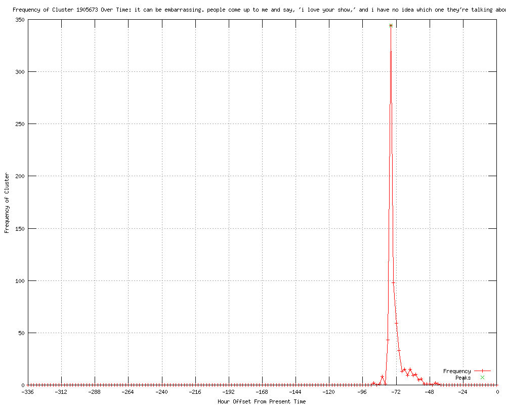 | 559 | it can be embarrassing. people come up to me and say, 'i love your show,' and i have no idea which one they're talking about Urls http://indystar.com/article/20120418/ENTERTAINMENT/204180357 http://lohud.com/article/20120419/NEWS02/304190045 http://salon.com/2012/04/19/3_agents_out_in_wake_of_secret_service_scandal/ http://salon.com/2012/04/19/scorching_talk_romney_obama_battle_over_economy/ http://salon.com/2012/04/19/nurse_accused_in_baby_abduction_had_miscarried/ http://artesianews.com/ap-news/united-states-ap-news/wednesday-april-18-2012-3/ http://artesianews.com/ap-news/united-states-ap-news/wednesday-april-18-2012-4/ http://artesianews.com/ap-news/united-states-ap-news/wednesday-april-18-2012-2/ http://artesianews.com/ap-news/united-states-ap-news/wednesday-april-18-2012/ http://artesianews.com/ap-news/united-states-ap-news/wednesday-april-18-2012-5/ http://power953.com/ap/ap/entertainment/american-bandstand-host-dick-clark-has-died/nMcSY/ http://thenewstribune.com/2012/04/18/2112381/american-bandstand-host-dick-clark.html?storylink=rss http://newsobserver.com/2012/04/18/2009610/american-bandstand-host-dick-clark.html#storylink=rss http://timesfreepress.com/news/2012/apr/18/american-bandstand-host-dick-clark-dead/ http://idahostatesman.com/2012/04/18/2080267/american-bandstand-host-dick-clark.html#storylink=rss http://thenewstribune.com/2012/04/18/2112385/american-bandstand-host-dick-clark.html?storylink=rss http://wlbt.com/story/17527018/american-bandstand-host-dick-clark-has-died http://buffalonews.com/entertainment/gusto/television/article816720.ece http://fox16.com:80/news/local/story/American-Bandstand-host-Dick-Clark-has-died/K4NkZ-jaaUuOZfBq_ON9dQ.cspx?rss=315 http://newsobserver.com/2012/04/18/2009619/american-bandstand-host-dick-clark.html#storylink=rss http://nwherald.com/2012/04/18/tv-producer-dick-clark-dead-at-82/a2txc70/ http://kswo.com/story/17527018/american-bandstand-host-dick-clark-has-died http://nbc-2.com/story/17527018/american-bandstand-host-dick-clark-has-died http://winnipegfreepress.com/breakingnews/american-bandstand-host-dick-clark-has-died-147978115.html http://kusi.com/story/17527018/american-bandstand-host-dick-clark-has-died http://theday.com/article/20120418/ENT15/120419524/1047/rss01 http://wral.com/entertainment/story/10997653/ http://wmbfnews.com/story/17527018/american-bandstand-host-dick-clark-has-died http://readingeagle.com/article.aspx?id=380527 http://wkrn.com/story/17527018/american-bandstand-host-dick-clark-has-died http://wtol.com/story/17527018/american-bandstand-host-dick-clark-has-died http://kwes.com/story/17527018/american-bandstand-host-dick-clark-has-died http://wonderwall.msn.com/tv/dick-clark-dies-at-the-age-of-82-1677307.story http://idahostatesman.com/2012/04/18/2080285/american-bandstand-host-dick-clark.html#storylink=rss http://thebostonchannel.com/entertainment/30915225/detail.html http://couriernews.suntimes.com/11985352-421/dick-clark-american-bandstand-host-dies-of-heart-attack-at-82.html http://thenewstribune.com/2012/04/18/2112404/american-bandstand-host-dick-clark.html?storylink=rss http://wxvt.com/Global/story.asp?S=17527018 http://kmov.com/home/American-Bandstand-host-Dick-Clark-dies--147978045.html http://wsbradio.com/news/ap/entertainment/american-bandstand-host-dick-clark-has-died/nMcSY/ http://foxprovidence.com/dpps/entertainment/celebrity_news/dick-clark-dead-at-82-of-heart-attack-et12-tvw_4142512 http://koamtv.com/story/17527018/american-bandstand-host-dick-clark-has-died http://news.yahoo.com/american-bandstand-host-dick-clark-died-195437847.html http://fox11az.com/story/17527018/american-bandstand-host-dick-clark-has-died http://wbal.com/article/88967/40/Dick-Clark-Has-Died http://connecttristates.com/news/story.aspx?id=743594 http://courier-journal.com/article/20120418/FEATURES07/304180106/dick-clark-dead-die?odyssey=mod|newswell|text|Home|s http://wect.com/story/17527018/american-bandstand-host-dick-clark-has-died http://courier-journal.com/article/20120418/FEATURES07/304180106/dick-clark-dead-die?odyssey=mod|breaking|img|Home http://courier-journal.com/article/20120418/FEATURES07/304180106/dick-clark-dead-die?odyssey=mod|breaking|text|Home http://blueridgenow.com/article/20120418/articles/120419750 http://dfw.com/2012/04/18/608968/american-bandstand-host-dick-clark.html http://dfw.com/2012/04/18/608971/american-bandstand-host-dick-clark.html http://superiortelegram.com/event/article/id/65329/ http://crescent-news.com/ap%20entertainment/2012/04/18/dick-clark-dies http://cbs3springfield.com/story/17527018/american-bandstand-host-dick-clark-has-died http://eagletribune.com/lifestyle/x2086600122/REPORT-Dick-Clark-dead http://triadmarketplace.news-record.com/content/2012/04/18/article/american_bandstand_host_dick_clark_has_died http://wsfa.com/story/17527018/american-bandstand-host-dick-clark-has-died http://ledger-enquirer.com/2012/04/18/2016742/american-bandstand-host-dick-clark.html#storylink=rss http://.godanriver.com/news/2012/apr/18/american-bandstand-host-dick-clark-has-died-ar-1852083/ http://kcbd.com/story/17527018/american-bandstand-host-dick-clark-has-died http://wrcbtv.com/story/17527018/american-bandstand-host-dick-clark-has-died http://knoe.com/story/17527018/american-bandstand-host-dick-clark-has-died http://kswt.com/story/17527018/american-bandstand-host-dick-clark-has-died http://macon.com/2012/04/18/1994758/american-bandstand-host-dick-clark.html#storylink=rss http://kansas.com/2012/04/18/2301672/american-bandstand-host-dick-clark.html http://daytonscw.com/dpps/entertainment/celebrity/dick-clark-dead-at-82-of-heart-attack-et12-tvw_4142512 http://salisburypost.com/News/041812-Dick-Clark-has-died http://wkyc.com/news/article/241861/110/Dick-Clark-dies-at-82 http://wkyc.com/news/article/241861/45/Dick-Clark-dies-at-82?odyssey=tab%7Ctopnews%7Cbc%7Clarge http://wkyc.com/news/article/241861/45/Dick-Clark-dies-at-82 http://star94fm.com/news/ap/california/american-bandstand-host-dick-clark-has