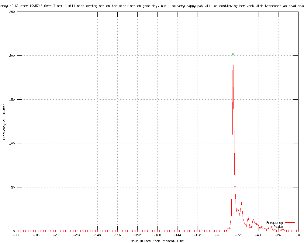 | 18 | i will miss seeing her on the sidelines on game day, but i am very happy pat will be continuing her work with tennessee as head coach emeritus Urls http://wusa9.com/rss/local_article.aspx?storyid=202598 http://indystar.com/article/20120418/SPORTS/120418045 http://theleafchronicle.com/article/20120418/NEWS01/304180019/End-an-era-Pat-Summit-retires?odyssey=nav|head http://theleafchronicle.com/article/20120418/NEWS01/304180019/End-an-era-Pat-Summit-retires?odyssey=tab|topnews|text|FRONTPAGE http://theleafchronicle.com/article/20120418/NEWS01/304180019/End-an-era-Pat-Summit-retires?odyssey=tab|topnews|img|FRONTPAGE http://theleafchronicle.com/article/20120418/NEWS01/304180019/End-of-an-era-Pat-Summit-retires?odyssey=tab|mostpopular|text|FRONTPAGE http://theleafchronicle.com/article/20120418/NEWS01/304180019/End-of-an-era-Pat-Summit-retires?odyssey=tab|mostpopular|img|FRONTPAGE http://theleafchronicle.com/article/20120418/NEWS01/304180019/End-an-era?odyssey=nav|head http://theleafchronicle.com/article/20120418/NEWS01/304180019/End-an-era?odyssey=tab|topnews|img|FRONTPAGE http://theleafchronicle.com/article/20120418/NEWS01/304180019/End-an-era?odyssey=tab|topnews|text|FRONTPAGE http://theleafchronicle.com/article/20120418/NEWS01/304180019/End-of-an-era?odyssey=tab|mostpopular|text|FRONTPAGE http://theleafchronicle.com/article/20120418/NEWS01/304180019/End-of-an-era?odyssey=tab|mostpopular|img|FRONTPAGE http://theleafchronicle.com/article/20120418/NEWS01/304180019/End-an-era-Pat-Summitt-moving-coach-emeritus-role-UT?odyssey=nav|head http://theleafchronicle.com/article/20120418/NEWS01/304180019/End-an-era-Pat-Summitt-moving-coach-emeritus-role-UT?odyssey=tab|topnews|text|FRONTPAGE http://theleafchronicle.com/article/20120418/NEWS01/304180019/End-of-an-era-Pat-Summitt-moving-to-coach-emeritus-role-at-UT?odyssey=tab|mostpopular|img|FRONTPAGE http://theleafchronicle.com/article/20120418/NEWS01/304180019/End-of-an-era-Pat-Summitt-moving-to-coach-emeritus-role-at-UT?odyssey=tab|mostpopular|text|FRONTPAGE http://theleafchronicle.com/article/20120418/NEWS01/304180019/End-an-era-Pat-Summitt-moving-coach-emeritus-role-UT?odyssey=tab|topnews|img|FRONTPAGE http://freep.com/article/20120419/SPORTS08/204190551/1048/sports |