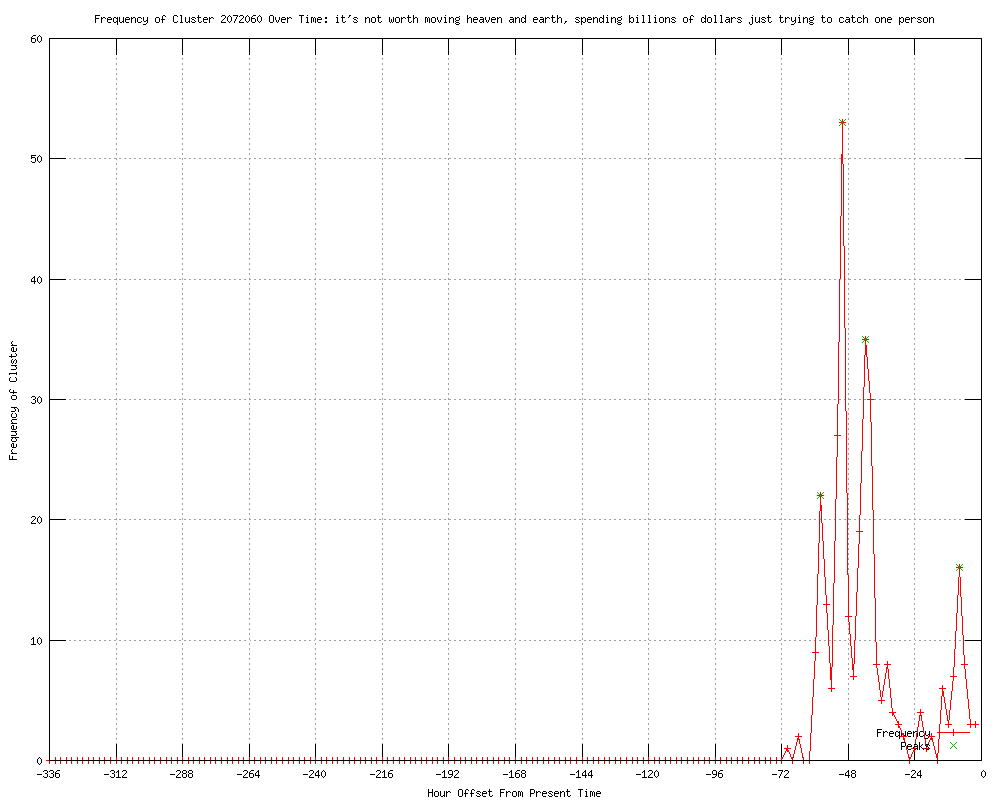 | 18 | not worth moving heaven and earth spending billions of dollars just trying to catch one person Urls http://reuters.com/article/2012/04/27/us-usa-obama-military-idUSBRE83Q19020120427?feedType=RSS&feedName=politicsNews http://news.yahoo.com/obama-sidesteps-bin-laden-death-campaign-embraces-202924058.html http://reuters.com/article/2012/04/27/us-usa-obama-military-idUSBRE83Q19020120427 http://in.reuters.com/article/2012/04/27/usa-obama-military-idINDEE83Q0FJ20120427?feedType=RSS&feedName=worldNews http://my.news.yahoo.com/obama-sidesteps-bin-laden-death-campaign-embraces-204946174.html http://moneycontrol.com/news/wire-news/obama-sidesteps-bin-laden-death-campaign-embraces-it_697987.html http://feeds.reuters.com/%7Er/Reuters/PoliticsNews/%7E3/p5vY8CJnPh8/us-usa-obama-military-idUSBRE83Q19020120427 http://kgmi.com/Obama-sidesteps-bin-Laden-death-campaign-embraces-/11461903?newsId=140091 http://archive.japantoday.com/category/world/view/obama-campaign-ad-touts-decision-to-kill-bin-laden http://trust.org/alertnet/news/obama-sidesteps-bin-laden-death-campaign-embraces-it http://japantoday.com/category/world/view/obama-campaign-ad-touts-decision-to-kill-bin-laden http://allnews.rss.themalaysianinsider.com/c/33362/f/567634/s/1ed09afe/l/0L0Sthemalaysianinsider0N0Cworld0Carticle0Cobama0Esidesteps0Ebin0Eladen0Edeath0Ecampaign0Eembraces0Eit0C/story01.htm http://.canada.com/nanaimodailynews/news/story.html?id=6532611 http://my.news.yahoo.com/obama-campaign-questions-romney-bin-laden-death-003448757.html http://moneycontrol.com/news/wire-news/obama-campaign-questions-romneybin-laden-death_698019.html http://in.reuters.com/article/2012/04/28/usa-obama-military-idINDEE83R00N20120428?feedType=RSS&feedName=worldNews http://trust.org/alertnet/news/obama-campaign-questions-romney-on-bin-laden-death http://thenews.com.pk/article-46462-Obama-campaign-plays-bin-Laden-card |