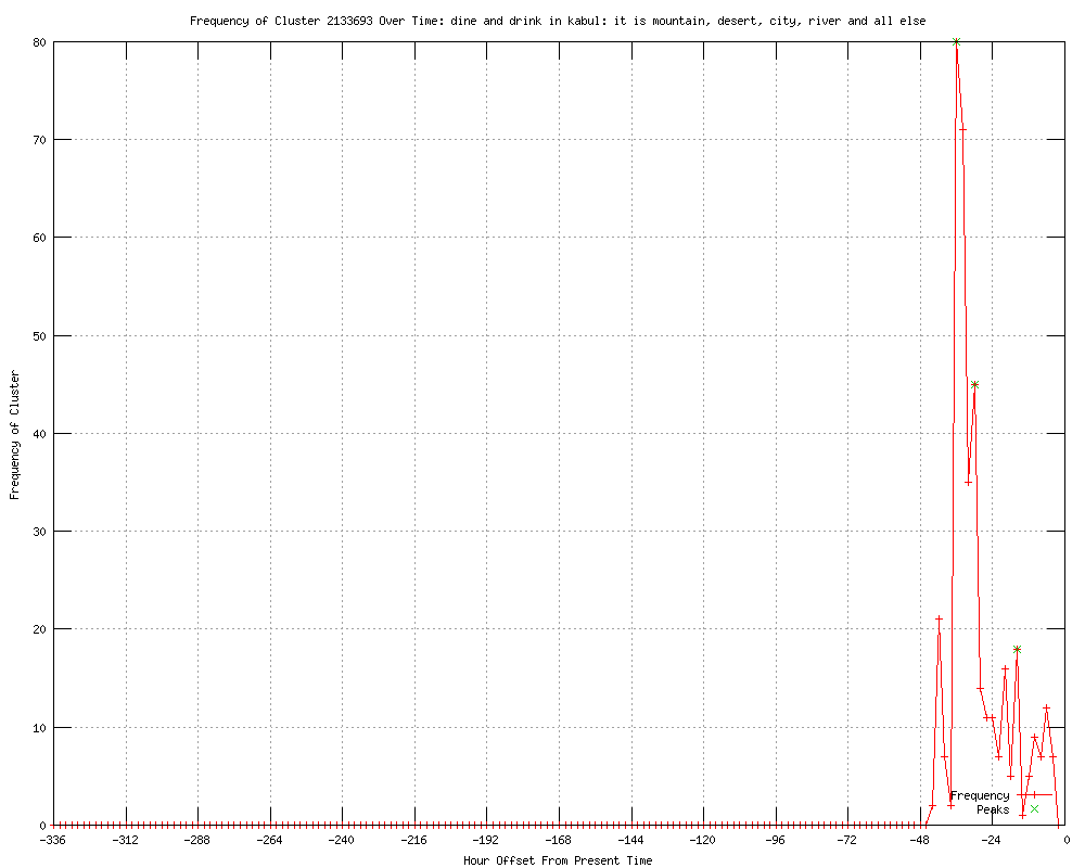 | 5 | dine and drink in kabul: it is mountain, desert, city, river and all else Urls http://article.wn.com/view/2012/05/01/In_Kabul_Obama_highlights_foreign_policy_record_uj/ http://article.wn.com/view/2012/05/01/In_Kabul_Obama_highlights_foreign_policy_record_k/ http://article.wn.com/view/2012/05/02/Trudy_Rubin_Shakespeare_in_Kabul_or_what_Afghans_want/ http://article.wn.com/view/2012/05/02/Explosions_shooting_heard_in_Afghan_capital_z/ http://article.wn.com/view/2012/05/02/Explosions_rock_Kabul/ |