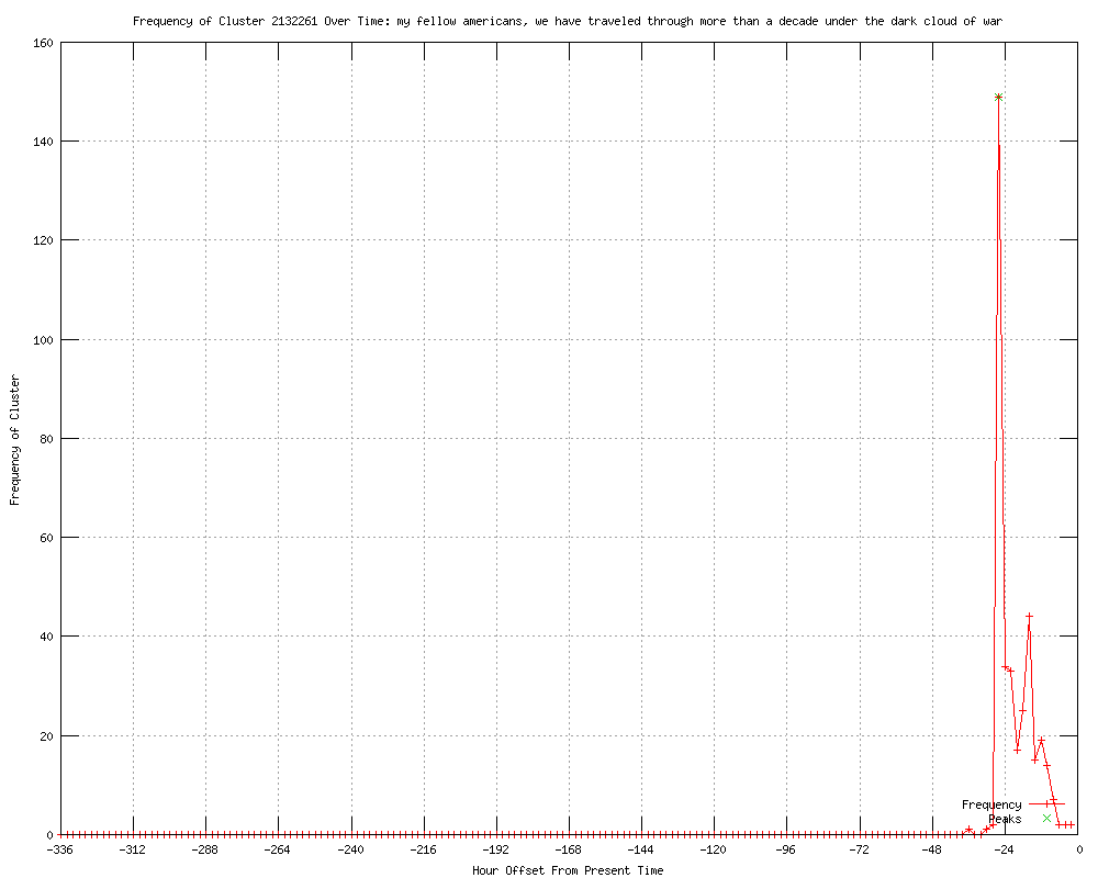 | 39 | my fellow americans, we have traveled through more than a decade under the dark cloud of war Urls http://2012.talkingpointsmemo.com/2012/05/president-obama-points-to-wars-end-in-afghanistan.php http://aljazeera.com/news/asia/2012/05/20125123024682601.html http://globalindigo.com/obama-sees-clear-path-to-end-afghan-mission http://bloomberg.com/news/2012-05-01/obama-says-defeat-of-al-qaeda-within-reach-war-near-end.html http://bloomberg.com/news/2012-05-01/obama-says-with-war-near-end-defeat-of-al-qaeda-in-reach.html http://detroitnews.com/article/20120502/NATION/205020358/1020/rss09 http://buzzfeed.com/zekejmiller/obama-looks-to-end-of-afghanistan-war http://hotair.com/archives/2012/05/01/open-thread-obama-to-celebrate-rare-actual-accomplishment/ http://news.yahoo.com/obama-sees-clear-path-finishing-afghan-mission-230358725.html http://reuters.com/article/2012/05/01/us-afghanistan-obama-speech-excerpts-idUSBRE8401NX20120501 http://rocketnews.com/2012/05/obama-sees-clear-path-to-end-afghan-mission/ http://in.reuters.com/article/2012/05/01/afghanistan-obama-speech-excerpts-idINDEE8400I220120501?feedType=RSS&feedName=southAsiaNews http://aljazeera.com//news/asia/2012/05/20125123024682601.html http://brecorder.com/top-news/1-front-top-news/55679-obama-tells-americans-dark-cloud-of-war-is-lifting-.html http://whitehouse.gov/the-press-office/2012/05/01/excerpts-president-s-address-nation-afghanistan http://businessinsider.com/obama-address-in-afghanistan-2012-5 http://themoderatevoice.com/145771/obama-returning-home-after-secretive-trip-to-afghanistan/ http://Theatlantic.feedsportal.com/c/34375/f/625848/s/1ee9b818/l/0L0Stheatlanticwire0N0Cpolitics0C20A120C0A50Cobama0C517970C/story01.htm http://reuters.com/video/2012/05/02/obama-swoops-into-afghanistan-on-bin-lad?videoId=234287933&videoChannel=1 http://mf.feeds.reuters.com/c/871/f/605700/s/1ee9bf2d/l/0Luk0Breuters0N0Cvideo0C20A120C0A50C0A20Cobama0Eswoops0Einto0Eafghanistan0Eon0Ebin0Elad0DvideoId0F2342879330GfeedType0FVideoRSS0GfeedName0FLatestVideosUK0GvideoChannel0F75/story01.htm http://reuters.com/video/2012/05/02/obama-swoops-into-afghanistan-on-bin-lad?videoId=234287933&newsChannel=newsOne http://uk.reuters.com/video/2012/05/02/obama-swoops-into-afghanistan-on-bin-lad?videoId=234287933&feedType=VideoRSS&feedName=TopNews&videoChannel=75 http://themoderatevoice.com/145771/obama-returning-home-after-secretive-trip-to-afghanistan/?utm_source=feedburner&utm_medium=feed&utm_campaign=Feed%3A+themoderatevoice+%28The+Moderate+Voice%29 http://elitestv.com/pub/2012/05/president-updates-nation-on-afghanistan-mission http://latimes.com/news/nationworld/nation/la-fg-obama-afghan-20120502,0,5543034.story?track=rss http://latimes.com/news/nationworld/world/la-fg-obama-afghan-20120502,0,2346711.story?track=rss http://reuters.com/article/video/idUSBRE8401CJ20120502?videoId=234287933 http://businessmirror.com.ph/home/world/26608-obama-makes-surprise-kabul-visit http://washingtontimes.feedsportal.com/c/34503/f/629300/s/1eecdbbf/l/0L0Swashingtontimes0N0Cnews0C20A120Cmay0C10Cobama0Ein0Ekabul0Eafghan0Ewar0Enear0Ean0Eend0C0Dutm0Isource0FRSS0IFeed0Gutm0Imedium0FRSS/story01.htm http://washingtontimes.feedsportal.com/c/34503/f/629220/s/1eed36c7/l/0L0Swashingtontimes0N0Cnews0C20A120Cmay0C10Cobama0Ein0Ekabul0Eafghan0Ewar0Enear0Ean0Eend0C0Dutm0Isource0FRSS0IFeed0Gutm0Imedium0FRSS/story01.htm http://washingtontimes.feedsportal.com/c/34503/f/629221/s/1ee9d94d/l/0L0Swashingtontimes0N0Cnews0C20A120Cmay0C10Cobama0Ein0Ekabul0Eafghan0Ewar0Enear0Ean0Eend0C0Dutm0Isource0FRSS0IFeed0Gutm0Imedium0FRSS/story01.htm http://in.reuters.com/video/2012/05/02/obama-swoops-into-afghanistan-on-bin-lad?videoId=234287933&feedType=VideoRSS&feedName=LatestVideosIN&videoChannel=101 http://latimes.com/news/la-fg-obama-afghan-20120502,0,6032501.story?track=rss http://latimes.com.feedsportal.com/c/34336/f/625244/s/1eec683e/l/0L0Slatimes0N0Cnews0Cla0Efg0Eobama0Eafghan0E20A120A50A20H0A0H60A3250A10Bstory0Dtrack0Frss/story01.htm http://2scottmontgomery.blogspot.com/2012/05/latimesobama-signs-pact-greets-troops.html http://blogrunner.com/snapshot/D/2/2/obama_pledges_end_to_afghan_war/ http://thundereyez.blogspot.com/2012/05/time-to-run.html http://klpos.com/foreign-news/4142-obama-signs-pact-greets-troops-in-surprise-afghanistan-visit http://forums.catholic.com/showthread.php?t=671244&goto=newpost |