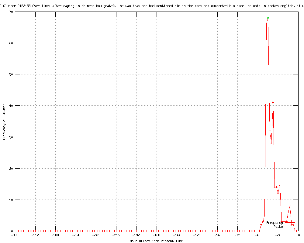 | 18 | after saying in chinese how grateful he was that she had mentioned him in the past and supported his case, he said in broken english, 'i want to kiss you' Urls http://channelnewsasia.com/stories/afp_asiapacific/view/1198828/1/.html http://thehimalayantimes.com/rssReference.php?id=MzMwNDM3 http://trendpk.com/china-activist-quits-us-embassy-after-beijing-deal/159426.html http://thenews.com.pk/article-47095-Chinese-activist-wishes-to-kiss-Clinton- http://sbs.com.au/news/article/1647163/China-allows-Chen-to-stay-in-safe-place http://timesofindia.feedsportal.com/fy/8at2Euq0Z7H0x2IG/story01.htm http://ca.news.yahoo.com/china-activist-leaves-us-embassy-xinhua-075514246.html http://au.news.yahoo.com/a/-/world/13583981/china-activist-appeals-to-obama-to-get-him-to-us/ http://sbs.com.au/news/article/1647223/Chen-appeals-to-Obama-to-get-him-to-US http://sinodaily.com/reports/China_activist_leaves_US_embassy_after_deal_with_Beijing_999.html http://uk.news.yahoo.com/china-activist-appeals-obama-him-us-001909603.html http://ph.news.yahoo.com/china-activist-appeals-obama-him-us-011909594.html http://news.yahoo.com/china-activist-appeals-obama-him-us-011909058.html http://afp.com/en/news/topstories/china-activist-appeals-obama-get-him-us http://feeds.bangkokpost.com/c/33101/f/535952/s/1ef33e28/l/0L0Sbangkokpost0N0Cnews0Casia0C29160A0A0Cchina0Eactivist0Eappeals0Eto0Eobama0Eto0Eget0Ehim0Eto0Eus/story01.htm http://findata.co.nz/News/15586240/China_activist_appeals_to_Obama_to_get_him_to_US.htm http://mysinchew.com/node/73150 http://channelnewsasia.com/stories/afp_asiapacific/view/1198934/1/.html |