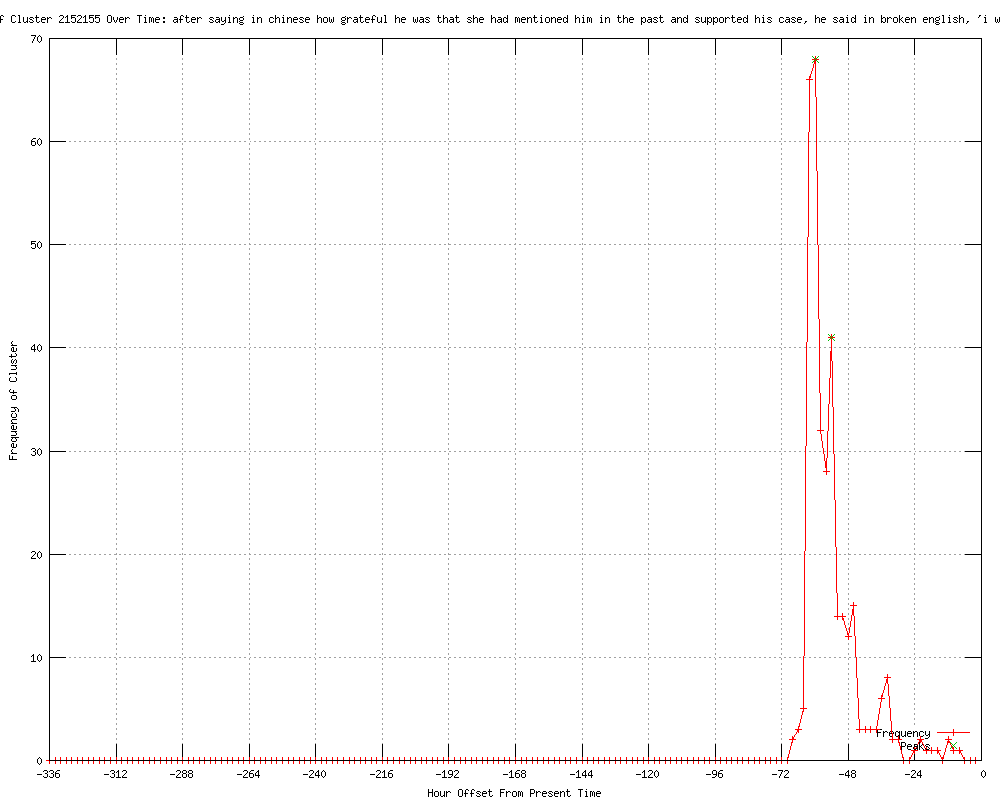 | 18 | after saying in chinese how grateful he was that she had mentioned him in the past and supported his case, he said in broken english, 'i want to kiss you' Urls http://channelnewsasia.com/stories/afp_asiapacific/view/1198828/1/.html http://thehimalayantimes.com/rssReference.php?id=MzMwNDM3 http://trendpk.com/china-activist-quits-us-embassy-after-beijing-deal/159426.html http://thenews.com.pk/article-47095-Chinese-activist-wishes-to-kiss-Clinton- http://sbs.com.au/news/article/1647163/China-allows-Chen-to-stay-in-safe-place http://timesofindia.feedsportal.com/fy/8at2Euq0Z7H0x2IG/story01.htm http://ca.news.yahoo.com/china-activist-leaves-us-embassy-xinhua-075514246.html http://au.news.yahoo.com/a/-/world/13583981/china-activist-appeals-to-obama-to-get-him-to-us/ http://sbs.com.au/news/article/1647223/Chen-appeals-to-Obama-to-get-him-to-US http://sinodaily.com/reports/China_activist_leaves_US_embassy_after_deal_with_Beijing_999.html http://uk.news.yahoo.com/china-activist-appeals-obama-him-us-001909603.html http://ph.news.yahoo.com/china-activist-appeals-obama-him-us-011909594.html http://news.yahoo.com/china-activist-appeals-obama-him-us-011909058.html http://afp.com/en/news/topstories/china-activist-appeals-obama-get-him-us http://feeds.bangkokpost.com/c/33101/f/535952/s/1ef33e28/l/0L0Sbangkokpost0N0Cnews0Casia0C29160A0A0Cchina0Eactivist0Eappeals0Eto0Eobama0Eto0Eget0Ehim0Eto0Eus/story01.htm http://findata.co.nz/News/15586240/China_activist_appeals_to_Obama_to_get_him_to_US.htm http://mysinchew.com/node/73150 http://channelnewsasia.com/stories/afp_asiapacific/view/1198934/1/.html |