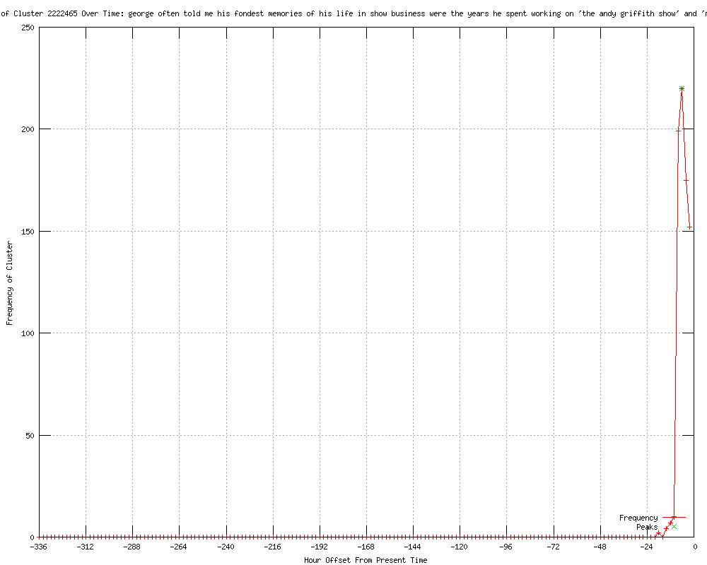 | 25 | george often told me his fondest memories of his life in show business were the years he spent working on 'the andy griffith show' and 'mayberry r.f.d.' Urls http://ktxs.com/entertainment/31018028/detail.html http://cnn.com/2012/05/06/showbiz/george-lindsey-obit/index.html?eref=rss_latest http://kjct8.com/entertainment/31018028/detail.html http://10news.com/entertainment/31018028/detail.html http://nbcmontana.com/entertainment/31018028/detail.html http://ktvz.com/entertainment/31018028/detail.html http://wcti12.com/entertainment/31018028/detail.html http://foxtricities.com/entertainment/31018028/detail.html http://localnews8.com/entertainment/31018028/detail.html http://rss.cnn.com/~r/rss/cnn_topstories/~3/LtlQXrep5e0/index.html http://cnn.com/2012/05/06/showbiz/george-lindsey-obit/index.html?eref=rss_topstories http://al.com/entertainment/index.ssf/2012/05/andy_griffith_remembers_george.html http://diogenes-honest-politician.blogspot.com/2012/05/goober-pyle-actor-george-lindsey-dies.html http://dailytelegraph.com.au/news/breaking-news/andy-griffith-show-actor-george-lindsey-dead-at-83/story-e6freuyi-1226348319188 http://adelaidenow.com.au/news/breaking-news/andy-griffith-show-actor-george-lindsey-dead-at-83/story-e6frea73-1226348319188?from=public_rss http://news.com.au.feedsportal.com/c/34564/f/632387/s/1f0f18a2/l/0L0Snews0N0Bau0Cbreaking0Enews0Candy0Egriffith0Eshow0Eactor0Egeorge0Elindsey0Edead0Eat0E830Cstory0Ee6frfku0A0E12263483191880Dfrom0Fpublic0Irss/story01.htm http://cbs19.tv/story/18158620/goober-pyle-actor-george-lindsey-dies http://ketknbc.com/news/goober-pyle-actor-george-lindsey-dies http://ktla.com/news/landing/ktla-george-lindsey-obit,0,4313062.story?track=rss http://wsbt.com/news/ktla-george-lindsey-obit,0,1188980.story http://wsbt.com/ktla-george-lindsey-obit,0,7475721.story http://wsbt.com/entertainment/ktla-george-lindsey-obit,0,6481632.story http://wsbt.com/news/ktla-george-lindsey-obit,0,1188980.story?track=rss http://cnn.com/2012/05/06/showbiz/george-lindsey-obit/index.html?eref=rss_us http://kmbc.com/kcwe/31018028/detail.html |