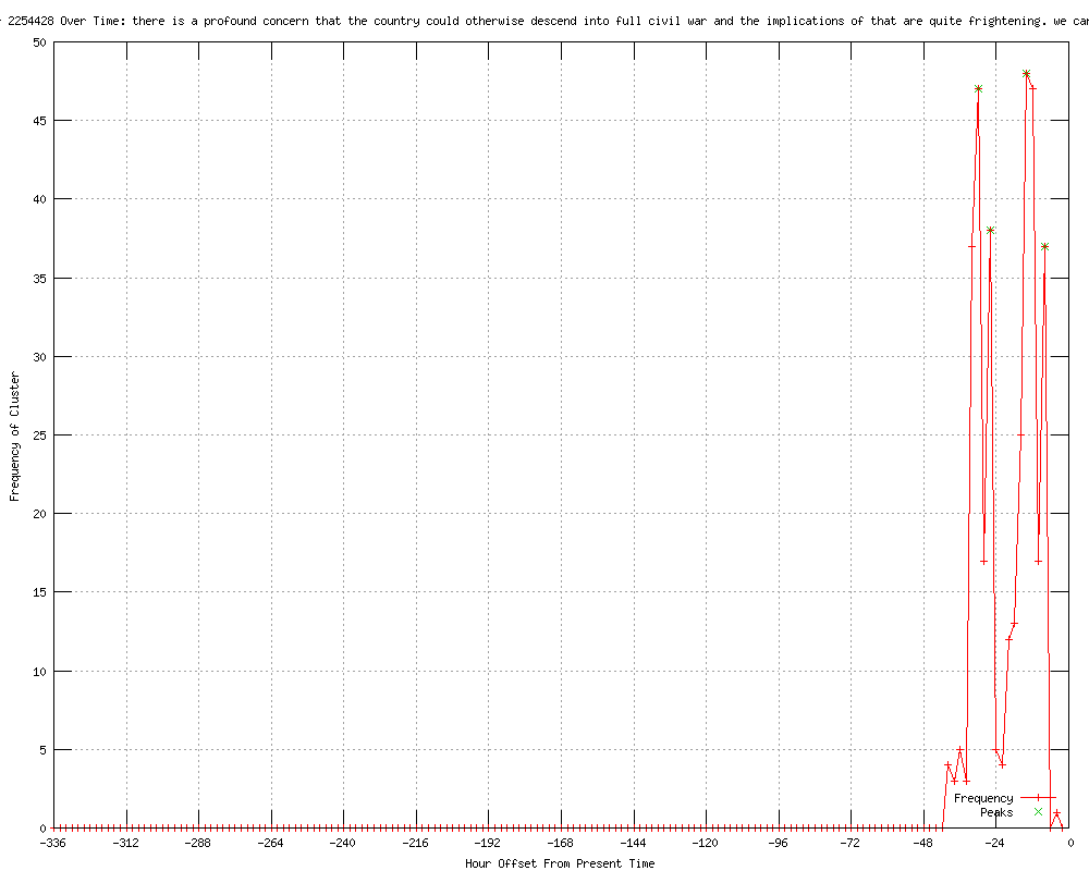 | 56 | there is a profound concern that the country could otherwise descend into full civil war, and the implications of that are frightening Urls http://aljazeera.com/news/middleeast/2012/05/201258173538281971.html http://mwcnews.net/news/middle-east/18749-annan-on-syria.html http://globalindigo.com/annan-sounds-syria-civil-war-warning http://winnipegfreepress.com/breakingnews/international-envoy-kofi-annan-says-un-nations-fear-syria-could-descend-into-full-civil-war-150623755.html http://urbanchristiannews.com/ucn/2012/05/syrian-conflict-transforming-into-a-guerrilla-war-15-million-syrians-at-risk.html http://cjme.com/content/annan-warns-syria-risk-civil-war http://vvdailypress.com/articles/syria-34377-war-annan.html http://newstalk650.com/content/annan-warns-syria-risk-civil-war http://usatoday.com/news/world/story/2012-05-08/syria-fighting/54830330/1?csp=34news&utm_source=feedburner&utm_medium=feed&utm_campaign=Feed:%20UsatodaycomWorld-TopStories%20%28News%20-%20World%20-%20Top%20Stories%29 http://guardian.co.uk/world/feedarticle/10232794 http://cbsnews.com/8301-202_162-57430027/annan-warns-syria-at-risk-of-civil-war/ http://hometownlife.com/usatoday/article/54830330?odyssey=mod|newswell|text|Northville|s http://gulfnews.com/news/region/syria/annan-warns-syria-at-risk-of-civil-war-1.1020399 http://hometownlife.com/usatoday/article/54830330?odyssey=mod|newswell|text|Canton|s http://delmarvanow.com/article/20120508/NEWS01/120508033/WORLD-Kofi-Annan-warns-risk-civil-war-Syria?odyssey=mod|newswell|text||s http://delmarvanow.com/article/20120508/NEWS01/120508033/WORLD-Kofi-Annan-warns-risk-civil-war-Syria?odyssey=tab|topnews|text|frontpage http://delmarvanow.com/article/20120508/NEWS01/120508033/WORLD-Kofi-Annan-warns-risk-civil-war-Syria?odyssey=nav|head http://jamestownsun.com/event/article/id/160471/ http://globalnews.ca/Canada/international+envoy+kofi+annan+says+un+nations+fear+syria+could+descend+into+full+civil+war2/6442636813/story.html http://globalnews.ca/Canada/world+powers+fear+syria+is+descending+into+full-on+civil+war+international+envoy+annan+says/6442636813/story.html http://ajc.com/news/nation-world/kofi-annan-warns-of-1433346.html?cxtype=rss_news_82109 http://thenewstribune.com/2012/05/08/2135752/red-cross-to-visit-second-prison.html?storylink=rss http://idahostatesman.com/2012/05/08/2107594/red-cross-to-visit-second-prison.html#storylink=rss http://theolympian.com/2012/05/08/2096826/red-cross-to-visit-second-prison.html http://kansascity.com/2012/05/08/3600450/red-cross-to-visit-second-prison.html#storylink=rss http://mail.com/news/world/1269544-kofi-annan-warns-risk-civil-war-syria.html http://news.yahoo.com/kofi-annan-warns-risk-civil-war-syria-165831629.html http://guardian.co.uk/world/feedarticle/10232597 http://mail.com/news/world/1269544-annan-warns-syria-risk-civil-war.html http://ajc.com/news/nation-world/annan-warns-syria-at-1433346.html?cxtype=rss_news_82109 http://seattlepi.com/news/article/Annan-warns-Syria-at-risk-of-civil-war-3541560.php http://utsandiego.com/news/2012/may/08/kofi-annan-warns-of-risk-of-civil-war-in-syria/ http://artesianews.com/ap-news/international-ap-news/annan-warns-syria-at-risk-of-civil-war/ http://thestar.com/news/world/article/1174845--syria-fighting-leaves-1-5-million-without-food-shelter-says-red-cross http://news.yahoo.com/annan-warns-syria-risk-civil-war-172402909.html http://newsday.com/news/world/annan-warns-syria-at-risk-of-civil-war-1.3706235 http://ckom.com/content/annan-warns-syria-risk-civil-war http://nydailynews.com/news/world/kofi-annan-warns-syria-descending-civil-war-article-1.1074471?localLinksEnabled=false http://bostonherald.com/news/international/middle_east/view.bg?articleid=1061130168&srvc=rss http://utsandiego.com/news/2012/may/08/annan-warns-syria-at-risk-of-civil-war/ http://cbc.ca/news/world/story/2012/05/08/syria-kofi-annan-civil-war.html http://aljazeera.com//news/middleeast/2012/05/201258173538281971.html http://arkansasonline.com/news/2012/may/08/kofi-annan-warns-risk-civil-war-syria/ http://nwaonline.com/news/2012/may/08/kofi-annan-warns-risk-civil-war-syria/ http://ckom.com/content/kofi-annan-warns-risk-civil-war-syria http://cjme.com/content/kofi-annan-warns-risk-civil-war-syria http://newstalk650.com/content/kofi-annan-warns-risk-civil-war-syria http://independent.co.uk/news/world/middle-east/kofi-annan-warns-of-risk-of-civil-war-in-syria-7723174.html http://foxnews.com/world/2012/05/08/kofi-annan-warns-risk-civil-war-in-syria/ http://ktnv.com/news/national/150632855.html http://feeds.foxnews.com/~r/foxnews/world/~3/xcC2p2tguWA/ http://goerie.com/article/20120509/NEWS07/305099924/UN-envoy-warns-of-civil-war-in-Syria http://hawaiitribune-herald.com/sections/news/world/annan-syria-risks-civil-war.html http://denverpost.com/nationworld/ci_20578000/u-n-envoy-kofi-annan-warns-civil-war?source=rss http://philly.com/r?19=961&43=165776&44=150710545&32=3796&7=195377&40=http%3A%2F%2Fwww.philly.com%2Fphilly%2Fnews%2Fnation_world%2F20120509_In_the_World.html http://warincontext.org/2012/05/09/annan-sounds-syria-civil-war-warning/ |