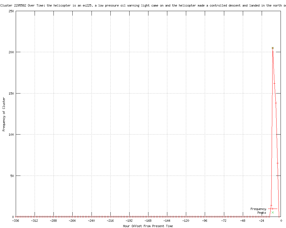 | 5 | the helicopter is an ec225. a low pressure oil warning light came on and the helicopter made a controlled descent and landed in the north sea. it didn't crash Urls http://thesun.co.uk/sol/homepage/news/4308704/Helicopter-crashes-into-North-Sea-with-14-people-on-board.html?OTC-RSS&ATTR=News http://da.feedsportal.com/c/851/f/10838/s/1f38ac81/l/0L0Sirishtimes0N0Cnewspaper0Cbreaking0C20A120C0A510A0Cbreaking310Bhtm/ia1.htm http://thesun.co.uk/sol/homepage/news/4308704/Helicopter-crashes-into-North-Sea-with-14-people-on-board.html http://thesun.co.uk/sol/homepage/news/4308704/Helicopter-ditches-in-North-Sea-with-14-people-on-board.html?OTC-RSS&ATTR=News http://thesun.co.uk/sol/homepage/news/4308704/Helicopter-ditches-in-North-Sea-with-14-people-on-board.html |