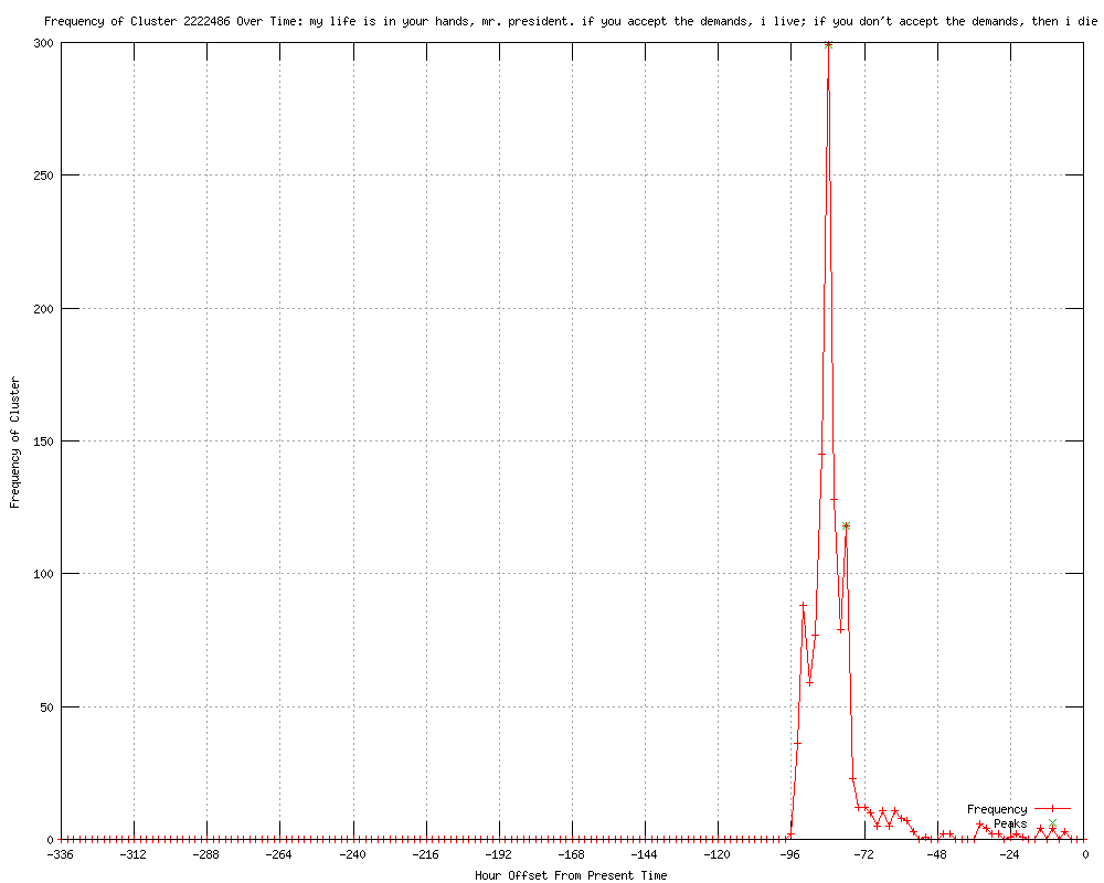 | 450 | if you accept the demands, i live; if you don't accept the demands, then i die Urls http://wkrn.com/story/18159833/al-qaida-releases-video-of-american-hostage http://ktvn.com/story/18159833/al-qaida-releases-video-of-american-hostage http://adelaidenow.com.au/news/breaking-news/us-hostage-weinstein-appears-in-video/story-e6frea73-1226348817194?from=public_rss http://news.com.au.feedsportal.com/c/34564/f/632396/s/1f108043/l/0L0Snews0N0Bau0Cbreaking0Enews0Cus0Ehostage0Eweinstein0Eappears0Ein0Evideo0Cstory0Ee6frfku0A0E12263488171940Dfrom0Fpublic0Irss/story01.htm http://ajc.com/news/nation-world/al-qaida-releases-video-1432600.html?cxtype=rss_sports_82075 http://news.yahoo.com/al-qaida-releases-video-american-hostage-031457830.html http://dailytelegraph.com.au/news/breaking-news/us-hostage-weinstein-appears-in-video/story-e6freuyi-1226348817194 http://ksla.com/story/18159833/al-qaida-releases-video-of-american-hostage http://kcbd.com/story/18159833/al-qaida-releases-video-of-american-hostage http://khnl.com/story/18159833/al-qaida-releases-video-of-american-hostage http://wandtv.com/story/18159833/al-qaida-releases-video-of-american-hostage http://whbf.com/story/18159833/al-qaida-releases-video-of-american-hostage http://kfvs.com/story/18159833/al-qaida-releases-video-of-american-hostage http://wsfa.com/story/18159833/al-qaida-releases-video-of-american-hostage http://nbc12.com/story/18159833/al-qaida-releases-video-of-american-hostage http://kswt.com/story/18159833/al-qaida-releases-video-of-american-hostage http://wmbfnews.com/story/18159833/al-qaida-releases-video-of-american-hostage http://wral.com/news/story/11068799/ http://seattletimes.nwsource.com/html/politics/2018156688_apushostagevideo.html?syndication=rss http://wistv.com/story/18159833/al-qaida-releases-video-of-american-hostage http://ktiv.com/story/18159833/al-qaida-releases-video-of-american-hostage http://news.com.au.feedsportal.com/c/34564/f/632387/s/1f109133/l/0L0Snews0N0Bau0Cbreaking0Enews0Cus0Ehostage0Eweinstein0Eappears0Ein0Evideo0Cstory0Ee6frfku0A0E12263488171940Dfrom0Fpublic0Irss/story01.htm http://news9.com/story/18159833/al-qaida-releases-video-of-american-hostage http://kusi.com/story/18159833/al-qaida-releases-video-of-american-hostage http://feeds.bangkokpost.com/c/33101/f/535952/s/1f10c38b/l/0L0Sbangkokpost0N0Cnews0Casia0C29220A70Cus0Ehostage0Eweinstein0Eappears0Ein0Eqaeda0Evideo0Esite/story01.htm http://newson6.com/story/18159833/al-qaida-releases-video-of-american-hostage http://wlox.com/story/18159833/al-qaida-releases-video-of-american-hostage http://wgem.com/story/18159833/al-qaida-releases-video-of-american-hostage http://wbtv.com/story/18159833/al-qaida-releases-video-of-american-hostage http://kswo.com/story/18159833/al-qaida-releases-video-of-american-hostage http://wdam.com/story/18159833/al-qaida-releases-video-of-american-hostage http://wtol.com/story/18159833/al-qaida-releases-video-of-american-hostage http://foxnews.com/us/2012/05/06/al-qaida-releases-video-american-hostage/ http://foxnews.com/world/2012/05/06/al-qaeda-releases-video-american-hostage/ http://waff.com/story/18159833/al-qaida-releases-video-of-american-hostage http://wten.com/story/18159833/al-qaida-releases-video-of-american-hostage http://wric.com/story/18159833/al-qaida-releases-video-of-american-hostage http://archive.japantoday.com/category/world/view/al-qaida-releases-video-of-american-hostage-in-pakistan http://abc40.com/story/18159833/al-qaida-releases-video-of-american-hostage http://wthr.com/story/18159833/al-qaida-releases-video-of-american-hostage http://kwes.com/story/18159833/al-qaida-releases-video-of-american-hostage http://knoe.com/story/18159833/al-qaida-releases-video-of-american-hostage http://wxvt.com/Global/story.asp?S=18159833 http://wlbt.com/story/18159833/al-qaida-releases-video-of-american-hostage http://japantoday.com/category/world/view/al-qaida-releases-video-of-american-hostage-in-pakistan http://wboc.com/story/18159833/al-qaida-releases-video-of-american-hostage http://kcautv.com/story/18159833/al-qaida-releases-video-of-american-hostage http://klkntv.com/story/18159833/al-qaida-releases-video-of-american-hostage http://cbsnews.com/8301-202_162-57428837/warren-weinstein-u.s-man-held-hostage-by-al-qaeda-appeals-to-obama-in-video/ http://bluestarchronicles.com/2012/05/06/warren-weinstein-american-hostage-held-by-al-qaeda-pleads-with-obama-video/ http://timesofindia.feedsportal.com/fy/8at2EuL0ZH6Fi2K6/story01.htm http://mail.com/news/politics/1266016-al-qaida-releases-video-american-hostage.html http://sfgate.com/cgi-bin/article.cgi?f=/n/a/2012/05/06/national/w201353D55.DTL&feed=rss.news_nation http://kdwn.com/news/national-news/Al-Qaida_releases_video_of_American_hostage http://guardian.co.uk/world/feedarticle/10230287 http://startribune.com/world/150380485.html http://wrhi.com/2012/05/us-hostage-says-he-will-be-killed-unless-obama-agrees-to-al-qaida-demands-41239?utm_source=rss&utm_medium=rss&utm_campaign=us-hostage-says-he-will-be-killed-unless-obama-agrees-to-al-qaida-demands http://wrhi.com/2012/05/us-hostage-says-he-will-be-killed-unless-obama-agrees-to-al-qaida-demands-41238?utm_source=rss&utm_medium=rss&utm_campaign=us-hostage-says-he-will-be-killed-unless-obama-agrees-to-al-qaida-demands http://newser.com/story/145484/al-qaeda-releases-video-of-us-hostage.html http://inforum.com/event/article/id/359982/group/homepage/ http://huffingtonpost.com/2012/05/07/warren-weinstein-kidnapped-pakistan-video_n_1493159.html http://zeenews.india.com/news/south-asia/american-kidnapped-in-pakistan-appears-in-video_773674.html http://deccanchronicle.com/channels/world/north-america/al-qaeda-releases-video-american-hostage-303 http://nydailynews.com/news/world/al-qaeda-releases-video-american-hostage-warren-weinstein-killed-president-obama-agrees-demands-article-1.1073634?localLinksEnabled=false http://eurasiareview.com/07052012-al-qaida-video-shows-us-hostage/ http://godlikeproductions.com/forum1/message186