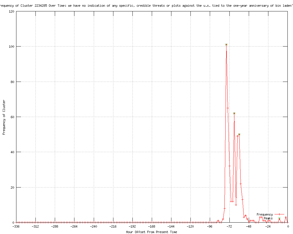 | 16 | we have no indication of any specific, credible threats or plots against the us tied to the one-year anniversary of bin laden's death Urls http://stuff.co.nz/world/middle-east/6879290/Undetectable-al-Qaeda-bomb-plot-thwarted http://stuff.co.nz/timaru-herald/world/6879290/Undetectable-al-Qaeda-bomb-plot-thwarted http://timesofindia.indiatimes.com/world/us/Al-Qaidas-underwear-bomb-plot-to-attack-plane-foiled-US/articleshow/13047093.cms http://stuff.co.nz/timaru-herald/world/6879290/New-al-Qaeda-underwear-bomb-plot-thwarted http://24.com.feedsportal.com/c/33816/f/607927/s/1f18f7f8/l/0L0Snews240N0CWorld0CNews0CUS0Ethwarts0Enew0Eal0EQaeda0Eplane0Ebomb0Eplot0E20A120A50A7/story01.htm http://stuff.co.nz/world/middle-east/6879290/New-al-Qaeda-underwear-bomb-plot-thwarted http://news24.com/World/News/US-thwarts-new-al-Qaeda-plane-bomb-plot-20120507 http://iran-daily.com/1391/2/20/MainPaper/4228/Page/10/?NewsID=65013 http://iran-daily.com/1391/2/20/MainPaper/4228/Page/10/?NewsID=65010 http://iran-daily.com/1391/2/20/MainPaper/4228/Page/10/?NewsID=65012 http://iran-daily.com/1391/2/20/MainPaper/4228/Page/10/?NewsID=65009 http://iran-daily.com/1391/2/20/MainPaper/4228/Page/10/?NewsID=65008 http://iran-daily.com/1391/2/20/MainPaper/4228/Page/10/?NewsID=65007 http://da.feedsportal.com/c/33039/f/555218/s/173288cf/l/0Ltimesofindia0Bindiatimes0N0Cworld0Cus0CAl0EQaidas0Eunderwear0Ebomb0Eplot0Eto0Eattack0Eplane0Efoiled0EUS0Carticleshow0C130A470A930Bcms/ia1.htm http://news4u.co.in/2012/05/commission-lifts-travel-restriction-on-laden-family/ http://ghanamma.com/2012/05/fbi-confirms-seizure-of-al-qaida-explosive-device-destined-for-us/ |
