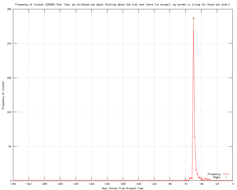 | 4 | my childhood was about thinking about the kids over there [in europe]. my burden is living for those who didn't Urls http://aljazeera.com/news/americas/2012/05/201258135141777184.html http://mwcnews.net/news/americas/18750-sendak-dies.html http://globalindigo.com/writer-and-illustrator-maurice-sendak-dies http://scmp.com/portal/site/SCMP/menuitem.2af62ecb329d3d7733492d9253a0a0a0/?vgnextoid=5550fe78e6d27310VgnVCM100000360a0a0aRCRD&ss=asia%20world&s=news |