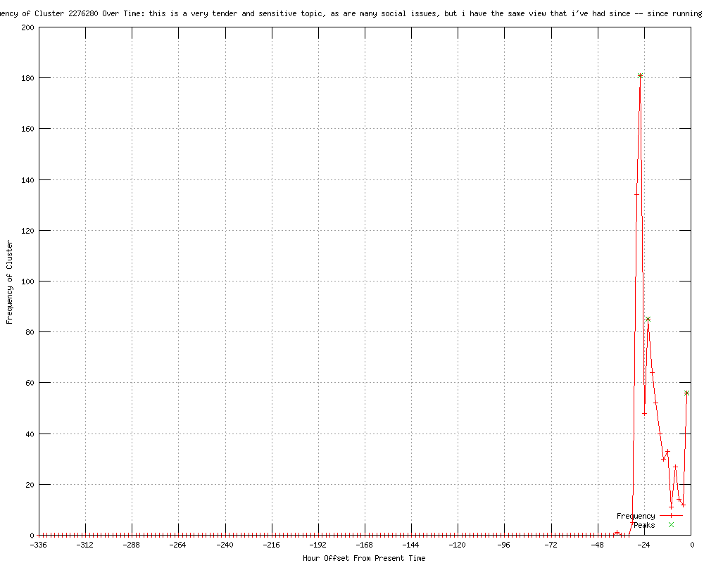 | 103 | this is a very tender and sensitive topic, as are many social issues Urls http://abcnews.go.com/blogs/politics/2012/05/pm-note-abc-exclusive-obama-supports-gay-marriage-a-16-year-evolution-a-one-issue-news-cycle/ http://feeds.abcnews.com/click.phdo?i=bdf48bd5169a5c619660648eeca3f476 http://thedailybeast.com/articles/2012/05/10/how-president-obama-in-six-days-decided-to-come-out-for-gay-marriage.html http://news.yahoo.com/mitt-romney-opposed-gay-marriage-stops-short-labeling-213534514--abc-news-politics.html http://washingtonpost.com/blogs/election-2012/post/romney-in-oklahoma-calls-same-sex-marriage-a-very-tender-and-sensitive-topic/2012/05/09/gIQASPHxDU_blog.html?wprss=rss_campaigns http://abcnews.go.com/blogs/politics/2012/05/mitt-romney-opposed-to-gay-marriage-stops-short-of-labeling-obama-a-flip-flopper/ http://washingtonpost.com/blogs/election-2012/post/romney-in-oklahoma-calls-same-sex-marriage-a-very-tender-and-sensitive-topic/2012/05/09/gIQASPHxDU_blog.html?wprss=rss_politics http://news.yahoo.com/obama-making-cultural-waves-just-ripple-065614952.html http://wbal.com/article/ap?articleurl=http%3a%2f%2fhosted.ap.org%2fdynamic%2fstories%2fU%2fUS_GAY_MARRIAGE_SHIFTING_CULTURE%3fSITE%3dWBAL%26SECTION%3dHOME%26TEMPLATE%3dDEFAULT http://kentucky.com/2012/05/10/2182508/obama-making-cultural-waves-or.html#storylink=rss http://heraldonline.com/2012/05/10/3962436/obama-making-cultural-waves-or.html#storylink=rss http://newsvine.com/_news/2012/05/10/11631060-obama-making-cultural-waves-or-just-a-ripple http://boston.com/news/education/higher/articles/2012/05/10/obama_making_cultural_waves_or_just_a_ripple?rss_id=Boston.com+--+Latest+news http://wrcbtv.com/story/18248971/obama-making-cultural-waves-or-just-a-ripple http://guardian.co.uk/world/feedarticle/10235081 http://guardian.co.uk/world/feedarticle/10235056 http://news-leader.com/usatoday/article/39244153?odyssey=mod|newswell|text|FRONTPAGE|p http://news-leader.com/usatoday/article/39244153?odyssey=mod|newswell|img|FRONTPAGE|p http://chron.com/news/article/Obama-making-cultural-waves-or-just-a-ripple-3547581.php http://foxnews.com/us/2012/05/10/obama-making-cultural-waves-or-just-ripple/ http://kansascity.com/2012/05/10/3603938/obama-making-cultural-waves-or.html#storylink=rss http://msnbc.msn.com/id/47366546 http://mail.com/news/politics/1275404-obama-making-cultural-waves-ripple.html http://wsbradio.com/ap/ap/defense/obama-making-cultural-waves-or-just-a-ripple/nNz6b/ http://chron.com/news/article/Obama-making-cultural-waves-or-just-a-ripple-3547580.php http://longislandpress.com/2012/05/10/obama-making-cultural-waves-or-just-a-ripple/ http://seattletimes.nwsource.com/html/politics/2018177370_apusgaymarriageshiftingculture.html?syndication=rss http://wmal.com/Article.asp?id=2453102 http://ktvn.com/story/18248971/obama-making-cultural-waves-or-just-a-ripple http://koamtv.com/story/18248971/obama-making-cultural-waves-or-just-a-ripple http://khnl.com/story/18248971/obama-making-cultural-waves-or-just-a-ripple http://wect.com/story/18248971/obama-making-cultural-waves-or-just-a-ripple http://kwwl.com/story/18248971/obama-making-cultural-waves-or-just-a-ripple http://kusi.com/story/18248971/obama-making-cultural-waves-or-just-a-ripple http://ktiv.com/story/18248971/obama-making-cultural-waves-or-just-a-ripple http://wistv.com/story/18248971/obama-making-cultural-waves-or-just-a-ripple http://wrex.com/story/18248971/obama-making-cultural-waves-or-just-a-ripple http://newson6.com/story/18248971/obama-making-cultural-waves-or-just-a-ripple http://whbf.com/story/18248971/obama-making-cultural-waves-or-just-a-ripple http://sent-trib.com/ap-news/obama-making-cultural-waves-or-just-a-ripple http://wgem.com/story/18248971/obama-making-cultural-waves-or-just-a-ripple http://kwqc.com/story/18248971/obama-making-cultural-waves-or-just-a-ripple http://kswt.com/story/18248971/obama-making-cultural-waves-or-just-a-ripple http://wmbfnews.com/story/18248971/obama-making-cultural-waves-or-just-a-ripple http://wkrn.com/story/18248971/obama-making-cultural-waves-or-just-a-ripple http://wbtv.com/story/18248971/obama-making-cultural-waves-or-just-a-ripple http://wten.com/story/18248971/obama-making-cultural-waves-or-just-a-ripple http://kwes.com/story/18248971/obama-making-cultural-waves-or-just-a-ripple http://wric.com/story/18248971/obama-making-cultural-waves-or-just-a-ripple http://knoe.com/story/18248971/obama-making-cultural-waves-or-just-a-ripple http://news9.com/story/18248971/obama-making-cultural-waves-or-just-a-ripple http://wlbt.com/story/18248971/obama-making-cultural-waves-or-just-a-ripple http://guardian.co.uk/world/feedarticle/10235250 http://kmph.com/story/18248971/obama-making-cultural-waves-or-just-a-ripple http://wthr.com/story/18248971/obama-making-cultural-waves-or-just-a-ripple http://live5news.com/story/18248971/obama-making-cultural-waves-or-just-a-ripple http://kxxv.com/story/18248971/obama-making-cultural-waves-or-just-a-ripple http://svherald.com/associatedpress/263549 http://kcbd.com/story/18248971/obama-making-cultural-waves-or-just-a-ripple http://wandtv.com/story/18248971/obama-making-cultural-waves-or-just-a-ripple http://wbay.com/story/18248971/obama-making-cultural-waves-or-just-a-ripple http://wrhi.com/2012/05/first-president-to-endorse-gay-marriage-making-history-or-flowing-along-with-it-2-41890?utm_source=rss&utm_medium=rss&utm_campaign=first-president-to-endorse-gay-marriage-making-history-or-flowing-along-with-it-2 http://salon.com/2012/05/10/obama_making_cultural_waves_or_just_a_ripple/ http://blackpoliticsontheweb.com/2012/05/10/obama-making-cultural-waves-or-just-a-ripple/ http://news-sentinel.com/apps/pbcs.dll/article?AID=/20120510/AP01/305109960 http://wmal.com/article.asp?id=2453102&SPID=28718 http://bellinghamherald.com/2012/05/09/2516476/obama-making-cultural-waves-or.html http://ckom.com/content/obama-making-cultural-waves-or-just-ripple http://cjme.com/content/obama-making-cultural-waves-or-just-ripple 