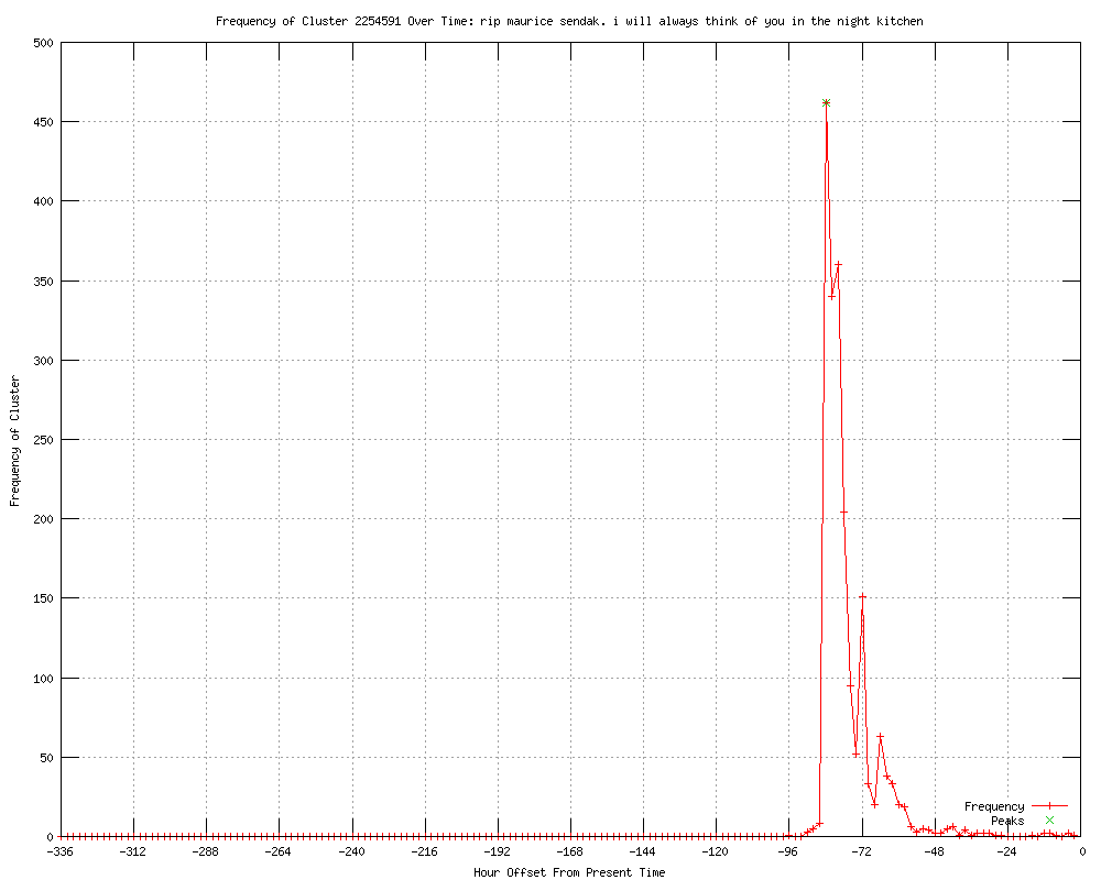 | 32 | rip maurice sendak. i will always think of you in the night kitchen Urls http://salon.com/2012/05/08/maurice_sendak_remembered_by_authors_celebrities/ http://wonderwall.msn.com/entertainment/maurice-sendak-remembered-by-authors-celebrities-1680712.story http://wrcbtv.com/story/18199398/maurice-sendak-remembered-by-authors-celebrities http://wten.com/story/18199398/maurice-sendak-remembered-by-authors-celebrities http://wlbt.com/story/18199398/maurice-sendak-remembered-by-authors-celebrities http://wtol.com/story/18199398/maurice-sendak-remembered-by-authors-celebrities http://daytondailynews.com/entertainment/maurice-sendak-remembered-by-authors-celebrities-1372425.html?cxtype=rss_entertainment http://utsandiego.com/news/2012/may/08/maurice-sendak-remembered-by-authors-celebrities/ http://power953.com/ap/ap/entertainment/maurice-sendak-remembered-by-authors-celebrities/nNy2j/ http://star94fm.com/ap/ap/entertainment/maurice-sendak-remembered-by-authors-celebrities/nNy2j/ http://entertainment.msn.com/news/article.aspx?news=726755&affid=100055 http://wral.com/entertainment/story/11077167/ http://theolympian.com/2012/05/08/2097308/maurice-sendak-remembered-by-authors.html http://miamiherald.com/2012/05/08/2789624/maurice-sendak-remembered-by-authors.html http://omg.yahoo.com/news/maurice-sendak-remembered-authors-celebrities-184731654.html http://rss.feedsportal.com/c/32545/f/492401/p/1/s/66c68847/l/0L0Sdigitalspy0O0Cshowbiz0Cnews0Ca380A5610Cmaurice0Esendak0E19280E20A120Etributes0Eand0Ereaction0Bhtml0Drss/story01.htm http://.wsls.com/news/2012/may/08/maurice-sendak-remembered-by-authors-celebrities-ar-1900106/ http://newsvine.com/_news/2012/05/08/11601422-maurice-sendak-remembered-by-authors-celebrities http://seattletimes.nwsource.com/html/entertainment/2018165402_apusmauricesendakreactions.html?syndication=rss http://dfw.com/2012/05/08/619383/maurice-sendak-remembered-by-authors.html http://news.theage.com.au/breaking-news-technology/maurice-sendak-remembered-by-authors-celebrities-20120509-1ybnr.html http://news.smh.com.au/breaking-news-technology/maurice-sendak-remembered-by-authors-celebrities-20120509-1ybnr.html http://news.brisbanetimes.com.au/breaking-news-technology/maurice-sendak-remembered-by-authors-celebrities-20120509-1ybnr.html http://goerie.com/apps/pbcs.dll/article?AID=/20120508/APA/1205080883 http://cbs3springfield.com/story/18199398/maurice-sendak-remembered-by-authors-celebrities http://sfgate.com/cgi-bin/article.cgi?f=/n/a/2012/05/08/national/a114724D85.DTL&feed=rss.news_nation http://guardian.co.uk/world/feedarticle/10232803 http://foxprovidence.com/dpps/entertainment/celebrity_news/maurice-sendak-remembered-by-authors-celebritieset12-tvw_4167029 http://cbsnews.com/8301-502927_162-57430256/maurice-sendak-remembered-by-authors-celebrities/ http://.wsls.com/entertainment/2012/may/08/maurice-sendak-remembered-by-authors-celebrities-ar-1900106/ http://longislandpress.com/2012/05/08/maurice-sendak-remembered-by-authors-celebrities/ http://broadcastnewsroom.com/articles/viewarticle.jsp?id=2013494 |