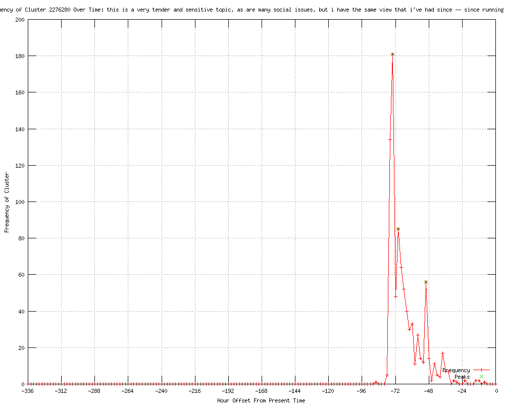 | 116 | this is a very tender and sensitive topic, as are many social issues Urls http://abcnews.go.com/blogs/politics/2012/05/pm-note-abc-exclusive-obama-supports-gay-marriage-a-16-year-evolution-a-one-issue-news-cycle/ http://feeds.abcnews.com/click.phdo?i=bdf48bd5169a5c619660648eeca3f476 http://thedailybeast.com/articles/2012/05/10/how-president-obama-in-six-days-decided-to-come-out-for-gay-marriage.html http://news.yahoo.com/mitt-romney-opposed-gay-marriage-stops-short-labeling-213534514--abc-news-politics.html http://washingtonpost.com/blogs/election-2012/post/romney-in-oklahoma-calls-same-sex-marriage-a-very-tender-and-sensitive-topic/2012/05/09/gIQASPHxDU_blog.html?wprss=rss_campaigns http://abcnews.go.com/blogs/politics/2012/05/mitt-romney-opposed-to-gay-marriage-stops-short-of-labeling-obama-a-flip-flopper/ http://washingtonpost.com/blogs/election-2012/post/romney-in-oklahoma-calls-same-sex-marriage-a-very-tender-and-sensitive-topic/2012/05/09/gIQASPHxDU_blog.html?wprss=rss_politics http://news.yahoo.com/obama-making-cultural-waves-just-ripple-065614952.html http://wbal.com/article/ap?articleurl=http%3a%2f%2fhosted.ap.org%2fdynamic%2fstories%2fU%2fUS_GAY_MARRIAGE_SHIFTING_CULTURE%3fSITE%3dWBAL%26SECTION%3dHOME%26TEMPLATE%3dDEFAULT http://kentucky.com/2012/05/10/2182508/obama-making-cultural-waves-or.html#storylink=rss http://heraldonline.com/2012/05/10/3962436/obama-making-cultural-waves-or.html#storylink=rss http://newsvine.com/_news/2012/05/10/11631060-obama-making-cultural-waves-or-just-a-ripple http://boston.com/news/education/higher/articles/2012/05/10/obama_making_cultural_waves_or_just_a_ripple?rss_id=Boston.com+--+Latest+news http://wrcbtv.com/story/18248971/obama-making-cultural-waves-or-just-a-ripple http://guardian.co.uk/world/feedarticle/10235081 http://guardian.co.uk/world/feedarticle/10235056 http://news-leader.com/usatoday/article/39244153?odyssey=mod|newswell|text|FRONTPAGE|p http://news-leader.com/usatoday/article/39244153?odyssey=mod|newswell|img|FRONTPAGE|p http://chron.com/news/article/Obama-making-cultural-waves-or-just-a-ripple-3547581.php http://foxnews.com/us/2012/05/10/obama-making-cultural-waves-or-just-ripple/ http://kansascity.com/2012/05/10/3603938/obama-making-cultural-waves-or.html#storylink=rss http://msnbc.msn.com/id/47366546 http://mail.com/news/politics/1275404-obama-making-cultural-waves-ripple.html http://wsbradio.com/ap/ap/defense/obama-making-cultural-waves-or-just-a-ripple/nNz6b/ http://chron.com/news/article/Obama-making-cultural-waves-or-just-a-ripple-3547580.php http://longislandpress.com/2012/05/10/obama-making-cultural-waves-or-just-a-ripple/ http://seattletimes.nwsource.com/html/politics/2018177370_apusgaymarriageshiftingculture.html?syndication=rss http://wmal.com/Article.asp?id=2453102 http://ktvn.com/story/18248971/obama-making-cultural-waves-or-just-a-ripple http://koamtv.com/story/18248971/obama-making-cultural-waves-or-just-a-ripple http://khnl.com/story/18248971/obama-making-cultural-waves-or-just-a-ripple http://wect.com/story/18248971/obama-making-cultural-waves-or-just-a-ripple http://kwwl.com/story/18248971/obama-making-cultural-waves-or-just-a-ripple http://kusi.com/story/18248971/obama-making-cultural-waves-or-just-a-ripple http://ktiv.com/story/18248971/obama-making-cultural-waves-or-just-a-ripple http://wistv.com/story/18248971/obama-making-cultural-waves-or-just-a-ripple http://wrex.com/story/18248971/obama-making-cultural-waves-or-just-a-ripple http://newson6.com/story/18248971/obama-making-cultural-waves-or-just-a-ripple http://whbf.com/story/18248971/obama-making-cultural-waves-or-just-a-ripple http://sent-trib.com/ap-news/obama-making-cultural-waves-or-just-a-ripple http://wgem.com/story/18248971/obama-making-cultural-waves-or-just-a-ripple http://kwqc.com/story/18248971/obama-making-cultural-waves-or-just-a-ripple http://kswt.com/story/18248971/obama-making-cultural-waves-or-just-a-ripple http://wmbfnews.com/story/18248971/obama-making-cultural-waves-or-just-a-ripple http://wkrn.com/story/18248971/obama-making-cultural-waves-or-just-a-ripple http://wbtv.com/story/18248971/obama-making-cultural-waves-or-just-a-ripple http://wten.com/story/18248971/obama-making-cultural-waves-or-just-a-ripple http://kwes.com/story/18248971/obama-making-cultural-waves-or-just-a-ripple http://wric.com/story/18248971/obama-making-cultural-waves-or-just-a-ripple http://knoe.com/story/18248971/obama-making-cultural-waves-or-just-a-ripple http://news9.com/story/18248971/obama-making-cultural-waves-or-just-a-ripple http://wlbt.com/story/18248971/obama-making-cultural-waves-or-just-a-ripple http://guardian.co.uk/world/feedarticle/10235250 http://kmph.com/story/18248971/obama-making-cultural-waves-or-just-a-ripple http://wthr.com/story/18248971/obama-making-cultural-waves-or-just-a-ripple http://live5news.com/story/18248971/obama-making-cultural-waves-or-just-a-ripple http://kxxv.com/story/18248971/obama-making-cultural-waves-or-just-a-ripple http://svherald.com/associatedpress/263549 http://kcbd.com/story/18248971/obama-making-cultural-waves-or-just-a-ripple http://wandtv.com/story/18248971/obama-making-cultural-waves-or-just-a-ripple http://wbay.com/story/18248971/obama-making-cultural-waves-or-just-a-ripple http://wrhi.com/2012/05/first-president-to-endorse-gay-marriage-making-history-or-flowing-along-with-it-2-41890?utm_source=rss&utm_medium=rss&utm_campaign=first-president-to-endorse-gay-marriage-making-history-or-flowing-along-with-it-2 http://salon.com/2012/05/10/obama_making_cultural_waves_or_just_a_ripple/ http://blackpoliticsontheweb.com/2012/05/10/obama-making-cultural-waves-or-just-a-ripple/ http://news-sentinel.com/apps/pbcs.dll/article?AID=/20120510/AP01/305109960 http://wmal.com/article.asp?id=2453102&SPID=28718 http://bellinghamherald.com/2012/05/09/2516476/obama-making-cultural-waves-or.html http://ckom.com/content/obama-making-cultural-waves-or-just-ripple http://cjme.com/content/obama-making-cultural-waves-or-just-ripple 