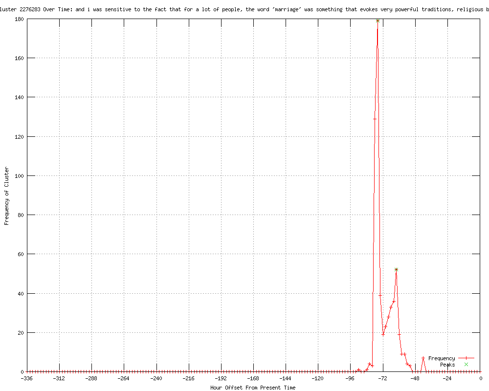 | 49 | i was sensitive to the fact that for a lot of people the word `marriage' was something that invokes very powerful traditions, religious beliefs and so forth Urls http://abclocal.go.com/ktrk/story?section=news/national_world&id=8655025&rss=rss-ktrk-article-8655025 http://kval.com/politics/Obama-voices-his-support-for-gay-marriage-150820215.html http://wbal.com/article/ap?articleurl=http%3a%2f%2fhosted.ap.org%2fdynamic%2fstories%2fU%2fUS_OBAMA_GAY_MARRIAGE%3fSITE%3dWBAL%26SECTION%3dHOME%26TEMPLATE%3dDEFAULT http://dailymail.com/rssFeeds/201205090113 http://utsandiego.com/news/2012/may/09/obama-voices-his-support-for-gay-marriage/ http://wkyc.com/news/news_article.aspx?storyid=244431 http://reporternews.com/news/2012/may/09/obama-voices-his-support-gay-marriage/ http://dailyherald.com/article/20120509/news/705099777/ http://news-gazette.com/news/living/2012-05-09/obama-voices-his-support-gay-marriage.html http://azfamily.com/home/Obama-voices-his-support-for-gay-marriage-150827545.html http://dispatch.com/content/stories/national_world/2012/05/09/obama-voices-his-support-for-gay-marriage.html http://macombdaily.com/article/20120509/NEWS06/120509455/obama-voices-his-support-for-gay-marriage http://dailytribune.com/article/20120509/NEWS06/120509515/obama-voices-his-support-for-gay-marriage http://woai.com:80/news/local/story/Obama-voices-his-support-for-gay-marriage/oDdz54iC_USbpwFLUYLYcg.cspx?rss=68 http://wkyc.com/news/national/244431/22/Obama-voices-his-support-for-gay-marriage http://thechurchreport.com/index.cfm?objectID=154187 http://kimatv.com/politics/Obama-voices-his-support-for-gay-marriage-150820215.html http://kboi2.com/news/national/Obama-voices-his-support-for-gay-marriage-150820215.html http://postandcourier.com/article/20120509/PC16/120509125&source=RSS http://kdwn.com/news/top-news/Obama_voices_his_support_for_gay_marriage http://kdwn.com/news/national-news/Obama_voices_his_support_for_gay_marriage http://woai.com:80/news/local/story/POLL-Obamas-support-for-gay-marriage/oDdz54iC_USbpwFLUYLYcg.cspx?rss=68 http://ksl.com?nid=157&sid=20301485&s_cid=rss-157 http://wkyc.com/news/article/244431/45/Obama-voices-his-support-for-gay-marriage?odyssey=tab|topnews|bc|large http://durangoherald.com/article/20120509/NEWS03/705099853&source=RSS http://wkyc.com/news/article/244431/22/Obama-voices-his-support-for-gay-marriage http://wwl.com/Obama--Same-sex-marriage-should-be-legal/13080230 http://wwl.com/pages/13080230.php http://radio.foxnews.com/2012/05/09/audio-obama-supporter-angry-with-presidents-gay-marriage-flip-flop/ http://sun-sentinel.com/fl-obama-gay-marriage-florida-20120509,0,3660866.story?track=rss http://radio.foxnews.com/2012/05/09/president-obamas-evolving-history-on-gay-marriage/ http://kron.com/Article.aspx?ArticleID=4087 http://kvue.com/home/Obama-voices-his-support-for-gay-marriage-150823265.html http://wwltv.com/home/Obama-voices-his-support-for-gay-marriage-150820145.html http://katu.com/politics/national/150820215.html http://cbc.ca/news/politics/story/2012/05/09/obama-same-sex-marriage-legal.html http://cbc.ca/news/world/story/2012/05/09/obama-same-sex-marriage-legal.html http://9wsyr.com/s/LJEqb0cf7026igxrXICywA.cspx http://wltx.com/news/article/186940/2/Obama-Says-He-Supports-Same-Sex-Marriage-?odyssey=tab%7Ctopnews%7Cbc%7Clarge http://wltx.com/news/article/186940/2/Obama-Says-He-Supports-Same-Sex-Marriage- http://wltx.com/news/article/186940/310/Obama-Says-He-Supports-Same-Sex-Marriage- http://cbc.ca/news/politics/story/2012/05/09/obama-same-sex-marriage-legal.html?cmp=rss http://abc6onyourside.com/shared/newsroom/top_stories/videos/wsyx_vid_17374.shtml?wap=0 http://abc.daytonsnewssource.com/shared/newsroom/top_stories/videos/wkef_vid_6510.shtml?wap=0 http://huffingtonpost.com/2012/05/09/obama-abc-interview-video_n_1503964.html http://620wtmj.com/news/local/150836515.html http://todaystmj4.com/news/local/150836515.html http://abc6onyourside.com/shared/newsroom/top_stories/videos/wsyx_vid_17374.shtml http://wltx.com/news/national/article/186940/142/Obama-Says-He-Supports-Same-Sex-Marriage- |