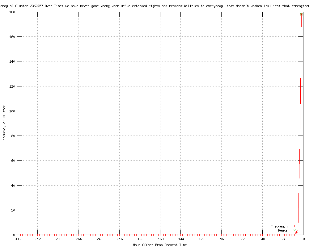 | 12 | we have never gone wrong when we've extended rights and responsibilities to everybody. that doesn't weaken families; that strengthens families Urls http://nypost.com/p/news/national/gay_old_time_for_obama_in_big_apple_YR4DEg5pkeWAed3wogN2oO?utm_medium=rss&utm_content=National http://queerplanet.net/2012/05/15/gay-old-time-for-obama-in-big-apple/ http://startribune.com/politics/151465495.html http://chicagotribune.com/news/nationworld/la-pn-obama-fundraiser-gay-marriage-20120514,0,4971519.story?track=rss http://latimes.com/news/politics/la-pn-obama-fundraiser-gay-marriage-20120514,0,3295208.story?track=rss http://q13fox.com/news/nationworld/la-pn-obama-fundraiser-gay-marriage-20120514,0,5467096.story http://ky3.com/la-pn-obama-fundraiser-gay-marriage-20120514,0,4794514.story http://wdbj7.com/la-pn-obama-fundraiser-gay-marriage-20120514,0,2577822.story http://ktuu.com/la-pn-obama-fundraiser-gay-marriage-20120514,0,7089461.story http://q13fox.com/news/politics/la-pn-obama-fundraiser-gay-marriage-20120514,0,5879952.story http://wgnradio.com/news/politics/la-pn-obama-fundraiser-gay-marriage-20120514,0,1848798.story http://freerepublic.com/focus/f-news/2883720/posts |