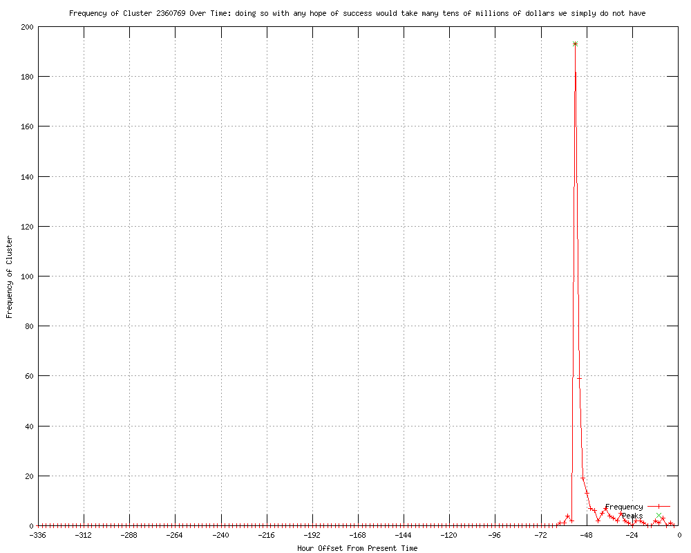| 17 | would take many tens of millions of dollars we simply do not have Urls http://article.wn.com/view/2012/05/14/the_vice_president_as_a_teenager_a_lesson_la_8216saturday_ni/ http://thecaucus.blogs.nytimes.com/2012/05/14/paul-ends-active-campaigning-for-presidency/ http://vosizneias.com/106289/2012/05/14/texas-ron-paul-suspending-his-campaign/ http://thecaucus.blogs.nytimes.com/2012/05/14/paul-ends-active-campaigning-for-presidency/?partner=rss&emc=rss http://hispanicbusiness.com/2012/5/14/ron_paul_ends_presidential_campaigning.htm http://americaisconservative.blogspot.com/2012/05/breaking-news-ron-paul-to-stop-actively.html http://feeds.nytimes.com/click.phdo?i=5933a0c06e4be19b77a55b37b51dcc73 http://newmediablog.com/2012/05/paul-ends-active-campaigning-for-presidency/ http://mercurynews.com/presidentelect/ci_20623398/paul-ending-campaign-call-faithful?source=rss http://lifesitenews.com/news/ron-paul-is-out-of-the-race-not-exactly http://twincities.com/national/ci_20623871/paul-shifts-interparty-maneuvering?source=rss http://post-gazette.com/stories/news/us/paul-campaign-shifts-state-level-party-conventions-for-delegates-635967/ http://texastribune.org/texas-newspaper/texas-news/brief-top-texas-news-may-15-2012/?utm_source=texastribune.org&utm_medium=rss&utm_campaign=Tribune%20Feed:%20The%20Brief http://telegram.com/article/20120515/DIGESTS/105159906/1052/news01 http://article.wn.com/view/2012/05/15/Martin_Marietta_terminates_exchange_offer/ http://hken.ibtimes.com/articles/341316/20120515/ron-paul-convention-delegates-party-platform-ending.htm http://ibtimes.com/articles/341316/20120515/ron-paul-convention-delegates-party-platform-ending.htm |
