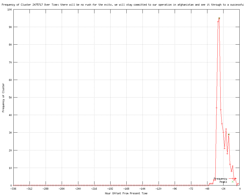 | 18 | there will be no rush for the exits. we will stay committed to our operation in afghanistan and see it through to a successful end Urls http://brecorder.com/top-news/1-front-top-news/58243-nato-chief-vows-no-rush-to-the-exits-in-afghanistan-.html http://nation.com.pk/pakistan-news-newspaper-daily-english-online/international/20-May-2012/nato-chief-vows-no-rush-to-the-exits-in-afghanistan http://uk.news.yahoo.com/nato-chief-vows-no-rush-exits-afghanistan-145543850.html http://ph.news.yahoo.com/nato-chief-vows-no-rush-exits-afghanistan-155543145.html http://focus-fen.net?id=n278472 http://afp.com/en/news/topstories/nato-chief-vows-no-rush-exits-afghanistan http://feeds.bangkokpost.com/c/33101/f/535952/s/1f870273/l/0L0Sbangkokpost0N0Cnews0Casia0C29430A10Cnato0Echief0Evows0Eno0Erush0Eto0Ethe0Eexits0Ein0Eafghanistan/story01.htm http://sg.news.yahoo.com/nato-chief-vows-no-rush-exits-afghanistan-155543145.html http://my.news.yahoo.com/nato-chief-vows-no-rush-exits-afghanistan-155543145.html http://hindustantimes.com/world-news/Americas/NATO-chief-vows-no-rush-to-the-exits-in-Afghanistan/Article1-858795.aspx http://au.news.yahoo.com/a/-/world/13734061/world-behind-strategy-to-exit-afghanistan-obama/ http://au.news.yahoo.com/a/-/business/13734061/world-behind-strategy-to-exit-afghanistan-obama/ http://news.yahoo.com/nato-chief-vows-no-rush-exits-afghanistan-155543483.html http://dailytimes.com.pk/default.asp?page=2012%5c05%5c21%5cstory_21-5-2012_pg7_1 http://thenews.com.pk/article-50128-World-backs-US-Afghan-exit-strategy http://deccanchronicle.com/channels/world/north-america/world-behind-strategy-exit-afghanistan-obama-403 http://spacewar.com/reports/World_behind_strategy_to_exit_Afghanistan_Obama_999.html http://thenews.com.pk/article-50128-World-behind-strategy-to-exit-Afghanistan:-Obama |