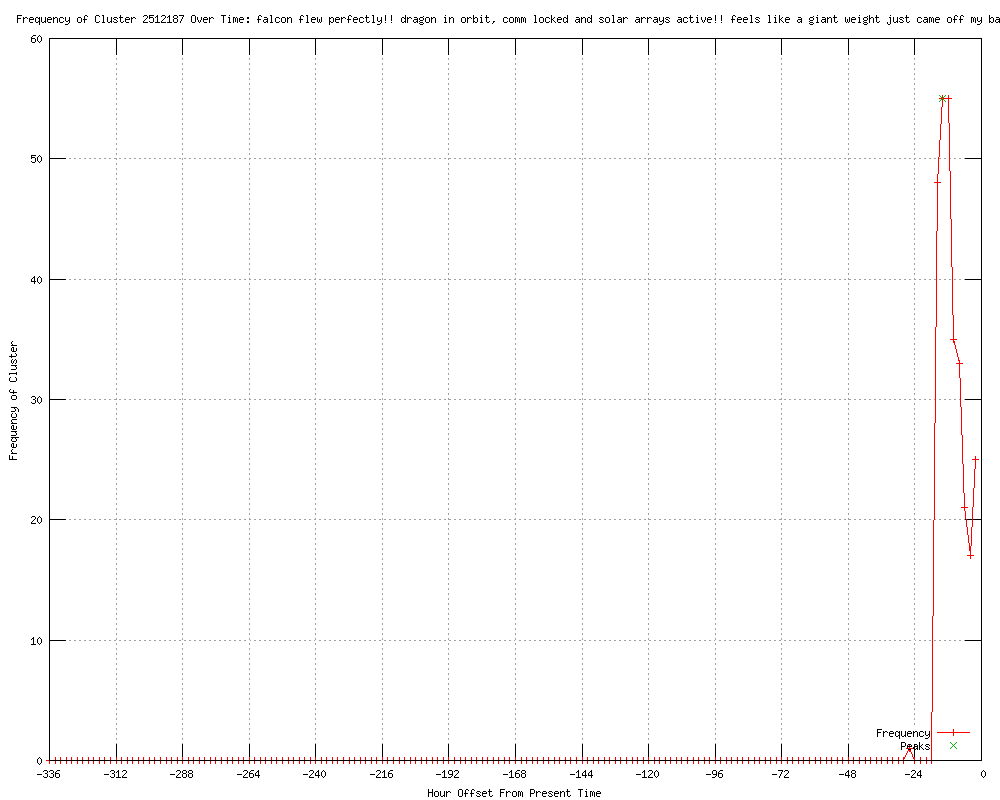 | 11 | dragon in orbit, comm locked and solar arrays active!! feels like a giant weight just came off my back Urls http://carsreview.co.uk/ac/elon-musk%e2%80%99s-spacex-successfully-launches-flacon-9-to-the-international-space-station.html http://iamnotarapperispit.com/2012/05/22/44796 http://livescience.com/20502-spacex-private-capsule-launches-space-station.html http://toccoacatholics.blogspot.com/2012/05/spacex-rocket-begins-milestone-mission.html http://catholic.org/technology/story.php?id=46322&wf=rsscol http://slashgear.com/spacex-dragon-successfully-launches-new-age-of-private-spaceflight-22229304/ http://feeds.slashgear.com/~r/slashgear/~3/jCpLB7Jxk7w/ http://feeds.slashgear.com/%7Er/slashgear/%7E3/jCpLB7Jxk7w/ http://m.minyanville.com/daily-feed/2012/05/22/ashes-of-star-trek-enterprise-crew-member-launched-into-space/ http://statesman.com/news/nation/private-cargo-rocket-launch-a-giant-leap-for-2370718.html?cxtype=rss_news http://lipstickalley.com/f50/private-cargo-rocket-launch-giant-leap-space-entrepreneur-398436-new/ |