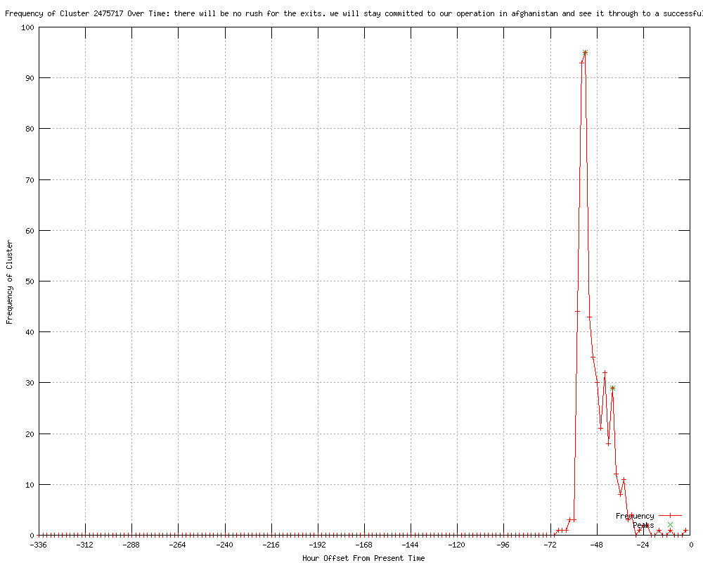 | 18 | there will be no rush for the exits. we will stay committed to our operation in afghanistan and see it through to a successful end Urls http://brecorder.com/top-news/1-front-top-news/58243-nato-chief-vows-no-rush-to-the-exits-in-afghanistan-.html http://nation.com.pk/pakistan-news-newspaper-daily-english-online/international/20-May-2012/nato-chief-vows-no-rush-to-the-exits-in-afghanistan http://uk.news.yahoo.com/nato-chief-vows-no-rush-exits-afghanistan-145543850.html http://ph.news.yahoo.com/nato-chief-vows-no-rush-exits-afghanistan-155543145.html http://focus-fen.net?id=n278472 http://afp.com/en/news/topstories/nato-chief-vows-no-rush-exits-afghanistan http://feeds.bangkokpost.com/c/33101/f/535952/s/1f870273/l/0L0Sbangkokpost0N0Cnews0Casia0C29430A10Cnato0Echief0Evows0Eno0Erush0Eto0Ethe0Eexits0Ein0Eafghanistan/story01.htm http://sg.news.yahoo.com/nato-chief-vows-no-rush-exits-afghanistan-155543145.html http://my.news.yahoo.com/nato-chief-vows-no-rush-exits-afghanistan-155543145.html http://hindustantimes.com/world-news/Americas/NATO-chief-vows-no-rush-to-the-exits-in-Afghanistan/Article1-858795.aspx http://au.news.yahoo.com/a/-/world/13734061/world-behind-strategy-to-exit-afghanistan-obama/ http://au.news.yahoo.com/a/-/business/13734061/world-behind-strategy-to-exit-afghanistan-obama/ http://news.yahoo.com/nato-chief-vows-no-rush-exits-afghanistan-155543483.html http://dailytimes.com.pk/default.asp?page=2012%5c05%5c21%5cstory_21-5-2012_pg7_1 http://thenews.com.pk/article-50128-World-backs-US-Afghan-exit-strategy http://deccanchronicle.com/channels/world/north-america/world-behind-strategy-exit-afghanistan-obama-403 http://spacewar.com/reports/World_behind_strategy_to_exit_Afghanistan_Obama_999.html http://thenews.com.pk/article-50128-World-behind-strategy-to-exit-Afghanistan:-Obama |