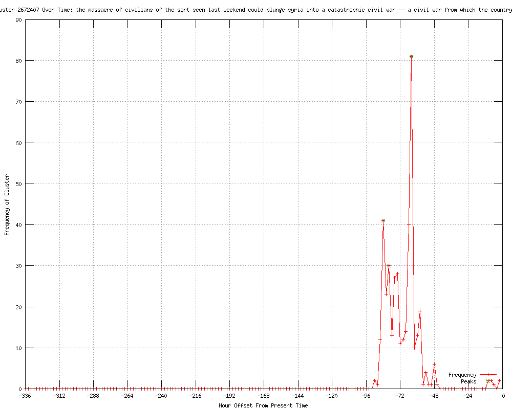 | 18 | the massacre of civilians of the sort seen last weekend could plunge syria into a catastrophic civil war -- a civil war from which the country would never recover Urls http://orianomattei.blogspot.com/2012/05/syria-regime-not-responsible-for-houla.html http://newsday.com/news/world/un-chief-warns-syria-regime-again-shells-houla-1.3752740 http://crescent-news.com/latest%20headlines/2012/05/31/syria-blames-rebels-for-houla-massacre http://independent.ie/world-news/middle-east/us-warns-of-intervention-as-syria-close-to-civil-war-3125194.html http://bloomberg.com/news/2012-06-01/clinton-warns-russia-stance-pushes-syria-into-civil-war.html http://dailyrepublic.com/usworld/syria-blames-rebels-for-houla-massacre/ http://edition.cnn.com/2012/06/01/world/meast/syria-unrest/index.html?eref=edition http://edition.cnn.com/2012/06/01/world/meast/syria-unrest/index.html http://rss.cnn.com/~r/rss/cnn_topstories/~3/PC827HPccS8/index.html http://boston.com/news/world/middleeast/articles/2012/06/01/syrian_rebel_group_says_it_kidnapped_11_lebanese?rss_id=Boston.com+--+Latest+news http://cnn.com/2012/06/01/world/meast/syria-unrest/index.html?eref=rss_topstories http://cnn.com/2012/05/31/world/meast/syria-unrest/index.html?eref=rss_world http://cnn.com/2012/06/01/world/meast/syria-unrest/index.html?hpt=hp_t1 http://news.yahoo.com/syria-blames-rebels-houla-massacre-132000915.html http://cnn.com/2012/06/01/world/meast/syria-unrest/index.html?eref=rss_world http://cnn.com/2012/06/01/world/meast/syria-unrest/index.html?hpt=wo_c1 http://ibtimes.com/articles/347762/20120601/houla-massacre-syria-un.htm http://recordpub.com/news/article/5193209 |