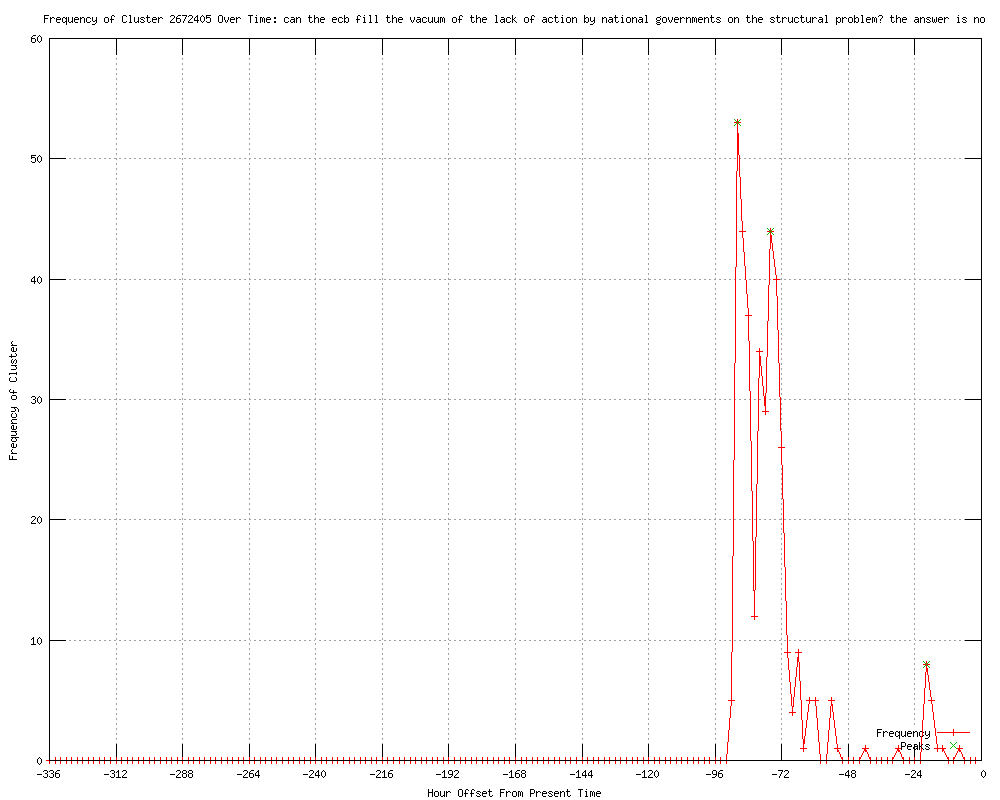 | 17 | fill the vacuum left by the lack of action by national governments on the fiscal front Urls http://telegraph.feedsportal.com/c/32726/f/568300/s/1fe5ecc7/l/0L0Stelegraph0O0Cfinance0Cfinancialcrisis0C930A40A270CEurozone0Eis0Eunsustainable0Ewarns0EMario0EDraghi0Bhtml/story01.htm http://thecomingcrisis.blogspot.com/2012/05/eurozone-is-unsustainable-warns-mario.html http://ciberamerica.blogspot.com/2012/05/eurozone-is-unsustainable-warns-mario.html http://elliottwave.com/r.asp?acn=&tcn=&rcn=RSSX1&url=http://www.elliottwave.com/freeupdates/archives/2012/05/31/EUR/USD-Draghi-Throws-in-the-Towel!-Good-Bye,-Euro!.aspx http://findata.co.nz/News/15840205/EURUSD_Draghi_Throws_in_the_Towel_GoodBye_Euro.htm http://telegraph.feedsportal.com/c/32726/f/568796/s/1fe5bbd8/l/0L0Stelegraph0O0Cfinance0Cfinancialcrisis0C930A40A270CEurozone0Eis0Eunsustainable0Ewarns0EMario0EDraghi0Bhtml/story01.htm http://revolutionradio.org/?p=31078 http://telegraph.feedsportal.com/c/32726/f/568312/s/1fe5f2cb/l/0L0Stelegraph0O0Cfinance0Cfinancialcrisis0C930A40A270CEurozone0Eis0Eunsustainable0Ewarns0EMario0EDraghi0Bhtml/story01.htm http://freerepublic.com/focus/f-news/2890175/posts http://prophecyupdate.blogspot.com/2012/06/big-crisis-big-change.html http://goldsilver.com/new/eurozone-is-unsustainable-warns-mario-draghi/ http://telegraph.co.uk/finance/financialcrisis/9304027/Eurozone-is-unsustainable-warns-Mario-Draghi.html http://infiniteunknown.net/2012/06/01/ecb-chief-mario-draghi-eurozone-is-unsustainable/ http://news-to-use.com/2012/06/new-view-1-june-2012.html http://nzherald.co.nz/world/news/article.cfm?c_id=2&objectid=10810222&ref=rss http://treasuryandrisk.com/2012/06/01/merkel-criticized-for-crisis-strategy?ref=rss http://advisorone.com/2012/06/01/dithering-deepens-spreads-eurozone-crisis?ref=rss |