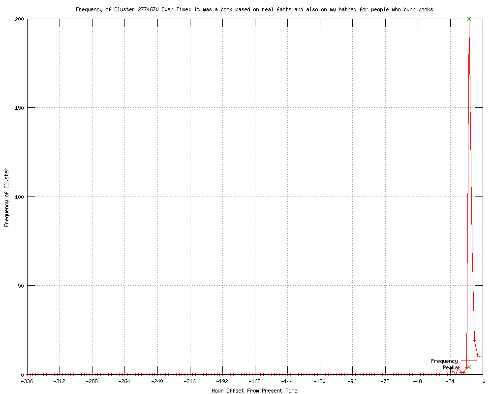 | 6 | hatred for people who burn books Urls http://huffingtonpost.com/rj-eskow/present-tense-future-impe_b_1574581.html http://ourfuture.org/blog-entry/2012062306/future-tense-mourning-political-ray-bradbury-0 http://ourfuture.org/blog-entry/2012062306/future-tense-mourning-political-ray-bradbury http://institute.ourfuture.org/blog-entry/2012062306/future-tense-mourning-political-ray-bradbury-0 http://institute.ourfuture.org/blog-entry/2012062306/future-tense-mourning-political-ray-bradbury http://huffingtonpost.com/rj-eskow/present-tense-future-impe_b_1574581.html?ref=politics |
