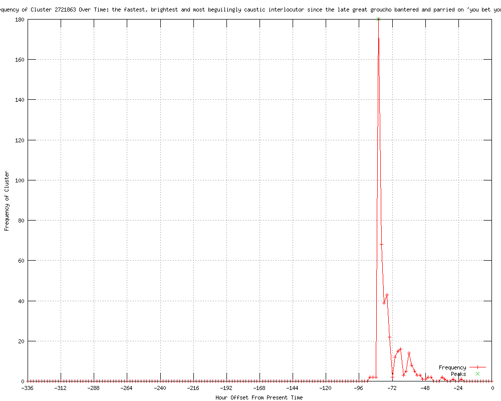 15the fastest, brightest and most beguilingly caustic interlocutor since the late great groucho bantered and parried on 'you bet your life