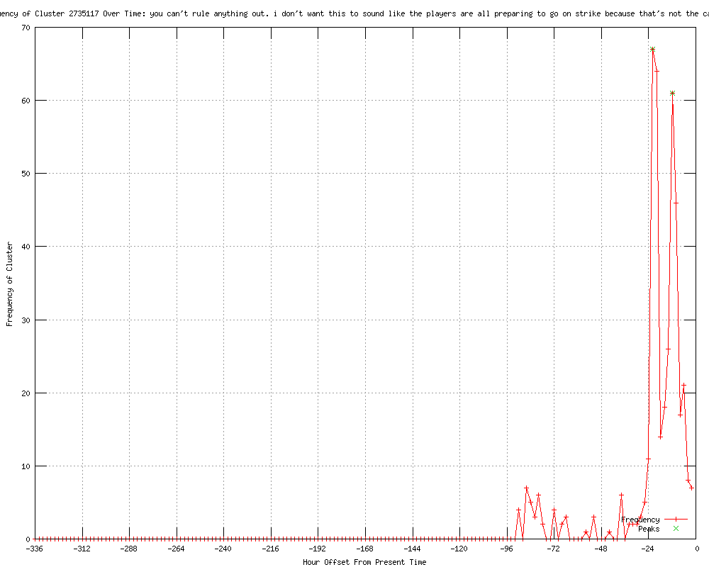 | 17 | you can't rule anything out. i don't want this to sound like the players are all preparing to go on strike because that's not the case at all Urls http://news.smh.com.au/breaking-news-sport/cricket-strike-would-be-last-resort-marsh-20120604-1zs5y.html http://news.theage.com.au/breaking-news-sport/cricket-strike-would-be-last-resort-marsh-20120604-1zs5y.html http://news.brisbanetimes.com.au/breaking-news-sport/cricket-strike-would-be-last-resort-marsh-20120604-1zs5y.html http://au.sports.yahoo.com/cricket/news/article/-/13866204/cricket-strike-would-be-last-resort-marsh/ http://au.sports.yahoo.com/news/article/-/13866204/cricket-strike-would-be-last-resort-marsh/ http://au.sports.yahoo.com/cricket/news/article/-/13866508/cricket-australian-players-fail-to-rule-out-strike-action/ http://abc.net.au/news/2012-06-04/aussie-cricketers-wont-rule-out-pay-strike/4051972 http://timesofindia.feedsportal.com/fy/8at2Etc0aKcwU2V2/story01.htm http://au.sports.yahoo.com/news/article/-/13866508/cricket-australian-players-fail-to-rule-out-strike-action/ http://cricbuzz.com/cricket-news/51419/Players-to-go-on-strike-as-a- http://theroar.com.au/2012/06/05/cricket-strike-last-resort-says-paul-marsh/ http://cricbuzz.com/cricket-news/51423/Australia-cricketers-fail-to-rule-out-strike-action http://centralchronicle.com/australian-players-fail-to-rule-out-strike-action.html http://espnstar.com/home/news/detail/item811062 http://andhranews.net/Sports/2012/ACA-chief-Marsh-players-strike-absolute-5274.htm http://truthdive.com/2012/06/05/ACA-chief-Marsh-says-players-strike-would-be-absolute-last-resort.html http://indiatalkies.com/2012/06/aca-chief-marsh-players-strike-absolute-resort.html |