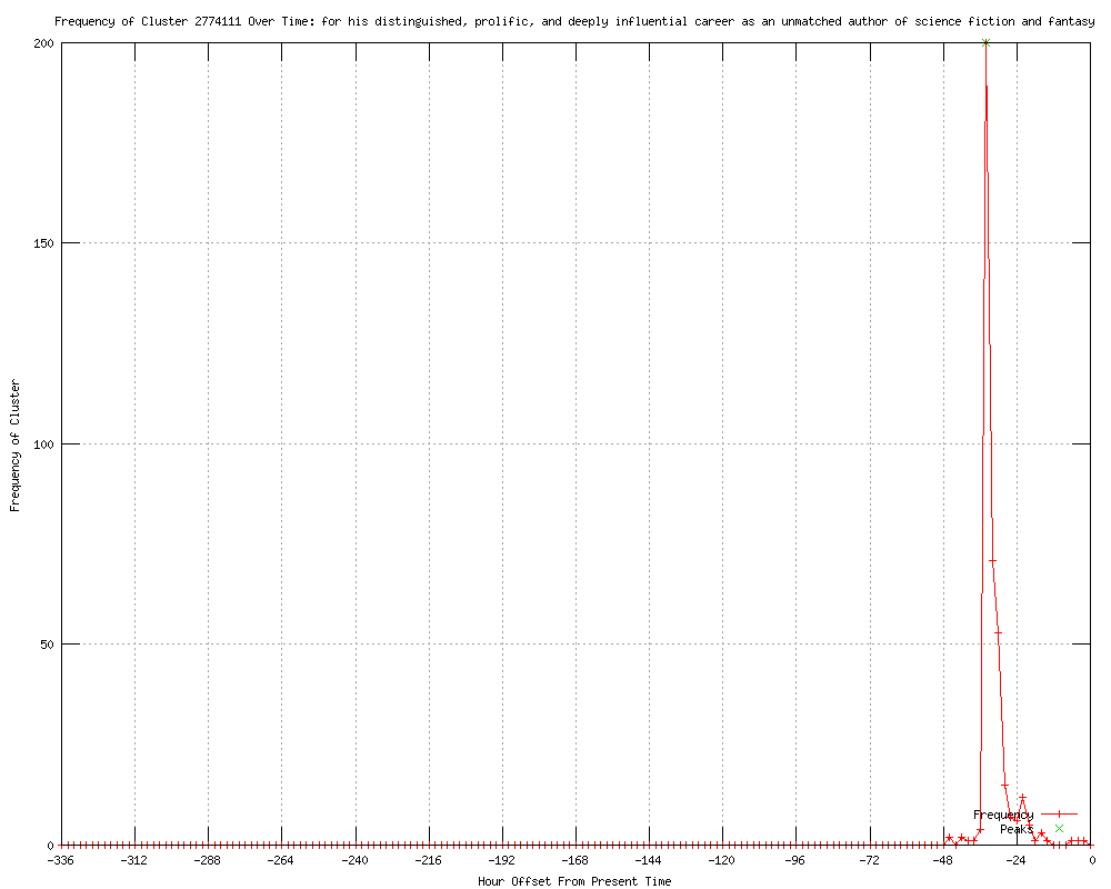 | 344 | for his distinguished, prolific and deeply influential career as an unmatched author of science fiction and fantasy Urls http://cbs12.com/news/top-stories/stories/vid_739.shtml http://cbs12.com/news/top-stories/stories/vid_739.shtml?wap=0 http://nytimes.com/2012/06/07/books/ray-bradbury-popularizer-of-science-fiction-dies-at-91.html?partner=rss&emc=rss http://tillagearts.blogspot.com/2012/06/ray-bradbury-master-of-science-fiction.html http://kurzweilai.net/ray-bradbury-sci-fi-author-of-fahrenheit-451-martian-chronicles-dies-at-91 http://wvrblog.blogspot.com/2012/06/bradbury-chronicles.html http://frugal-cafe.com/public_html/frugal-blog/frugal-cafe-blogzone/2012/06/06/r-i-p-legendary-sci-fi-author-of-fahrenheit-451-the-martian-chronicles-ray-bradbury-has-died-at-age-91-video/ http://extragoodshit.phlap.net/2012/06/ray-bradbury-master-of-science-fiction-dies-at-91/ http://nytimes.com/2012/06/07/books/ray-bradbury-popularizer-of-science-fiction-dies-at-91.html#commentsContainer?partner=rss&emc=rss http://dallasnews.com/incoming/20120606-science-fiction-master-ray-bradbury-dies-at-91.ece http://objectivistliving.com/forums/index.php?showtopic=12189 http://joyhog.com/2012/06/06/ray-bradbury-1920-2012/ http://culturemob.com/fahrenheit-451-author-ray-bradbury-passes-away-aged-91 http://nytimes.com/2012/06/07/books/ray-bradbury-popularizer-of-science-fiction-dies-at-91.html?_r=1&smid=tw-nytimes&seid=auto http://twincities.com/national/ci_20800158/ray-bradbury-author-fahrenheit-451-dies-at-91?source=rss http://mysanantonio.com/news/article/Legendary-novelist-took-sci-fi-to-new-level-3615311.php http://womanrebel.blogspot.com/2012/06/ray-bradbury1920-2012.html http://abc15.com/dpp/news/national/ray-bradbury-author-of-fahrenheit-451-dies http://siliconvalley.com/latest-headlines/ci_20794791/martian-chronicles-author-ray-bradbury-dies-at-age http://hutchnews.com/Todaystop/BC-US--Obit-Bradbury-5th-Ld-Writethru-20120606-16-02-04 http://wral.com/entertainment/story/11176789/ http://indystar.com/article/20120606/ENTERTAINMENT/120606021 http://denverpost.com/obituaries/ci_20794779/ray-bradbury-dies-california?source=rss http://hosted.ap.org/dynamic/stories/U/US_OBIT_BRADBURY?SITE=TXDAM&SECTION=HOME&TEMPLATE=DEFAULT http://kansascity.com/2012/06/06/3644926/ray-bradbury-dies-in-california.html#storylink=rss http://newsobserver.com/2012/06/06/2116765/ray-bradbury-dies-in-california.html#storylink=rss http://newstalkradiowhio.com/news/ap/ray-bradbury-dies-in-california/nPM6W/ http://wmbfnews.com/story/18716977/ray-bradbury-dies-in-california http://brownsvilleherald.com/articles/angeles-141079-author-bradbury.html http://commercialappeal.com/news/2012/jun/06/ray-bradbury-author-of-fahrenheit-451-dies/?partner=RSS http://timesfreepress.com/news/2012/jun/06/ray-bradbury-author-fahrenheit-451-dies/ http://news-sentinel.com/apps/pbcs.dll/article?AID=/20120606/ENT/120609757/1009 http://news-sentinel.com/apps/pbcs.dll/article?AID=/20120606/ENT/120609757 http://abclocal.go.com/wabc/story?section=news&id=8691062&rss=rss-wabc-article-8691062 http://abclocal.go.com/kgo/story?section=news/entertainment&id=8691100&rss=rss-kgo-article-8691100 http://fox11az.com/story/18716977/ray-bradbury-author-of-fahrenheit-451-dies http://thedenverchannel.com/news/31162835/detail.html http://theolympian.com/2012/06/06/2131026/ray-bradbury-dies-in-california.html http://buffalonews.com/wire-feeds/24-hour-national-news/article890142.ece http://wbal.com/article/ap?articleurl=http%3a%2f%2fhosted.ap.org%2fdynamic%2fstories%2fU%2fUS_OBIT_BRADBURY%3fSITE%3dWBAL%26SECTION%3dHOME%26TEMPLATE%3dDEFAULT http://idahostatesman.com/2012/06/06/2144932/ray-bradbury-dies-in-california.html#storylink=rss http://pbpulse.com/arts-and-culture/2012/06/06/ray-bradbury-author-of-%e2%80%98fahrenheit-451%e2%80%99-dies/ http://daytonscw.com/dpps/entertainment/books/author-ray-bradbury-dies-et12-jgr_4197917 http://foxprovidence.com/dpps/entertainment/books/author-ray-bradbury-dies-et12-jgr_4197917 http://kold.com/story/18716977/ray-bradbury-author-of-fahrenheit-451-dies http://phys.org/news258198734.html http://thenewstribune.com/2012/06/06/2171169/ray-bradbury-author-of-fahrenheit.html?storylink=rss http://entertainment.msn.com/news/article.aspx?news=734159&affid=100055 http://wten.com/story/18716977/ray-bradbury-author-of-fahrenheit-451-dies http://newsvine.com/_news/2012/06/06/12085912-ray-bradbury-dies-in-california http://.newsadvance.com/news/2012/jun/06/ray-bradbury-author-fahrenheit-451-dies-ar-1970108/ http://cw56.com/news/articles/entertainment/12007668988671/ http://goerie.com/apps/pbcs.dll/article?AID=/20120606/APN/1206060766 http://wmal.com/Article.asp?id=2470308 http://.godanriver.com/news/2012/jun/06/ray-bradbury-author-fahrenheit-451-dies-ar-1970108/ http://usatoday.com/life/books/story/2012-06-06/ray-bradbury-dies/55417888/1?csp=34life http://greenvilleonline.com/viewart/20120606/NEWS/306060043/Ray-Bradbury-author-Fahrenheit-451-dies?odyssey=tab|topnews|text|FRONTPAGE http://winknews.com/National-World/2012-06-06/Ray-Bradbury-author-of-Fahrenheit-451-dies http://twincities.com/entertainment/ci_20794779/ray-bradbury-dies-california?source=rss http://katu.com/news/national/Ray-Bradbury-dies-in-California-157484485.html http://argusleader.com/article/20120606/UPDATES/120606008/Ray-Bradbury-author-Fahrenheit-451-dies?odyssey=tab|topnews|text|Home http://shreveporttimes.com/article/20120606/NEWS/120606009/Ray-Bradbury-author-Fahrenheit-451-dies?odyssey=tab|topnews|text|FRONTPAGE http://shreveporttimes.com/article/20120606/NEWS/120606009/Ray-Bradbury-author-Fahrenheit-451-dies?odyssey=tab|topnews|img|FRONTPAGE http://bradenton.com/2012/06/06/4066993/ray-bradbury-dies-in-california.html#storylink=rss http://cleveland.com/entertainment/index.ssf/2012/06/ray_bradbury_fahrenheit_451_au.html http://wtol.com/story/18716977/ray-bradbury-author-of-fahrenheit-451-dies http://wlbt.com/story/18716977/ray-bradbury-author-of-fahrenheit-451-dies http://mydes