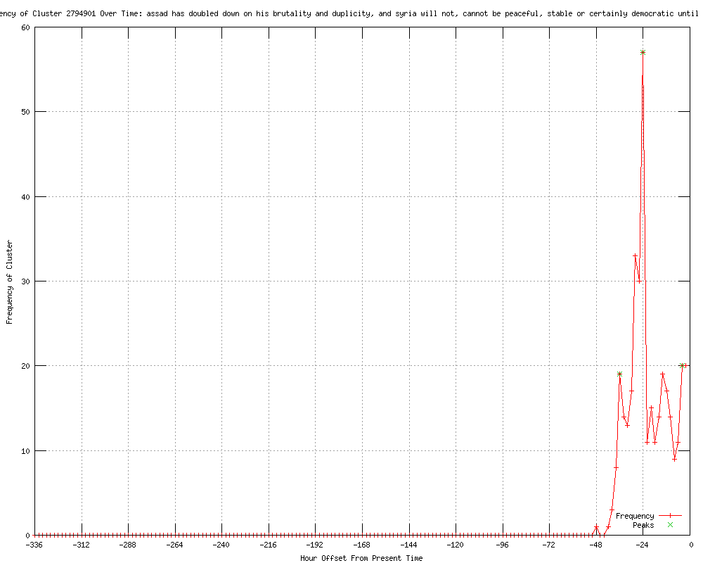 | 127 | assad has doubled down on his brutality and duplicity, and syria will not, cannot be peaceful, stable or certainly democratic until assad goes Urls http://.timesdispatch.com/news/2012/jun/07/2/activists-say-dozens-dead-new-syria-massacre-ar-1972577/ http://wric.com/story/18724481/activists-dozens-dead-in-new-syria-massacre http://guardian.co.uk/world/feedarticle/10277780 http://kcautv.com/story/18724481/activists-dozens-dead-in-new-syria-massacre http://caller.com/news/2012/jun/07/un-syria-blocks-monitors-site-new-killings/ http://.timesdispatch.com/news/2012/jun/07/3/activists-say-dozens-dead-new-syria-massacre-ar-1972577/ http://newstalkradiowhio.com/ap/ap/international/uk-pm-urges-concerted-action-on-syria/nPNdT/ http://da.feedsportal.com/c/33039/f/555218/s/3f6bdf2f/l/0Ltimesofindia0Bindiatimes0N0Cworld0Cmiddle0Eeast0CSyria0Eblocks0EUN0Eobservers0Efrom0Emass0Ekilling0Esite0Carticleshow0C1390A50A250Bcms/ia1.htm http://timesofindia.indiatimes.com/world/middle-east/Syria-blocks-UN-observers-from-mass-killing-site/articleshow/13905025.cms http://timesofindia.feedsportal.com/fy/8at2Eur0aSucG2WE/story01.htm http://timesofindia.feedsportal.com/fy/8at2EtZ0aT7Nh2WG/story01.htm http://mysanantonio.com/news/article/UN-monitors-shot-at-trying-to-reach-massacre-site-3615497.php http://ajc.com/news/nation-world/un-monitors-shot-at-1453779.html?cxtype=rss_news_82109 http://mail.com/news/world/1342686-un-monitors-shot-trying-to-reach-massacre-site.html http://news.yahoo.com/un-monitors-shot-trying-reach-massacre-163433520.html http://cbc.ca/news/politics/story/2012/06/07/syria-massacre-clinton.html?cmp=rss http://newstimes.com/news/article/UN-monitors-shot-at-trying-to-reach-massacre-site-3615497.php http://seattlepi.com/news/article/UN-monitors-shot-at-trying-to-reach-massacre-site-3615497.php http://theglobeandmail.com/news/world/un-monitors-come-under-fire-while-heading-to-mass-killing-site/article4238107/?cmpid=rss1 http://newstalk650.com/content/un-monitors-shot-trying-reach-massacre-site http://ckom.com/content/un-monitors-shot-trying-reach-massacre-site http://cjme.com/content/un-monitors-shot-trying-reach-massacre-site http://mercurynews.com/nation-world/ci_20804895/u-n-monitors-syria-shot-at-while-trying?source=rss http://fortmilltimes.com/2012/06/07/2041748/un-monitors-shot-at-on-way-to.html http://seattlepi.com/news/article/UN-monitors-shot-at-on-way-to-Syrian-massacre-site-3615497.php http://news.yahoo.com/un-monitors-shot-way-syrian-massacre-184121602.html http://stuff.co.nz/world/middle-east/7057256/UN-monitors-shot-at-trying-to-reach-massacre-site http://newstalk650.com/content/un-monitors-shot-way-syrian-massacre-site http://ckom.com/content/un-monitors-shot-way-syrian-massacre-site http://dispatch.com/content/stories/national_world/2012/06/07/un-monitors-shot-at-on-way-to-massacre-site.html http://mail.com/news/world/1342686-un-monitors-shot-way-to-syrian-massacre-site.html http://enquirerherald.com/2012/06/07/1932535/un-monitors-shot-at-on-way-to.html http://cjme.com/content/un-monitors-shot-way-syrian-massacre-site http://mysanantonio.com/news/article/UN-monitors-shot-at-on-way-to-Syrian-massacre-site-3615497.php http://stuff.co.nz/timaru-herald/world/7057256/UN-monitors-shot-at-trying-to-reach-massacre-site http://globalnews.ca/Canada/un+chief+says+monitors+shot+at+trying+to+get+to+scene+of+latest+syrian+mass+killing/6442656519/story.html http://newstimes.com/news/article/UN-monitors-shot-at-on-way-to-Syrian-massacre-site-3615497.php http://bradenton.com/2012/06/07/4068715/un-monitors-shot-at-on-way-to.html#storylink=rss http://justthenews.info/latest-news/un-observers-in-syria-shot-at-ban-ki-moon-says http://justthenews.info/latest-news/syria-shooting-at-un-observers-ban-ki-moon-says http://justthenews.info/latest-news/un-urged-to-get-tougher-on-syrian-regime http://justthenews.info/latest-news/unarmed-un-monitors-shot-at-in-syria http://news.yahoo.com/un-monitors-shot-near-syrian-killings-200416189.html http://seattlepi.com/news/article/UN-monitors-shot-at-near-site-of-Syrian-killings-3615497.php http://newstimes.com/news/article/UN-monitors-shot-at-near-site-of-Syrian-killings-3615497.php http://newstalk650.com/content/un-monitors-shot-near-site-syrian-killings http://ckom.com/content/un-monitors-shot-near-site-syrian-killings http://cjme.com/content/un-monitors-shot-near-site-syrian-killings http://mysanantonio.com/news/article/UN-monitors-shot-at-near-site-of-Syrian-killings-3615497.php http://guardian.co.uk/world/feedarticle/10278319 http://dailycaller.com/2012/06/07/uk-pm-urges-concerted-action-on-syria/ http://newstalk650.com/content/un-monitors-shot-near-site-syrian-killings-0 http://dailytribune.com/article/20120607/NEWS05/120609644/u-n-monitors-shot-at-near-site-of-syrian-killings http://spokesman.com/stories/2012/jun/07/un-observers-attacked-in-syria/ http://svherald.com/associatedpress/268533 http://macombdaily.com/article/20120607/NEWS05/120609594/u-n-monitors-shot-at-near-site-of-syrian-killings http://news-sentinel.com/apps/pbcs.dll/article?AID=/20120607/NEWS/120609673 http://news-sentinel.com/apps/pbcs.dll/article?AID=/20120607/NEWS/120609673/1006 http://wvgazette.com/rssFeeds/201206070128 http://denverpost.com/nationworld/ci_20802238/activists-dozens-dead-new-syria-massacre?source=rss http://denverpost.com/breakingnews/ci_20802238/activists-dozens-dead-new-syria-massacre?source=rss http://komonews.com/news/local/UN-monitors-shot-at-near-site-of-Syrian-killings--157950135.html http://krgv.com/news/un-monitors-shot-at-near-site-of-syrian-killings http://guardian.co.uk/world/feedarticle/10278505 http://kcby.com/news/national/UN-monitors-shot-at-near-site-of-Syrian-killings--157950135.html http://komonews.com/news/national/UN-monitors-shot-at-near-site-of-Syrian-killings--157950135.html http://nola.com/politics/index.ssf/2012/06/un_monitors_in_syria_are_shot.html http://newstalkradiowhio.com/ap/ap/social-issues/uk-pm-urges-concerted-action-on-syria/nPNdT/ htt