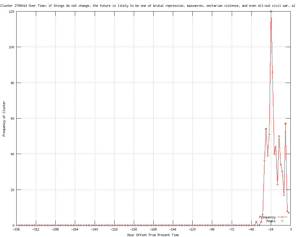 | 256 | if things do not change, the future is likely to be one of brutal repression, massacres, sectarian violence, and even all-out civil war Urls http://castanet.net/edition/news-story-76271-5-.htm#76271 http://castanet.net/edition/news-story-76274-5-.htm#76274 http://mysanantonio.com/news/article/UN-monitors-shot-at-trying-to-reach-massacre-site-3615497.php http://ajc.com/news/nation-world/un-monitors-shot-at-1453779.html?cxtype=rss_news_82109 http://mail.com/news/world/1342686-un-monitors-shot-trying-to-reach-massacre-site.html http://news.yahoo.com/un-monitors-shot-trying-reach-massacre-163433520.html http://newstimes.com/news/article/UN-monitors-shot-at-trying-to-reach-massacre-site-3615497.php http://seattlepi.com/news/article/UN-monitors-shot-at-trying-to-reach-massacre-site-3615497.php http://theglobeandmail.com/news/world/un-monitors-come-under-fire-while-heading-to-mass-killing-site/article4238107/?cmpid=rss1 http://newstalk650.com/content/un-monitors-shot-trying-reach-massacre-site http://ckom.com/content/un-monitors-shot-trying-reach-massacre-site http://cjme.com/content/un-monitors-shot-trying-reach-massacre-site http://mercurynews.com/nation-world/ci_20804895/u-n-monitors-syria-shot-at-while-trying?source=rss http://fortmilltimes.com/2012/06/07/2041748/un-monitors-shot-at-on-way-to.html http://seattlepi.com/news/article/UN-monitors-shot-at-on-way-to-Syrian-massacre-site-3615497.php http://news.yahoo.com/un-monitors-shot-way-syrian-massacre-184121602.html http://stuff.co.nz/world/middle-east/7057256/UN-monitors-shot-at-trying-to-reach-massacre-site http://newstalk650.com/content/un-monitors-shot-way-syrian-massacre-site http://ckom.com/content/un-monitors-shot-way-syrian-massacre-site http://dispatch.com/content/stories/national_world/2012/06/07/un-monitors-shot-at-on-way-to-massacre-site.html http://mail.com/news/world/1342686-un-monitors-shot-way-to-syrian-massacre-site.html http://enquirerherald.com/2012/06/07/1932535/un-monitors-shot-at-on-way-to.html http://cjme.com/content/un-monitors-shot-way-syrian-massacre-site http://mysanantonio.com/news/article/UN-monitors-shot-at-on-way-to-Syrian-massacre-site-3615497.php http://stuff.co.nz/timaru-herald/world/7057256/UN-monitors-shot-at-trying-to-reach-massacre-site http://globalnews.ca/Canada/un+chief+says+monitors+shot+at+trying+to+get+to+scene+of+latest+syrian+mass+killing/6442656519/story.html http://newstimes.com/news/article/UN-monitors-shot-at-on-way-to-Syrian-massacre-site-3615497.php http://bradenton.com/2012/06/07/4068715/un-monitors-shot-at-on-way-to.html#storylink=rss http://justthenews.info/latest-news/unarmed-un-monitors-shot-at-in-syria http://news.yahoo.com/un-monitors-shot-near-syrian-killings-200416189.html http://seattlepi.com/news/article/UN-monitors-shot-at-near-site-of-Syrian-killings-3615497.php http://newstimes.com/news/article/UN-monitors-shot-at-near-site-of-Syrian-killings-3615497.php http://newstalk650.com/content/un-monitors-shot-near-site-syrian-killings http://ckom.com/content/un-monitors-shot-near-site-syrian-killings http://cjme.com/content/un-monitors-shot-near-site-syrian-killings http://mysanantonio.com/news/article/UN-monitors-shot-at-near-site-of-Syrian-killings-3615497.php http://guardian.co.uk/world/feedarticle/10278319 http://dailycaller.com/2012/06/07/uk-pm-urges-concerted-action-on-syria/ http://newstalk650.com/content/un-monitors-shot-near-site-syrian-killings-0 http://dailytribune.com/article/20120607/NEWS05/120609644/u-n-monitors-shot-at-near-site-of-syrian-killings http://spokesman.com/stories/2012/jun/07/un-observers-attacked-in-syria/ http://svherald.com/associatedpress/268533 http://macombdaily.com/article/20120607/NEWS05/120609594/u-n-monitors-shot-at-near-site-of-syrian-killings http://news-sentinel.com/apps/pbcs.dll/article?AID=/20120607/NEWS/120609673 http://news-sentinel.com/apps/pbcs.dll/article?AID=/20120607/NEWS/120609673/1006 http://wvgazette.com/rssFeeds/201206070128 http://denverpost.com/nationworld/ci_20802238/activists-dozens-dead-new-syria-massacre?source=rss http://denverpost.com/breakingnews/ci_20802238/activists-dozens-dead-new-syria-massacre?source=rss http://komonews.com/news/local/UN-monitors-shot-at-near-site-of-Syrian-killings--157950135.html http://krgv.com/news/un-monitors-shot-at-near-site-of-syrian-killings http://guardian.co.uk/world/feedarticle/10278505 http://kcby.com/news/national/UN-monitors-shot-at-near-site-of-Syrian-killings--157950135.html http://komonews.com/news/national/UN-monitors-shot-at-near-site-of-Syrian-killings--157950135.html http://nola.com/politics/index.ssf/2012/06/un_monitors_in_syria_are_shot.html http://newstalkradiowhio.com/ap/ap/social-issues/uk-pm-urges-concerted-action-on-syria/nPNdT/ http://guardian.co.uk/world/feedarticle/10278620 http://townhall.com/news/world/2012/06/07/syrian_president_appoints_new_prime_minister http://.wsls.com/news/2012/jun/07/un-monitors-shot-at-near-site-of-syrian-killings-ar-1974145/ http://news-sentinel.com/apps/pbcs.dll/article?AID=/20120607/NEWS/120609673/1006/YOURVOICE_LOCAL http://wsbradio.com/ap/ap/social-issues/uk-pm-urges-concerted-action-on-syria/nPNdT/ http://csmonitor.com/World/Latest-News-Wires/2012/0607/Syria-UN-observers-come-under-attack http://kdwn.com/news/world-news/UN_monitors_shot_at_near_site_of_Syrian_killings http://guardian.co.uk/world/feedarticle/10278825 http://independent.ie/world-news/middle-east/syria-un-observers-come-under-fire-trying-to-reach-site-of-latest-massacre-3132495.html http://findata.co.nz/News/15876814/UN_monitors_fired_on_in_Syria.htm http://news-gazette.com/news/politics-and-government/2012-06-07/un-monitors-shot-near-site-syrian-killings.html http://newsday.com/news/world/un-monitors-under-fire-near-site-of-syrian-killings-1.3768256 http://thejakartapost.com/news/2012/06/08/un-monitors-shot-near-site-syrian-killings.html http://newsday.com/news/world/un-monitors-shot-at-near-site-of-syrian-killings--1.3768953 http://telegraph.feedsportal.com/c/32726