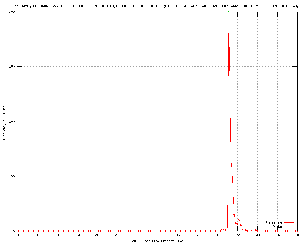 | 344 | for his distinguished, prolific and deeply influential career as an unmatched author of science fiction and fantasy Urls http://cbs12.com/news/top-stories/stories/vid_739.shtml http://cbs12.com/news/top-stories/stories/vid_739.shtml?wap=0 http://nytimes.com/2012/06/07/books/ray-bradbury-popularizer-of-science-fiction-dies-at-91.html?partner=rss&emc=rss http://tillagearts.blogspot.com/2012/06/ray-bradbury-master-of-science-fiction.html http://kurzweilai.net/ray-bradbury-sci-fi-author-of-fahrenheit-451-martian-chronicles-dies-at-91 http://wvrblog.blogspot.com/2012/06/bradbury-chronicles.html http://frugal-cafe.com/public_html/frugal-blog/frugal-cafe-blogzone/2012/06/06/r-i-p-legendary-sci-fi-author-of-fahrenheit-451-the-martian-chronicles-ray-bradbury-has-died-at-age-91-video/ http://extragoodshit.phlap.net/2012/06/ray-bradbury-master-of-science-fiction-dies-at-91/ http://nytimes.com/2012/06/07/books/ray-bradbury-popularizer-of-science-fiction-dies-at-91.html#commentsContainer?partner=rss&emc=rss http://dallasnews.com/incoming/20120606-science-fiction-master-ray-bradbury-dies-at-91.ece http://objectivistliving.com/forums/index.php?showtopic=12189 http://joyhog.com/2012/06/06/ray-bradbury-1920-2012/ http://culturemob.com/fahrenheit-451-author-ray-bradbury-passes-away-aged-91 http://nytimes.com/2012/06/07/books/ray-bradbury-popularizer-of-science-fiction-dies-at-91.html?_r=1&smid=tw-nytimes&seid=auto http://twincities.com/national/ci_20800158/ray-bradbury-author-fahrenheit-451-dies-at-91?source=rss http://mysanantonio.com/news/article/Legendary-novelist-took-sci-fi-to-new-level-3615311.php http://womanrebel.blogspot.com/2012/06/ray-bradbury1920-2012.html http://abc15.com/dpp/news/national/ray-bradbury-author-of-fahrenheit-451-dies http://siliconvalley.com/latest-headlines/ci_20794791/martian-chronicles-author-ray-bradbury-dies-at-age http://hutchnews.com/Todaystop/BC-US--Obit-Bradbury-5th-Ld-Writethru-20120606-16-02-04 http://wral.com/entertainment/story/11176789/ http://indystar.com/article/20120606/ENTERTAINMENT/120606021 http://denverpost.com/obituaries/ci_20794779/ray-bradbury-dies-california?source=rss http://hosted.ap.org/dynamic/stories/U/US_OBIT_BRADBURY?SITE=TXDAM&SECTION=HOME&TEMPLATE=DEFAULT http://kansascity.com/2012/06/06/3644926/ray-bradbury-dies-in-california.html#storylink=rss http://newsobserver.com/2012/06/06/2116765/ray-bradbury-dies-in-california.html#storylink=rss http://newstalkradiowhio.com/news/ap/ray-bradbury-dies-in-california/nPM6W/ http://wmbfnews.com/story/18716977/ray-bradbury-dies-in-california http://brownsvilleherald.com/articles/angeles-141079-author-bradbury.html http://commercialappeal.com/news/2012/jun/06/ray-bradbury-author-of-fahrenheit-451-dies/?partner=RSS http://timesfreepress.com/news/2012/jun/06/ray-bradbury-author-fahrenheit-451-dies/ http://news-sentinel.com/apps/pbcs.dll/article?AID=/20120606/ENT/120609757/1009 http://news-sentinel.com/apps/pbcs.dll/article?AID=/20120606/ENT/120609757 http://abclocal.go.com/wabc/story?section=news&id=8691062&rss=rss-wabc-article-8691062 http://abclocal.go.com/kgo/story?section=news/entertainment&id=8691100&rss=rss-kgo-article-8691100 http://fox11az.com/story/18716977/ray-bradbury-author-of-fahrenheit-451-dies http://thedenverchannel.com/news/31162835/detail.html http://theolympian.com/2012/06/06/2131026/ray-bradbury-dies-in-california.html http://buffalonews.com/wire-feeds/24-hour-national-news/article890142.ece http://wbal.com/article/ap?articleurl=http%3a%2f%2fhosted.ap.org%2fdynamic%2fstories%2fU%2fUS_OBIT_BRADBURY%3fSITE%3dWBAL%26SECTION%3dHOME%26TEMPLATE%3dDEFAULT http://idahostatesman.com/2012/06/06/2144932/ray-bradbury-dies-in-california.html#storylink=rss http://pbpulse.com/arts-and-culture/2012/06/06/ray-bradbury-author-of-%e2%80%98fahrenheit-451%e2%80%99-dies/ http://daytonscw.com/dpps/entertainment/books/author-ray-bradbury-dies-et12-jgr_4197917 http://foxprovidence.com/dpps/entertainment/books/author-ray-bradbury-dies-et12-jgr_4197917 http://kold.com/story/18716977/ray-bradbury-author-of-fahrenheit-451-dies http://phys.org/news258198734.html http://thenewstribune.com/2012/06/06/2171169/ray-bradbury-author-of-fahrenheit.html?storylink=rss http://entertainment.msn.com/news/article.aspx?news=734159&affid=100055 http://wten.com/story/18716977/ray-bradbury-author-of-fahrenheit-451-dies http://newsvine.com/_news/2012/06/06/12085912-ray-bradbury-dies-in-california http://.newsadvance.com/news/2012/jun/06/ray-bradbury-author-fahrenheit-451-dies-ar-1970108/ http://cw56.com/news/articles/entertainment/12007668988671/ http://goerie.com/apps/pbcs.dll/article?AID=/20120606/APN/1206060766 http://wmal.com/Article.asp?id=2470308 http://.godanriver.com/news/2012/jun/06/ray-bradbury-author-fahrenheit-451-dies-ar-1970108/ http://usatoday.com/life/books/story/2012-06-06/ray-bradbury-dies/55417888/1?csp=34life http://greenvilleonline.com/viewart/20120606/NEWS/306060043/Ray-Bradbury-author-Fahrenheit-451-dies?odyssey=tab|topnews|text|FRONTPAGE http://winknews.com/National-World/2012-06-06/Ray-Bradbury-author-of-Fahrenheit-451-dies http://twincities.com/entertainment/ci_20794779/ray-bradbury-dies-california?source=rss http://katu.com/news/national/Ray-Bradbury-dies-in-California-157484485.html http://argusleader.com/article/20120606/UPDATES/120606008/Ray-Bradbury-author-Fahrenheit-451-dies?odyssey=tab|topnews|text|Home http://shreveporttimes.com/article/20120606/NEWS/120606009/Ray-Bradbury-author-Fahrenheit-451-dies?odyssey=tab|topnews|text|FRONTPAGE http://shreveporttimes.com/article/20120606/NEWS/120606009/Ray-Bradbury-author-Fahrenheit-451-dies?odyssey=tab|topnews|img|FRONTPAGE http://bradenton.com/2012/06/06/4066993/ray-bradbury-dies-in-california.html#storylink=rss http://cleveland.com/entertainment/index.ssf/2012/06/ray_bradbury_fahrenheit_451_au.html http://wtol.com/story/18716977/ray-bradbury-author-of-fahrenheit-451-dies http://wlbt.com/story/18716977/ray-bradbury-author-of-fahrenheit-451-dies http://mydes